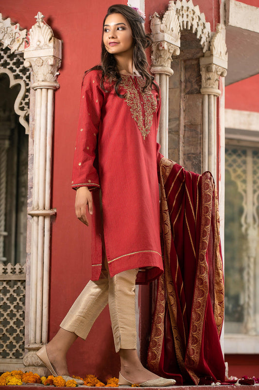 Stitched 2 Piece Cotton Slub shirt & Stipes Jacquard Dupatta