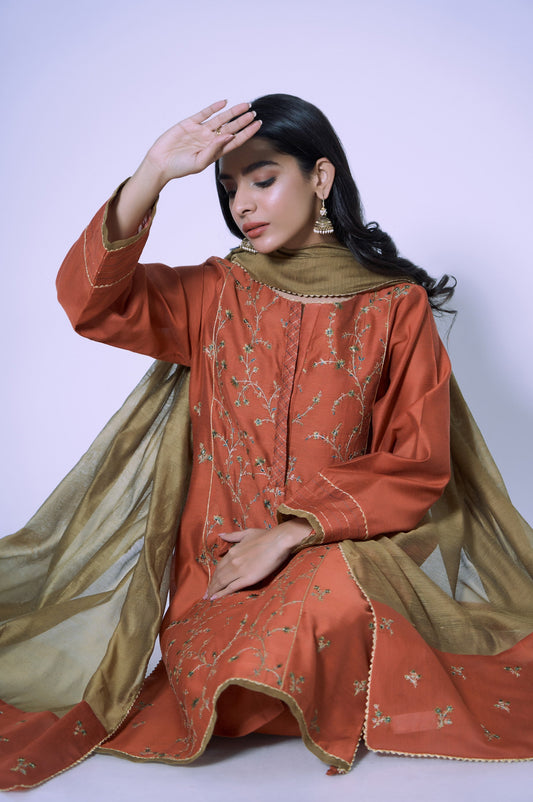 Stitched 3 Piece Cotton Mysuri Embroidered Outfit
