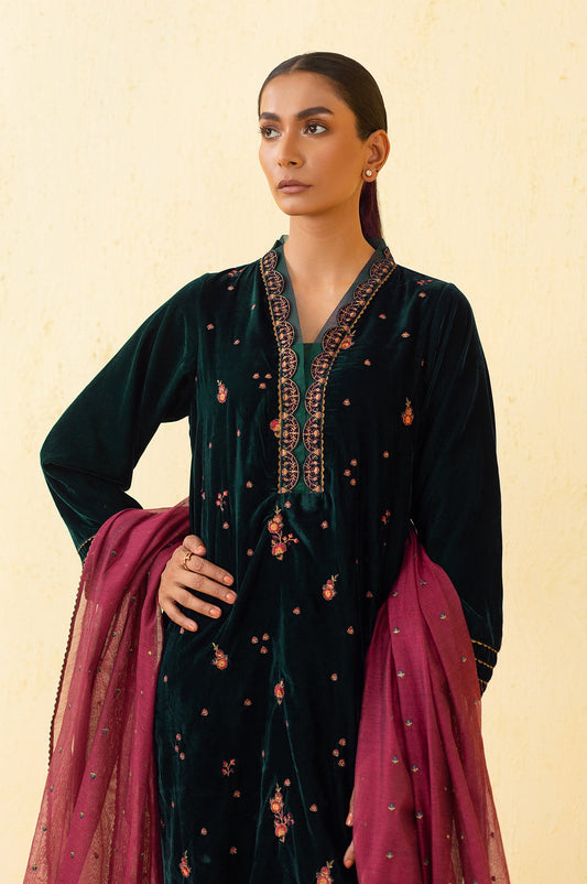 Stitched 3 Piece Embroidered Velvet Suit - Teal Green