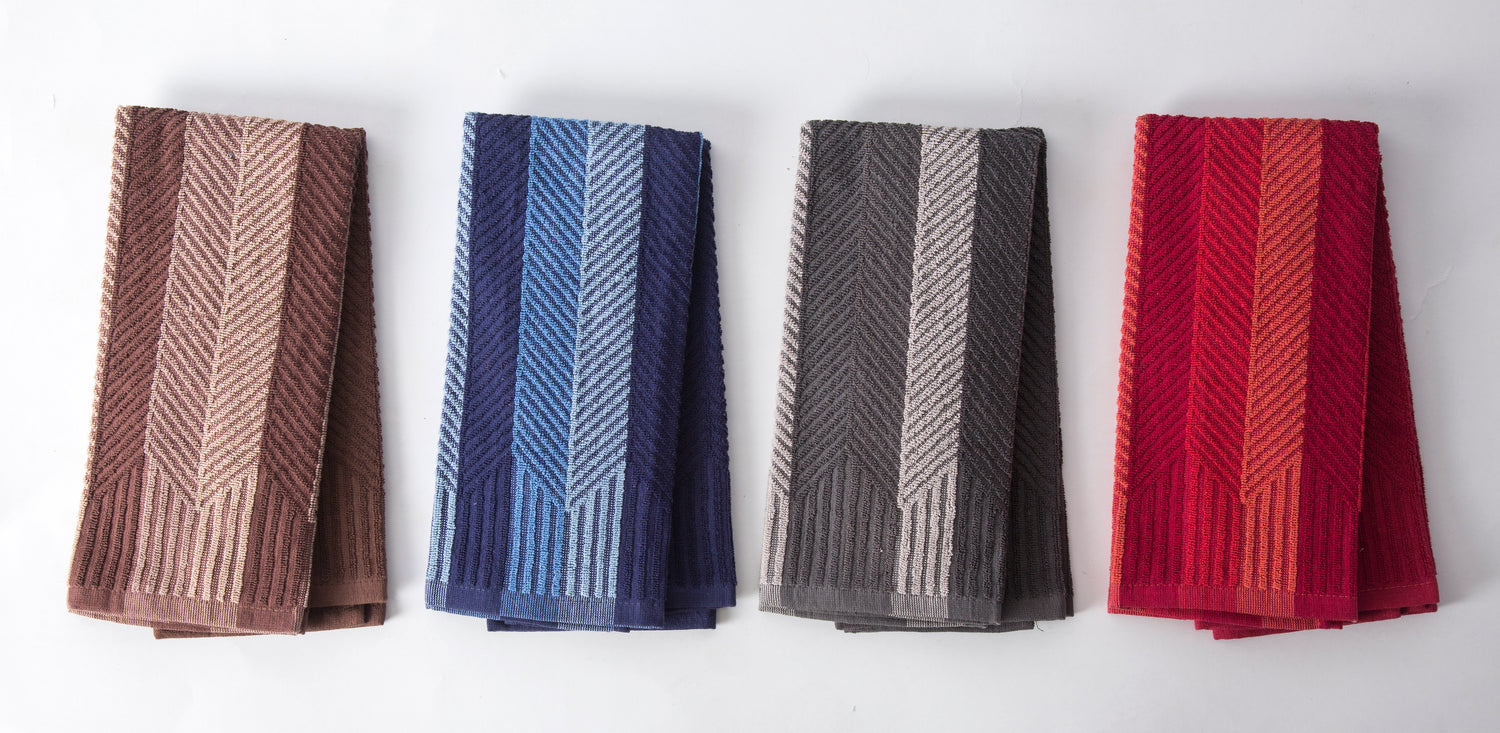 Yarn dyed kitchen towels feature intricately woven patterns or designs created with dyed yarn before weaving, ensuring vibrant colors and long-lasting elegance for everyday kitchen use.