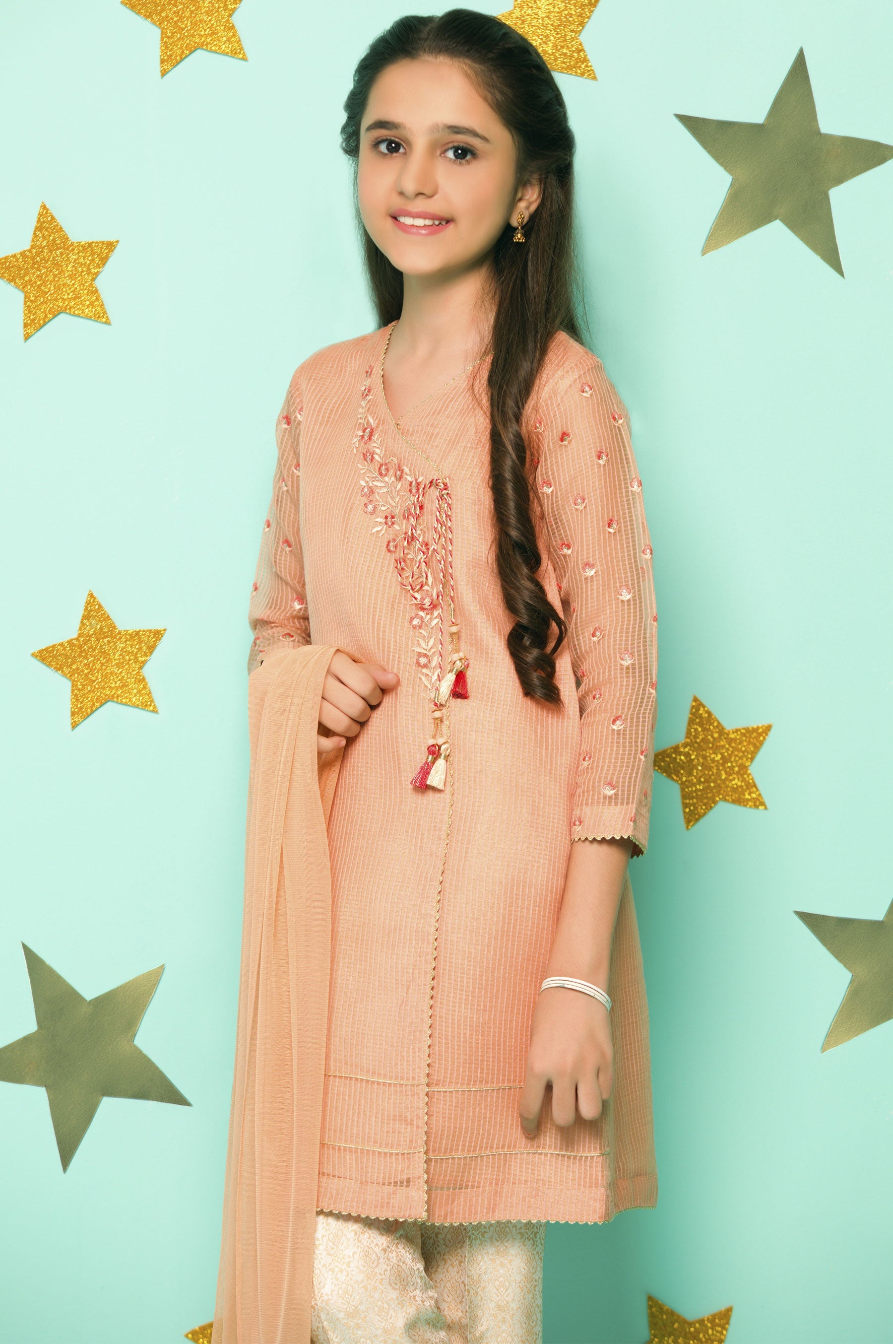 Checkered Organza Angarkha with embroidered neckline, Stylized with Jamawar Straight Pant and Embellished Net Dupatta, for the perfect Festive look.