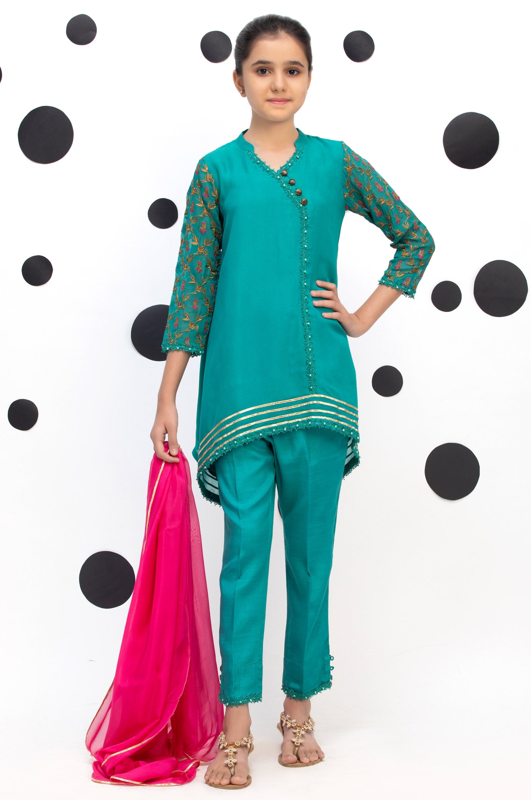 Georgette Top with Embroidered, Raw Silk Bottom, Silk Solid Dupatta, Fabric: Georgette