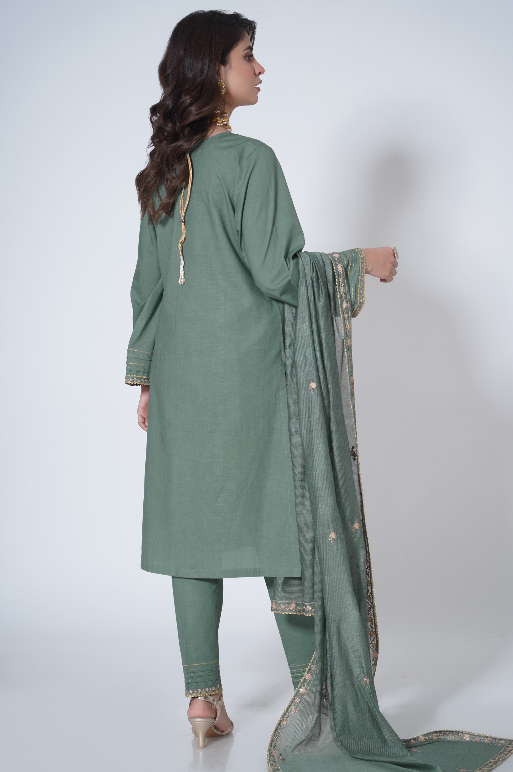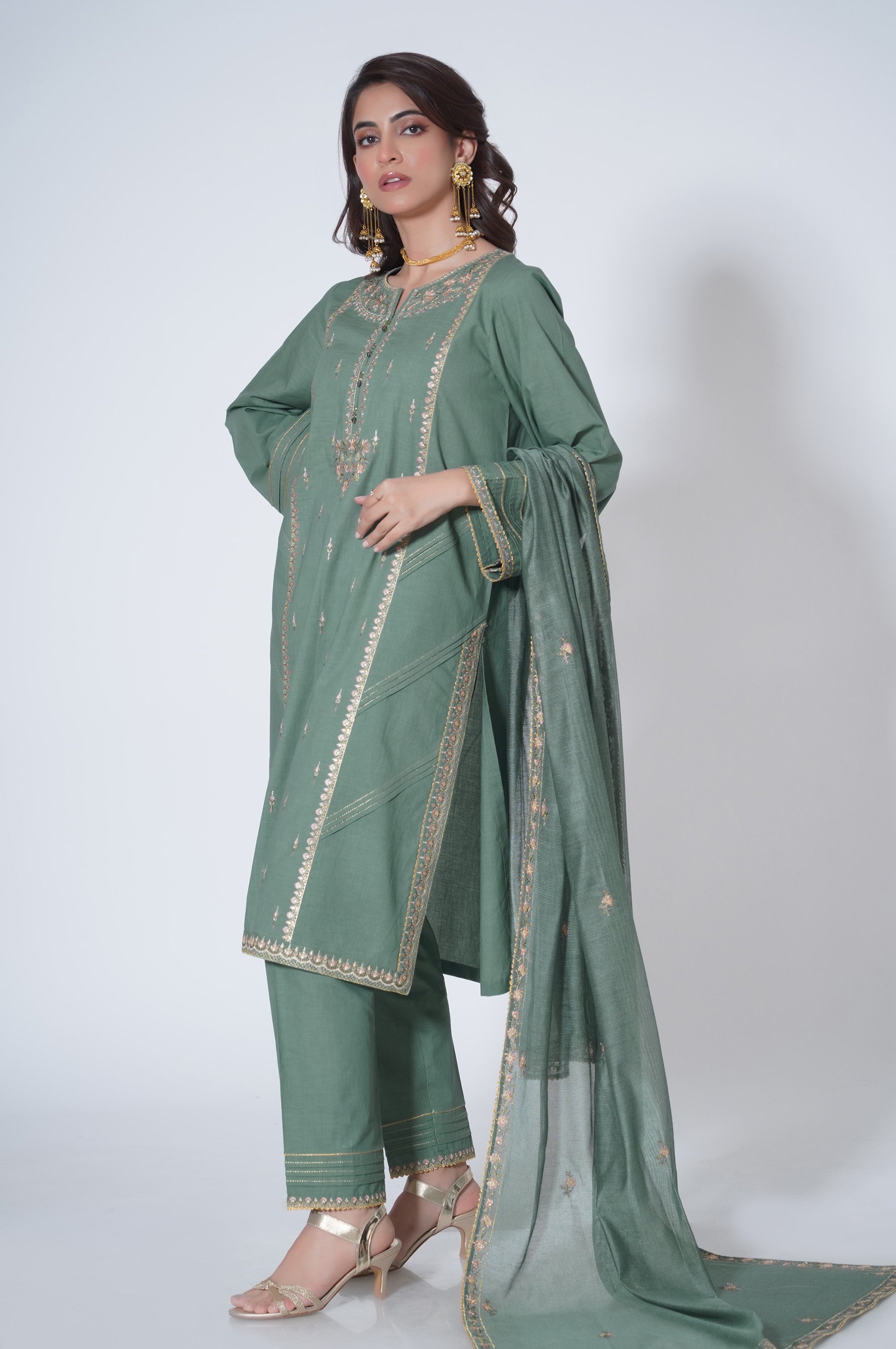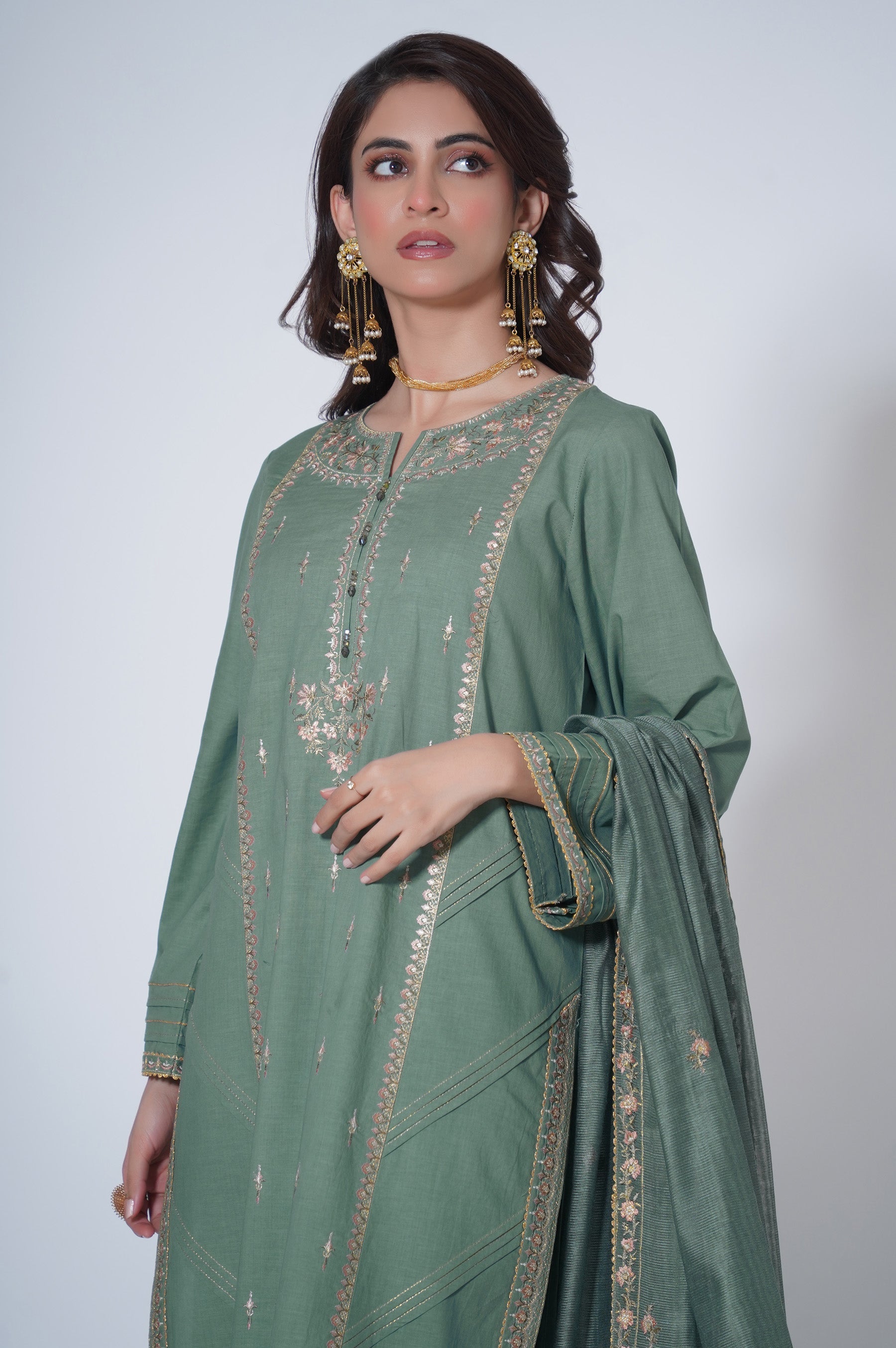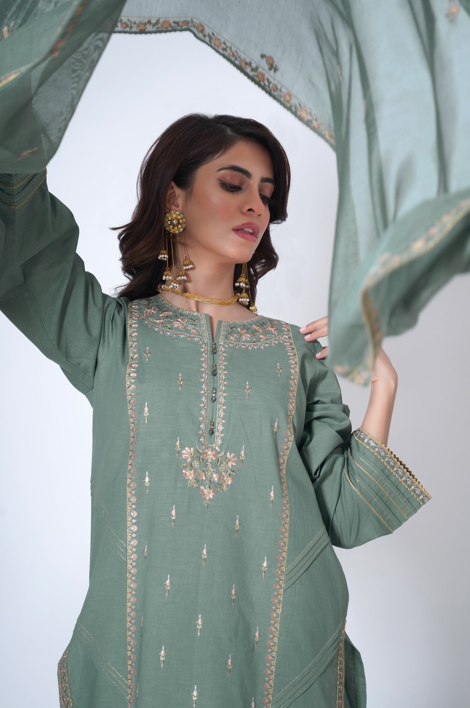 A Glacial Green hued canvas is artfully illustrated with intricately detailed embroidery depicting pastel florals in bloom. The border on the hem etched with detailed embroideries is adding an exquisitely unique dimension to the shirt. Accompanied by the signature Zeen pure Viscose dupatta rendered in colourful floral border all around.Kurta/Shirt Design: