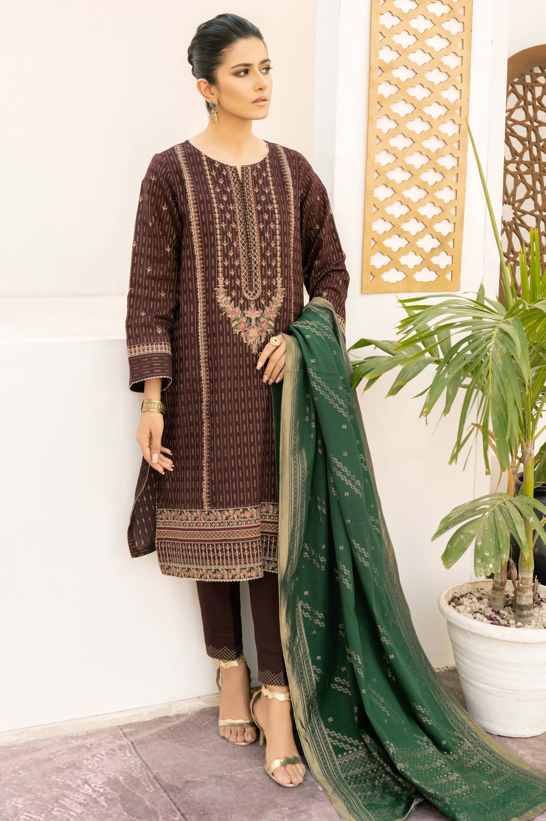 This elegant 3pcs unstitched outfit features a deep brown canvas rendered in exquisite multi coloured embroidery on front and sleeves. The ensemble is paired with contrasting green cotton jacquard dupatta, inspired by vintage rosettes and geometrical patterns.
