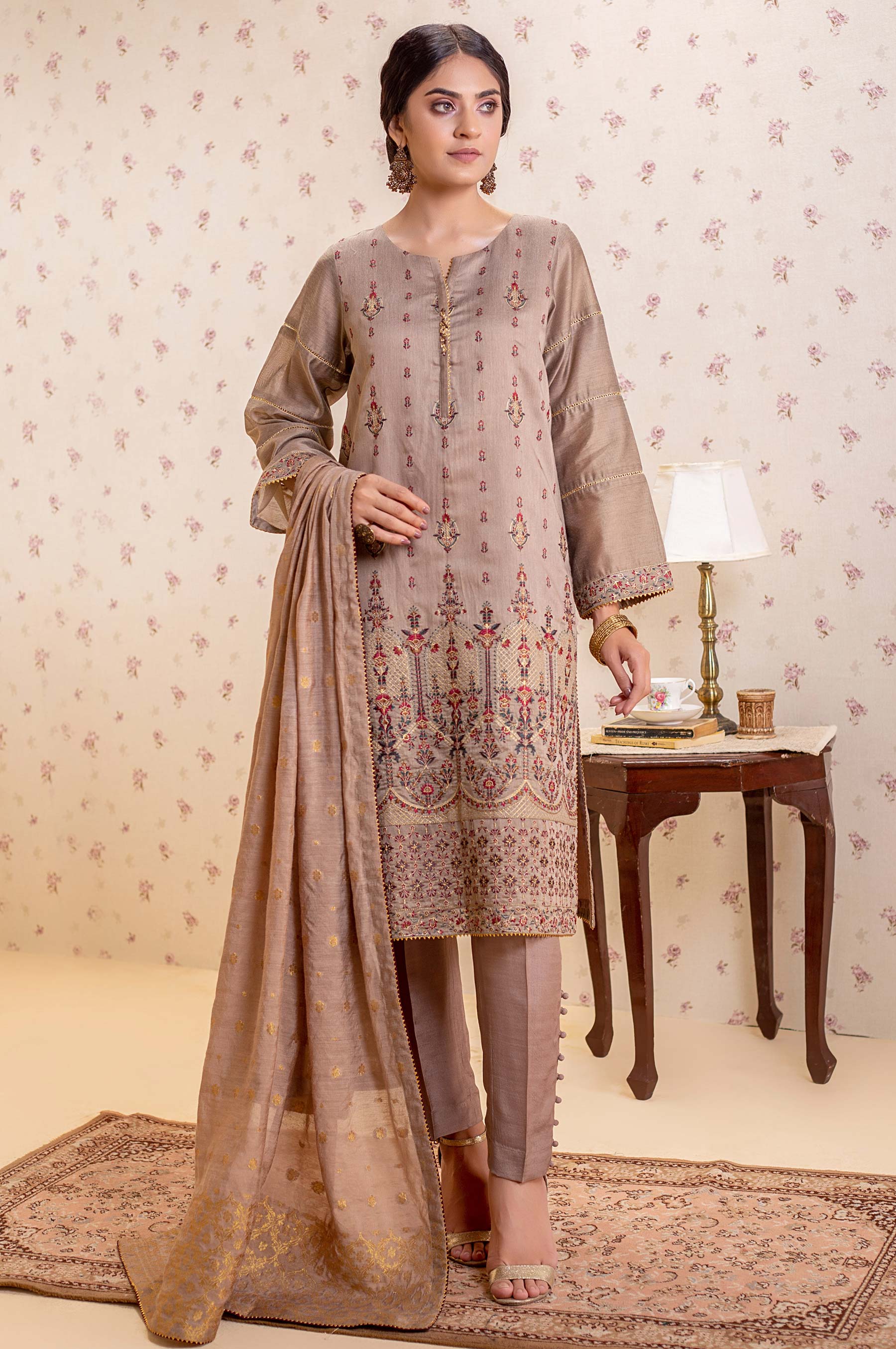 This beautiful 3-pcs unstitched, beige cotton net shirt with intricate traditional floral embroidery is inspired by Mughal art with embroidered daman, all over motif and embroidered lace on sleeves. This outfit is paired with banarsi dupatta for regal look.
