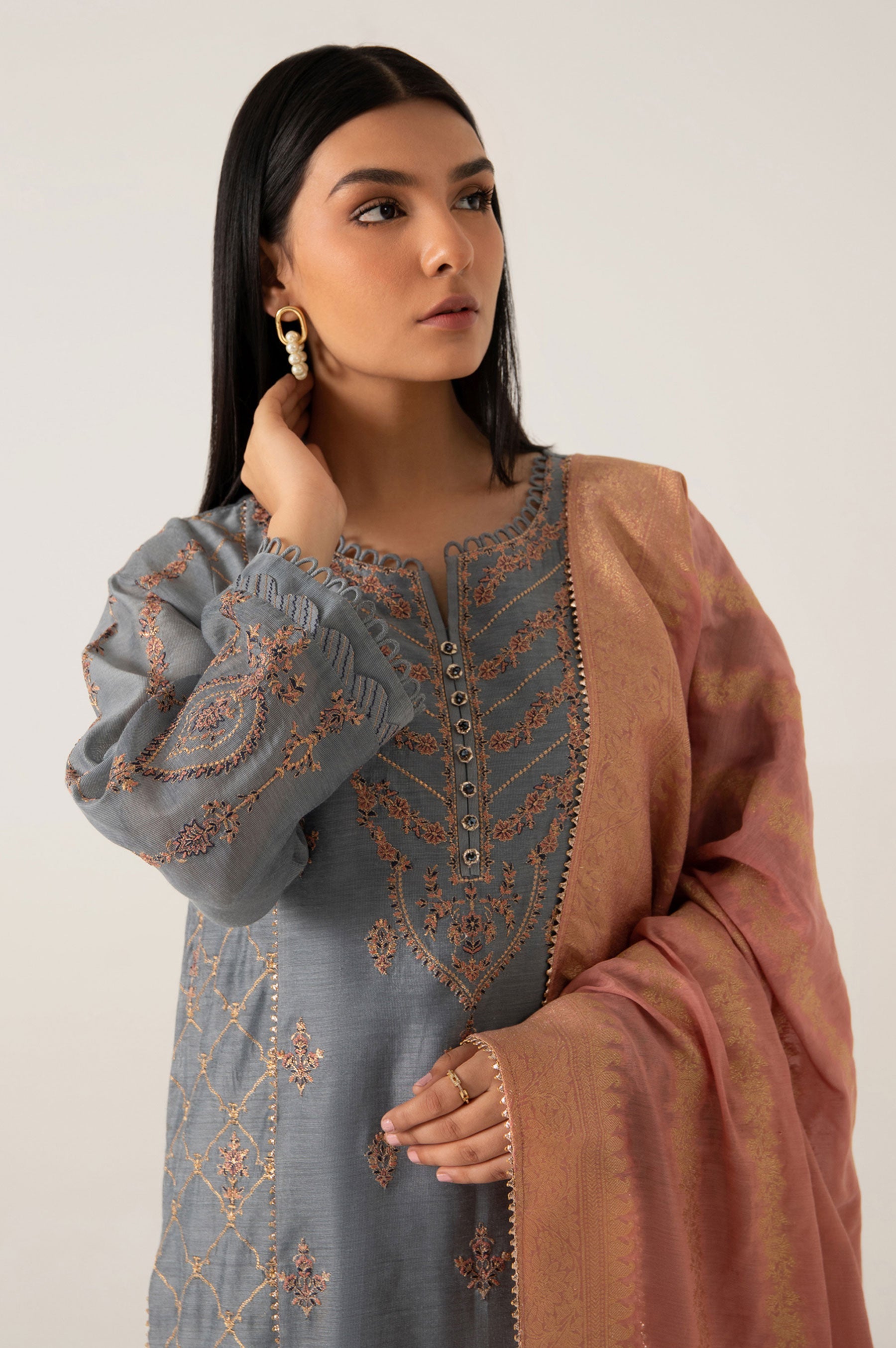 A breathtaking design rendered in unique hues of pink and blue on dusty blue cotton net shirt. The side panels feature a gold jaal which finish the design to perfection. Paired with beautiful contrast jacquard dupatta and rawsilk pant complements this stunningly decadent design.