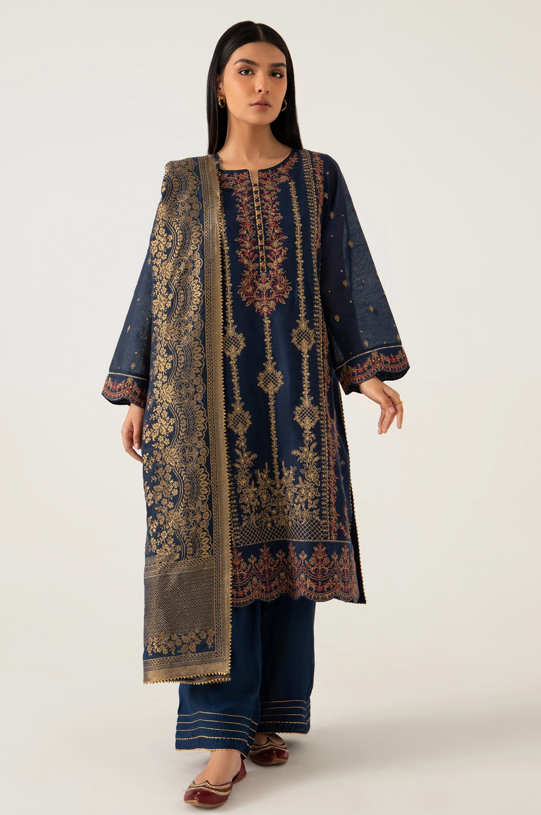A mesmerizing deep blue canvas is layered with traditional embroidery in sumptous shades of gold and pink. Paired with beautiful jacquard dupatta and raw silk pant, creating an ethereally elegant ensemble that will be your first choice in all event.
