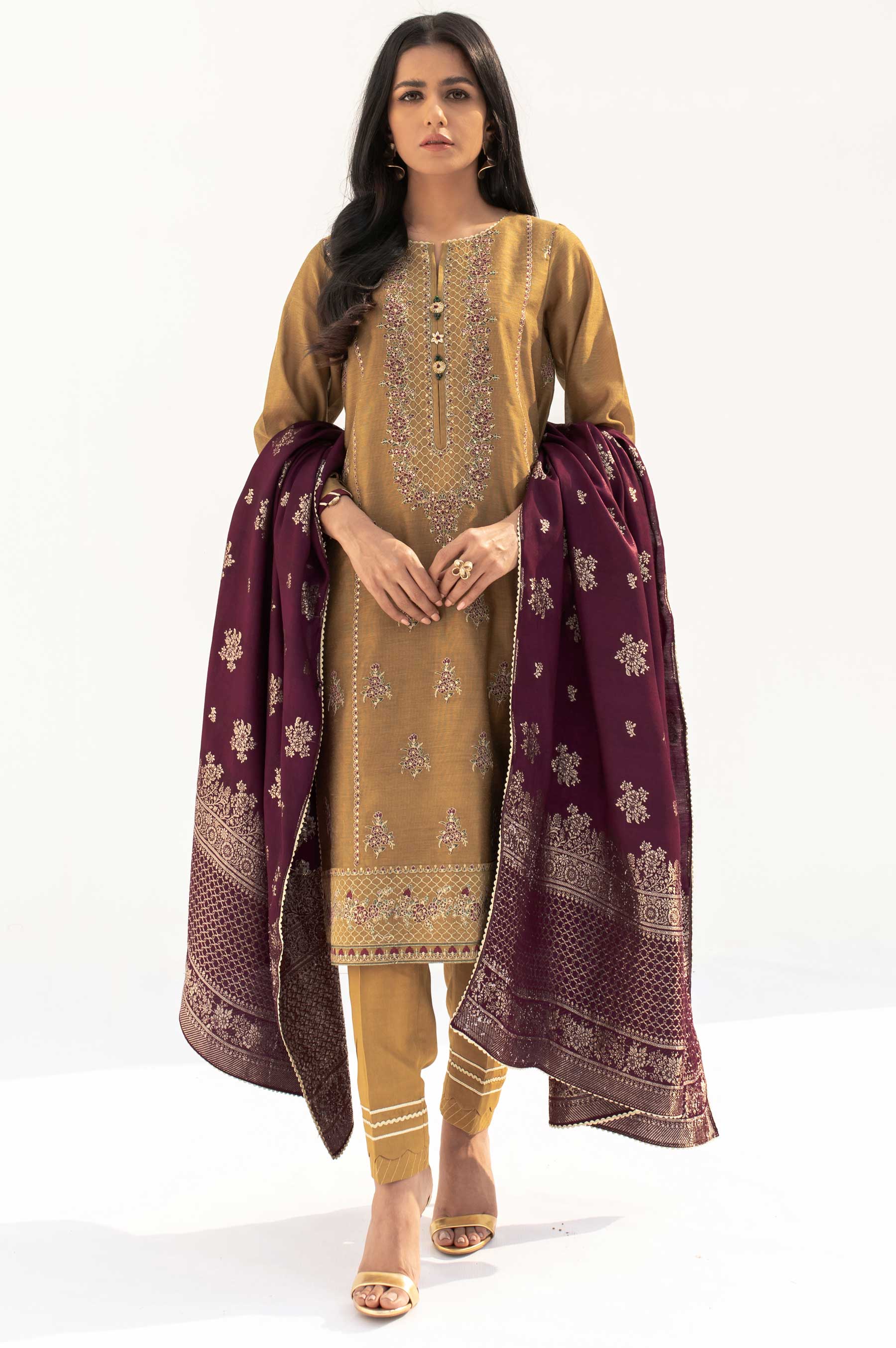 A classic composition is layered over this attractive olive ensemble, featuring a delicate embroidery on front inspired by vintage roses. Paired with a contrast banarsi dupatta, this outfit is a style statement to embrace at intimate gatherings.
