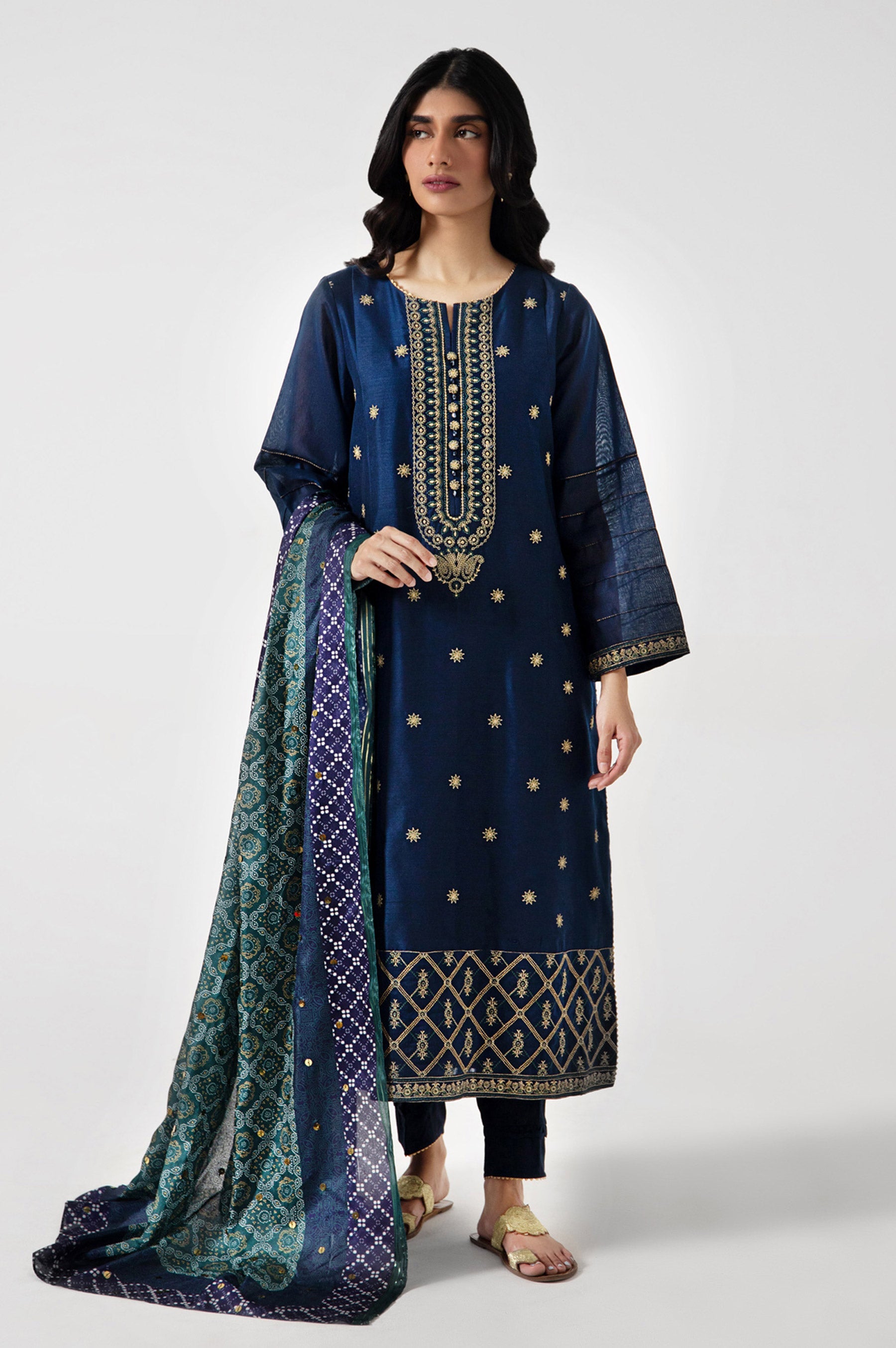 Wrap yourself in this ethnic blue embroidered cotton net shirt with embroidered front and a traditional back motif, paired with a beautiful blue contrast digital print dupatta inspired by chunri. The mesmerising dupatta is embellieshed with sequins to glam the ethnic feel.