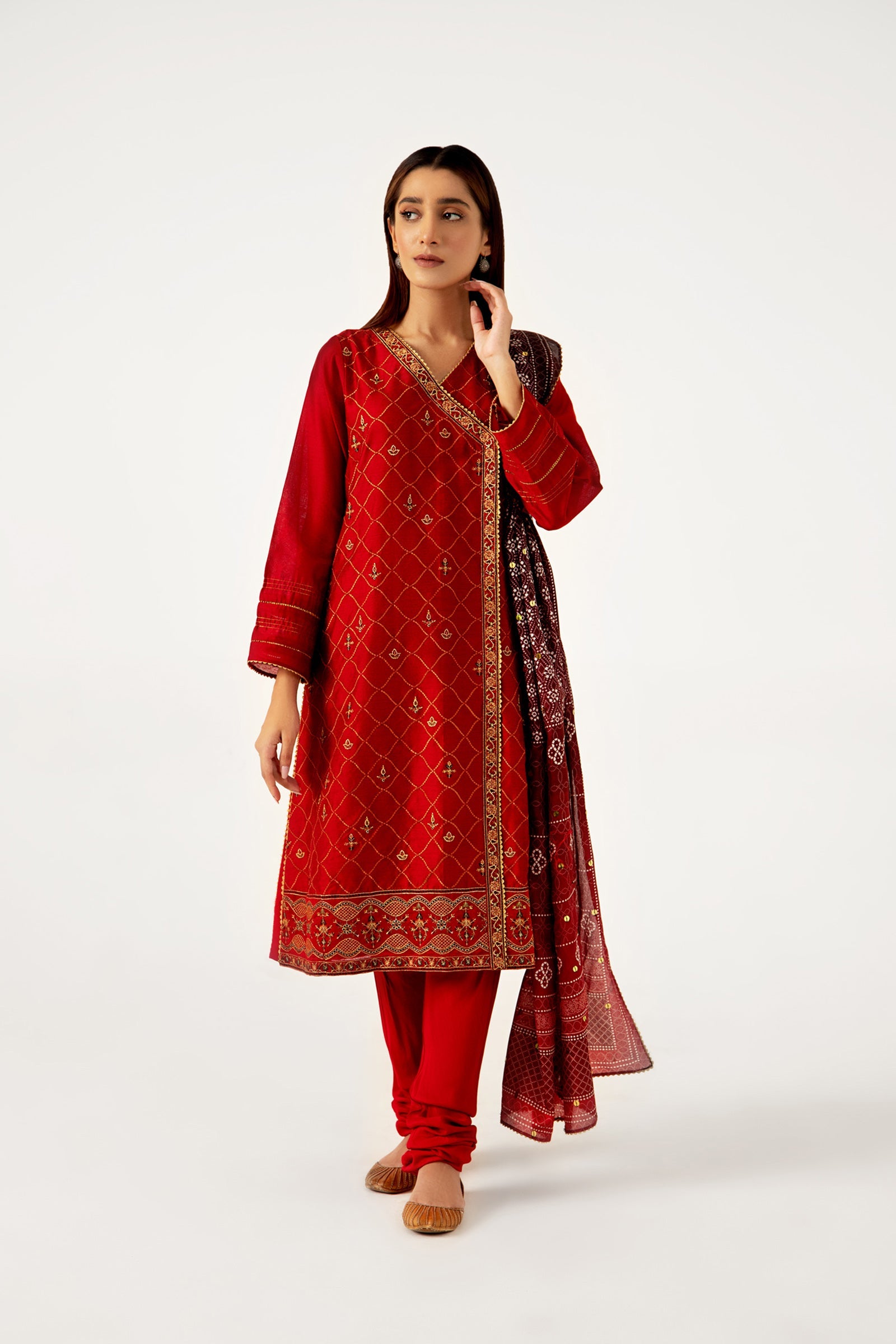 Add some elegance to your life with this unstitched three-piece suit featuring chunri inspired embroidered scarlet red cotton net shirt. Paired with silk digital print dupatta with sequins embroidery and raw silk bottom, this 3pcs unstitched outfit is a must buy this season.