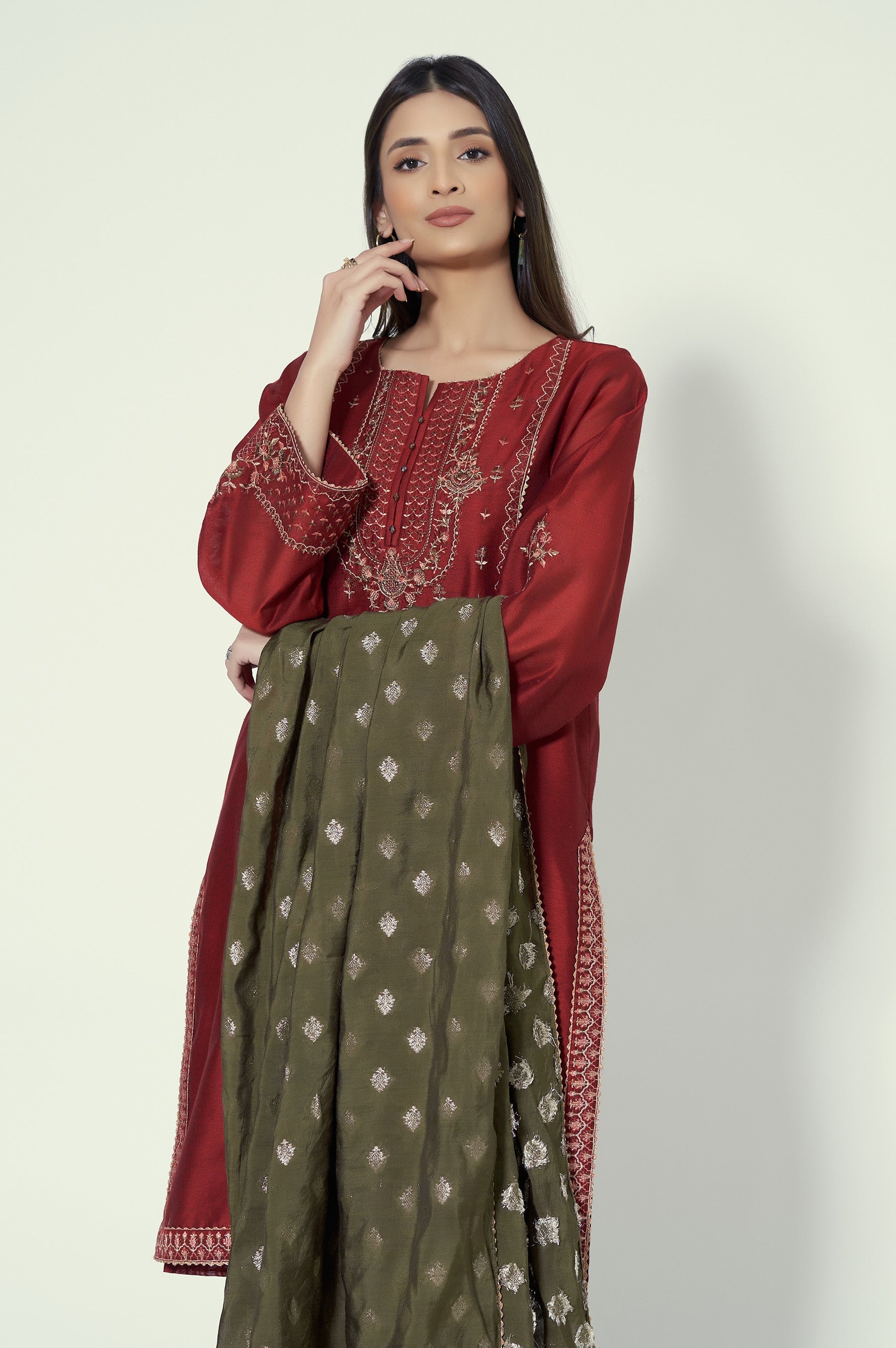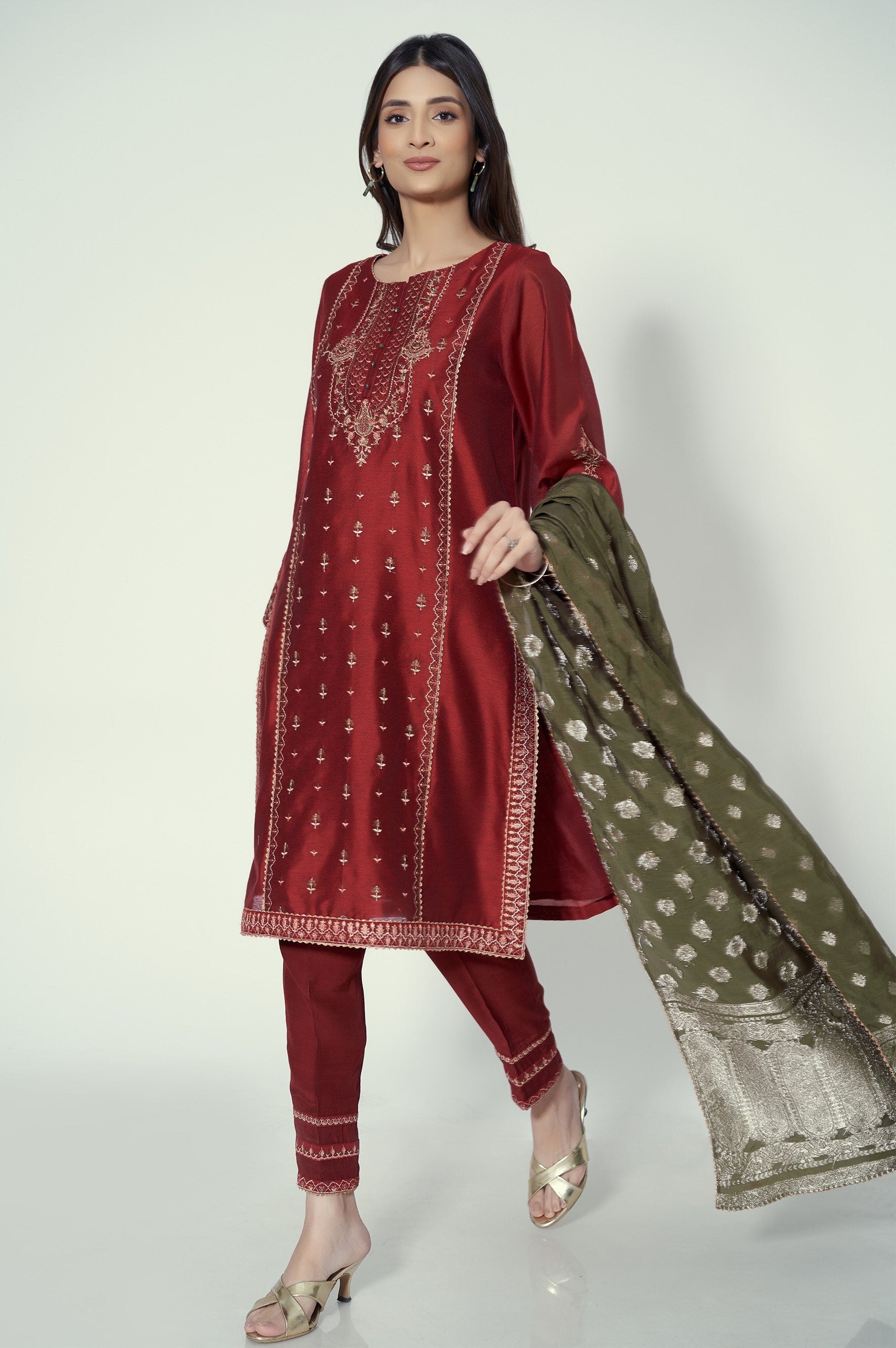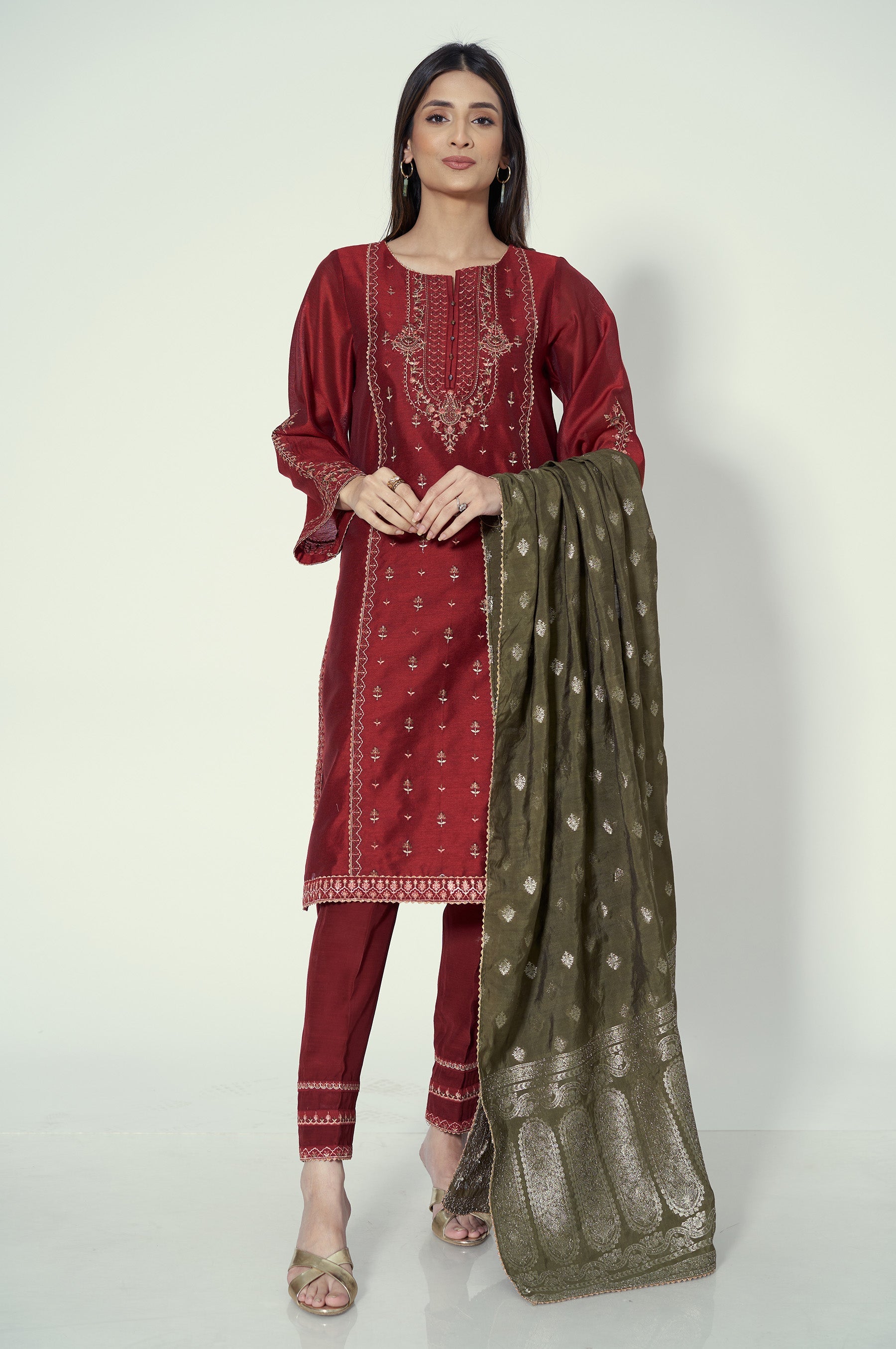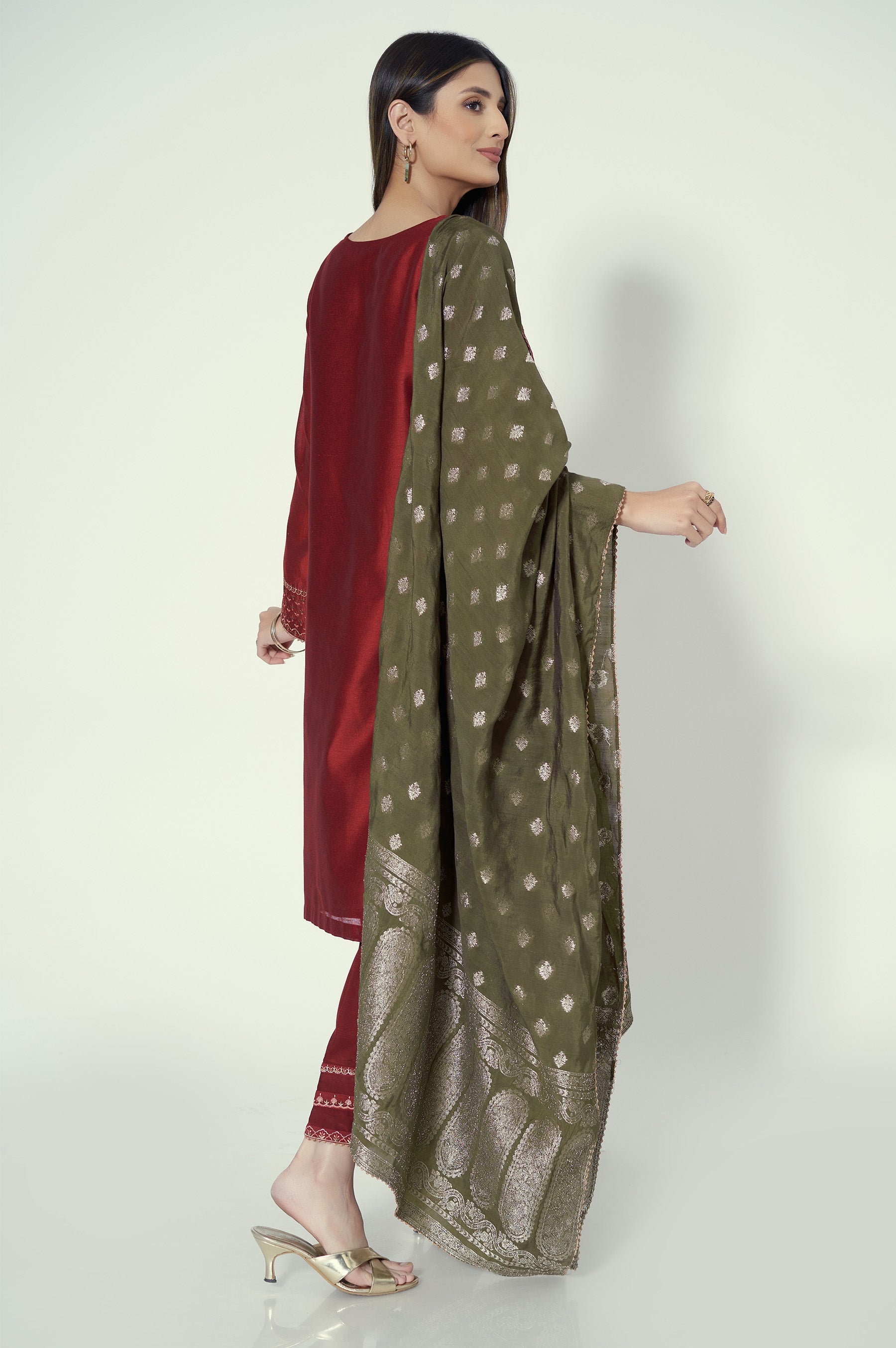 Rendered in barn red features intricate colourful threads and tilla forming a beautiful composition.This beautiful article is paired with a royal dupatta.This sumptuous fabric can be fashioned curate looks ideal for soiree's and festivities.