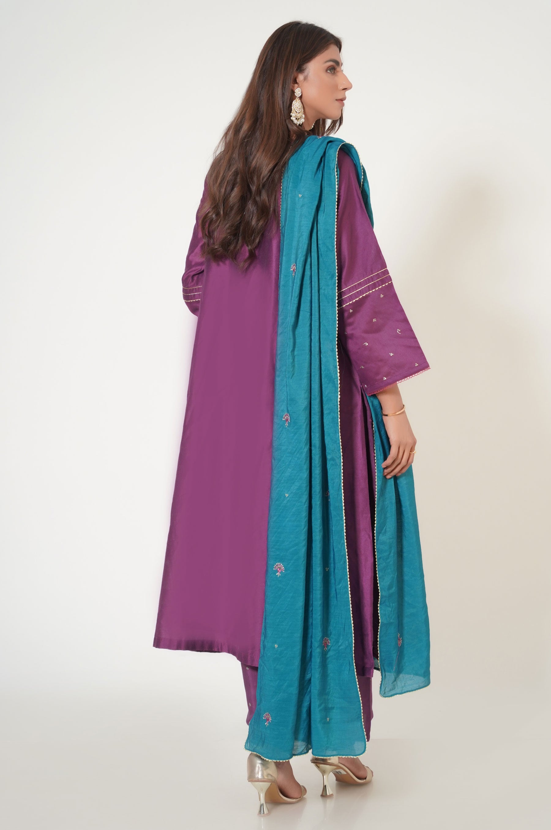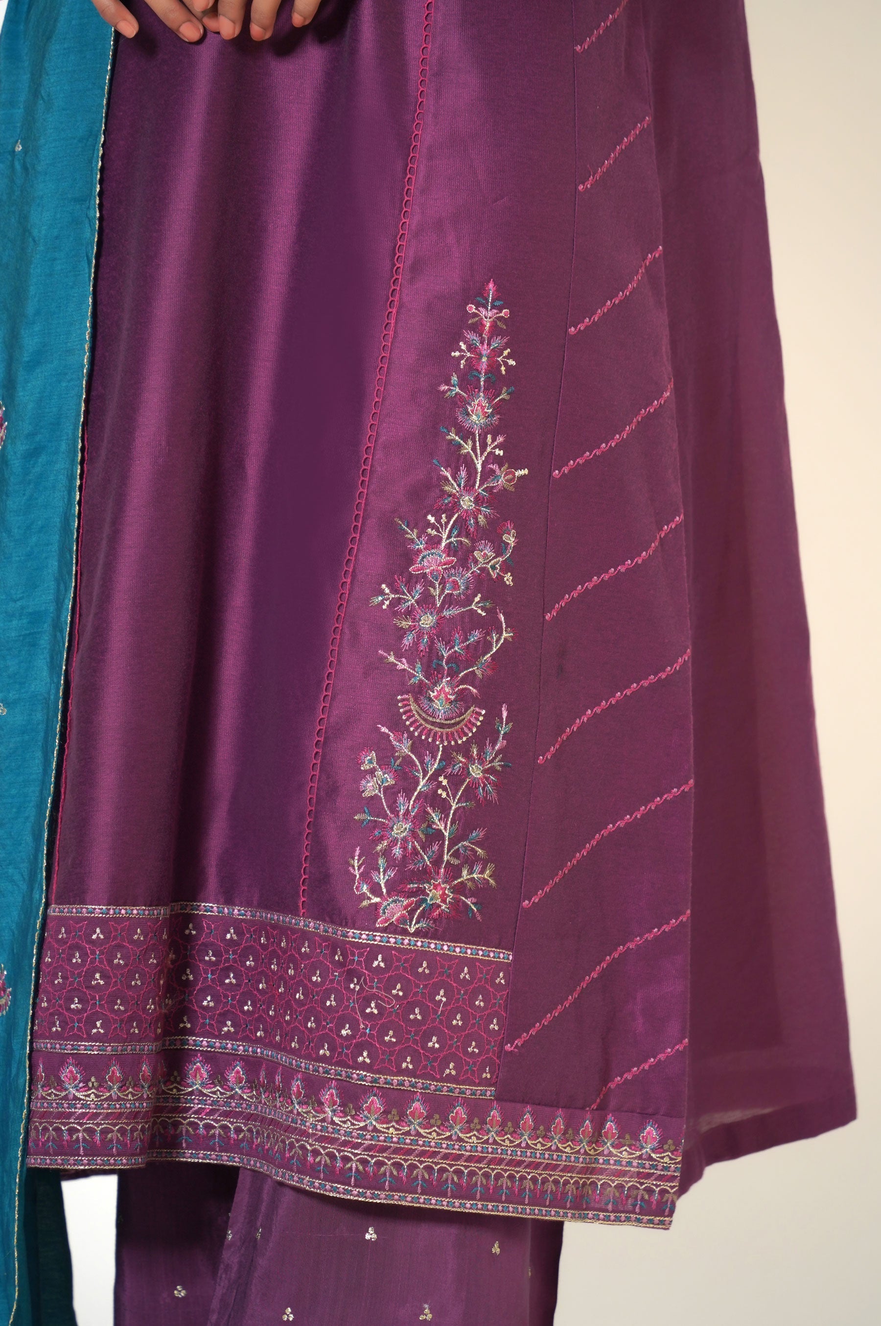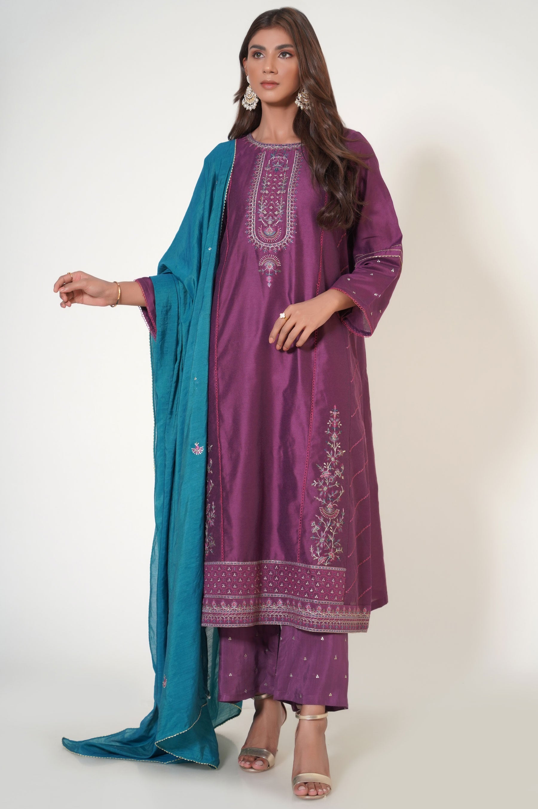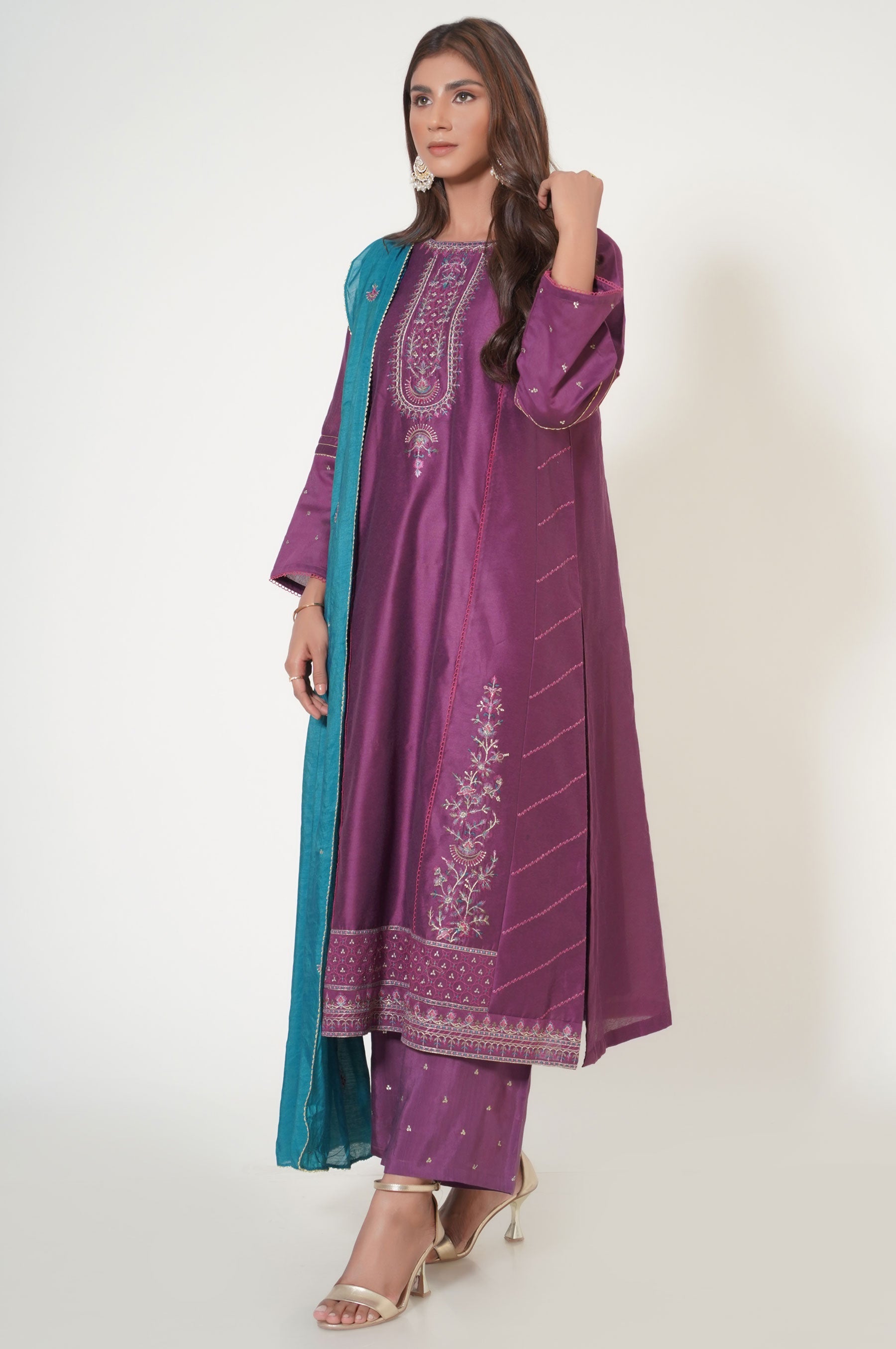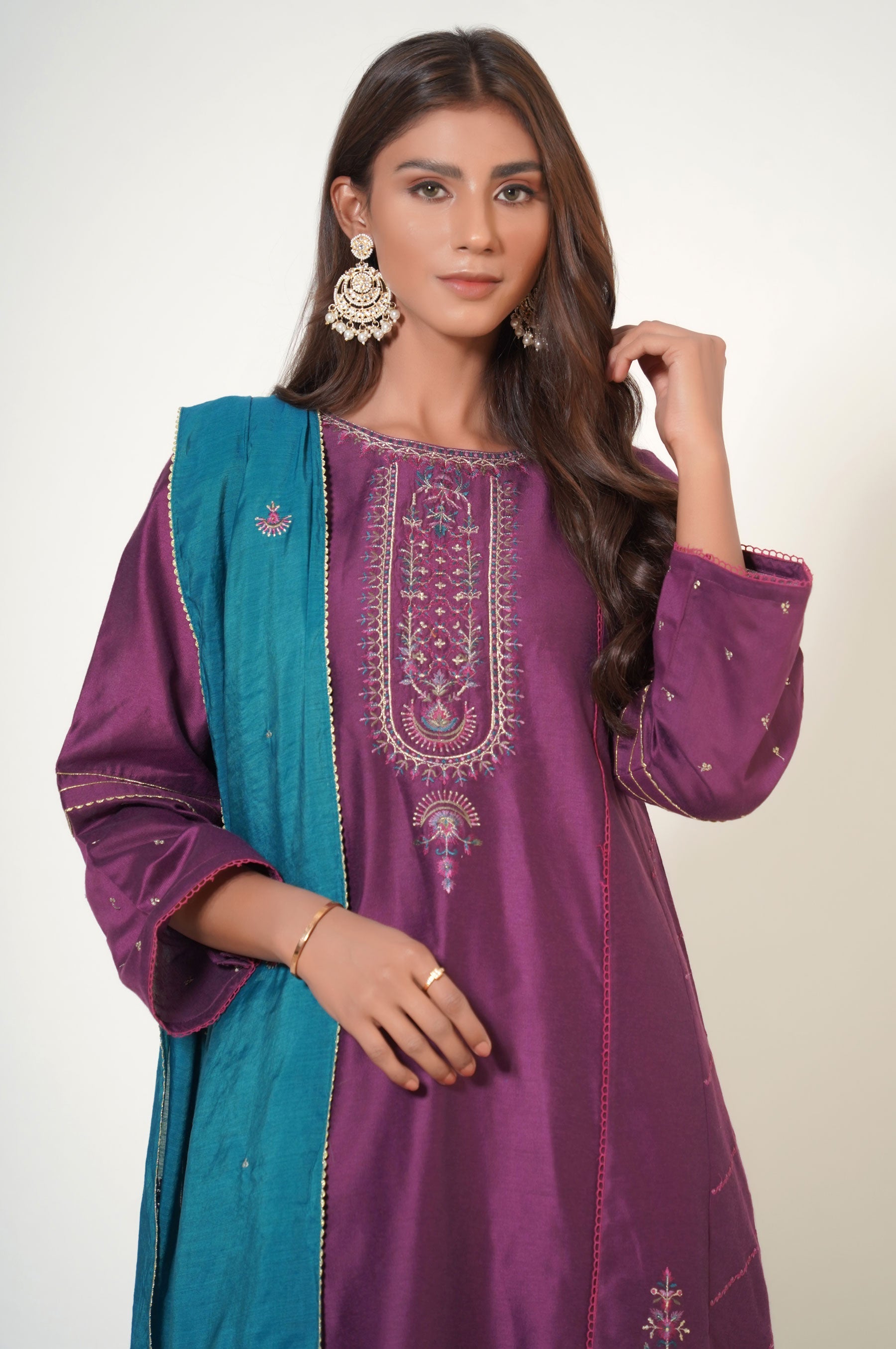 This cotton net attire is designed to give you a royal look for festive season. Composed with an intreicately embroidered neckline, borders and side panels, This outfit is rendered in purple color with an accent of turquoise. Paired with a vibrant all over embroidered dupatta and embroidered pants, this outfit will make you stand out in the crowd.