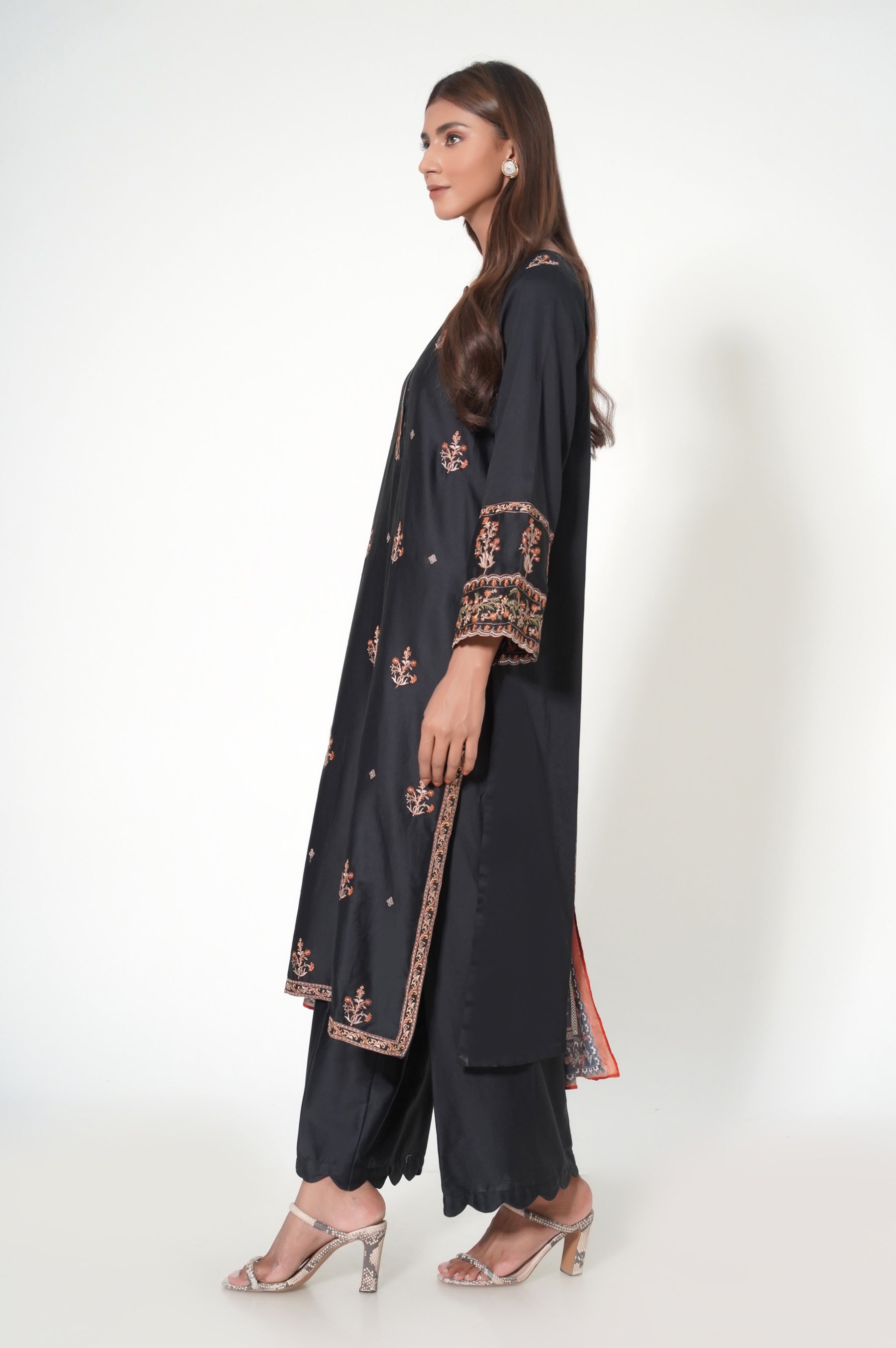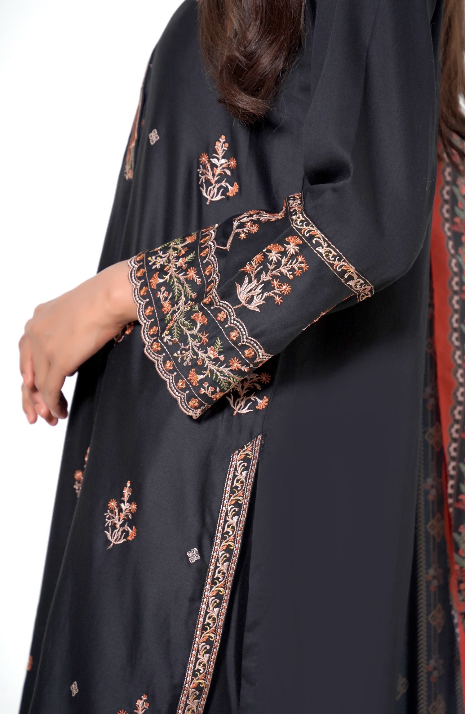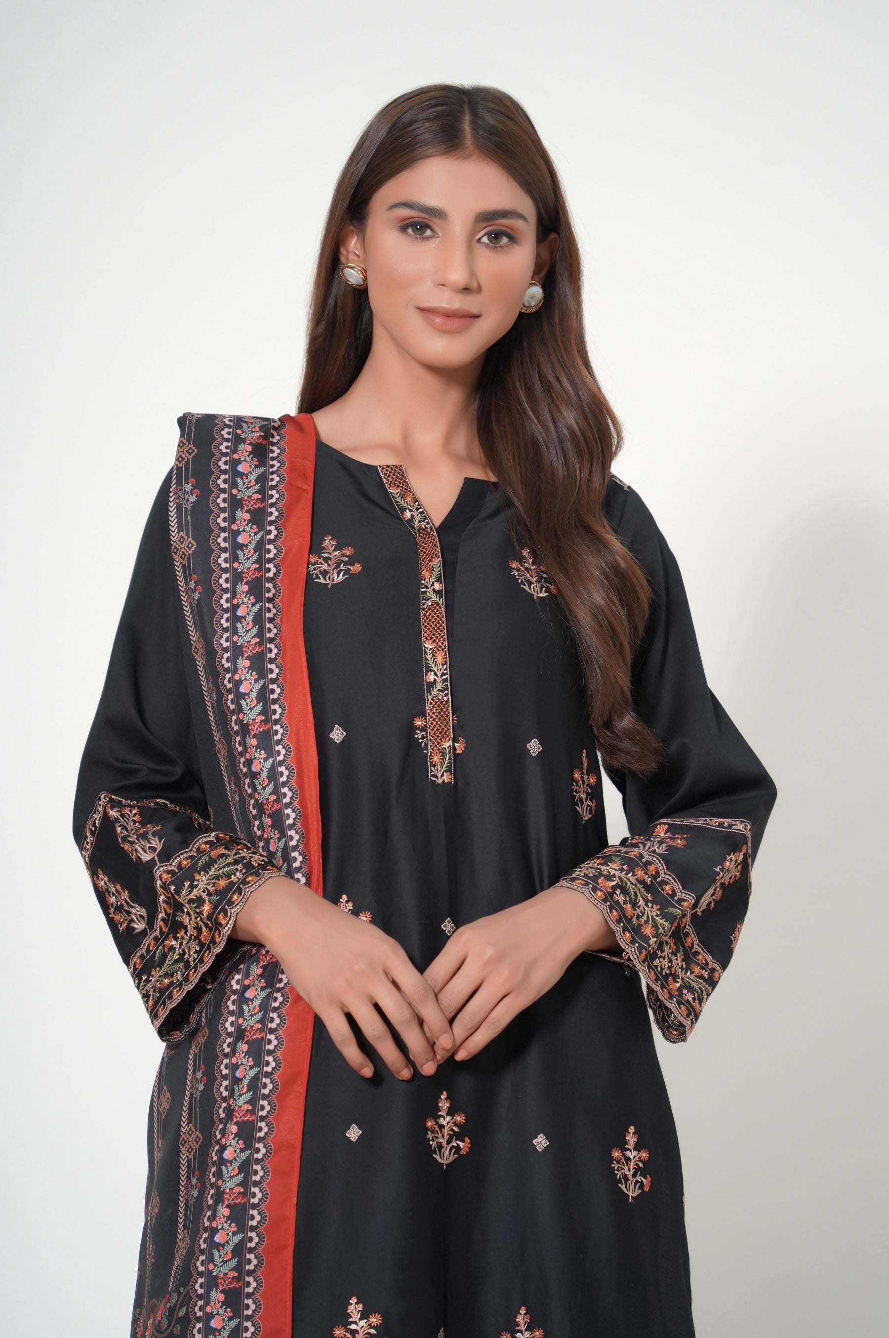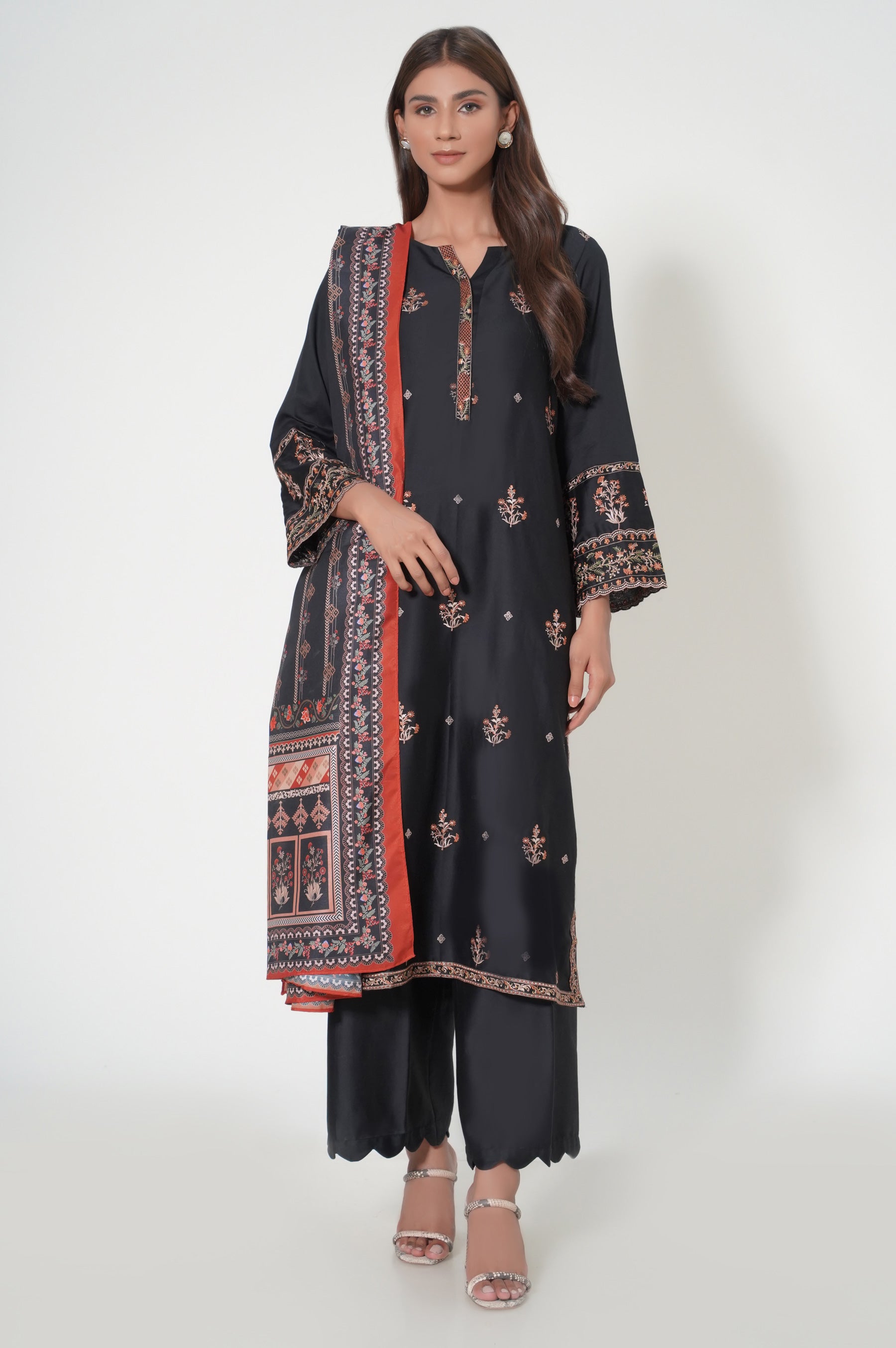 Showcase your grace and style in our gorgeous 3 piece Cotton Satin outfit, inspired by beautiful motifs. Paired with digital printed dupatta, this ethnic embroidered outfit will certainly elevate your ensemble.