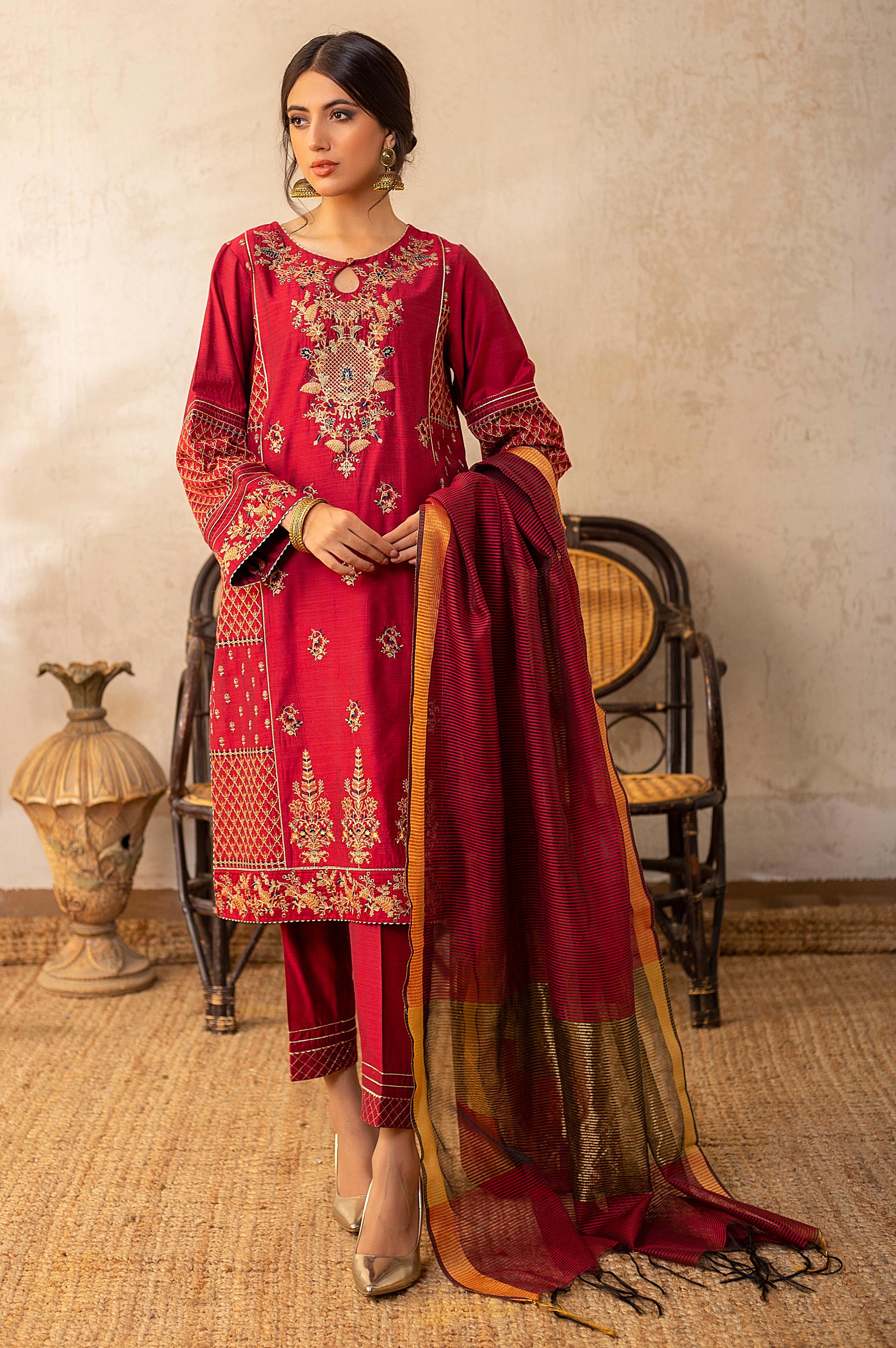 This 3pcs unstitched yarn-dyed cotton silk ensemble features intricated traditional embroideries on front and elevates side panels, along with the beautiful floral borders for daman and sleeves. Paired with a striped dupatta and tonal bottom, this alluring design is a style statement in this season.