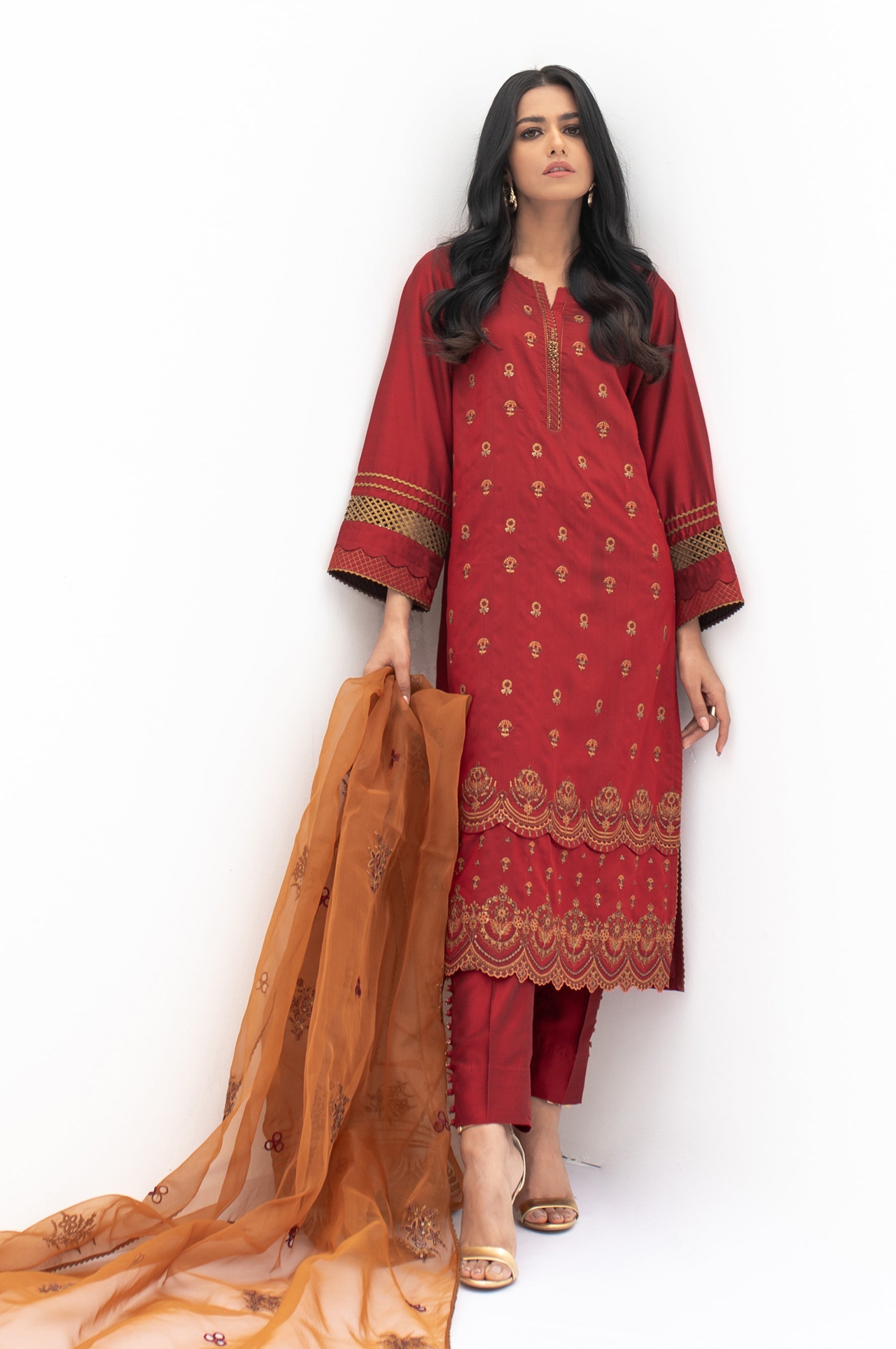 An artistically appealing composition is layered over this maroon ensemble, featuring a feminine cotton silk shirt adorned with exquisite chikankari inspired embroidery. Paired with a contrast organza embroidered dupatta in boring technique, this ensemble is a great option for cheerful festive events.