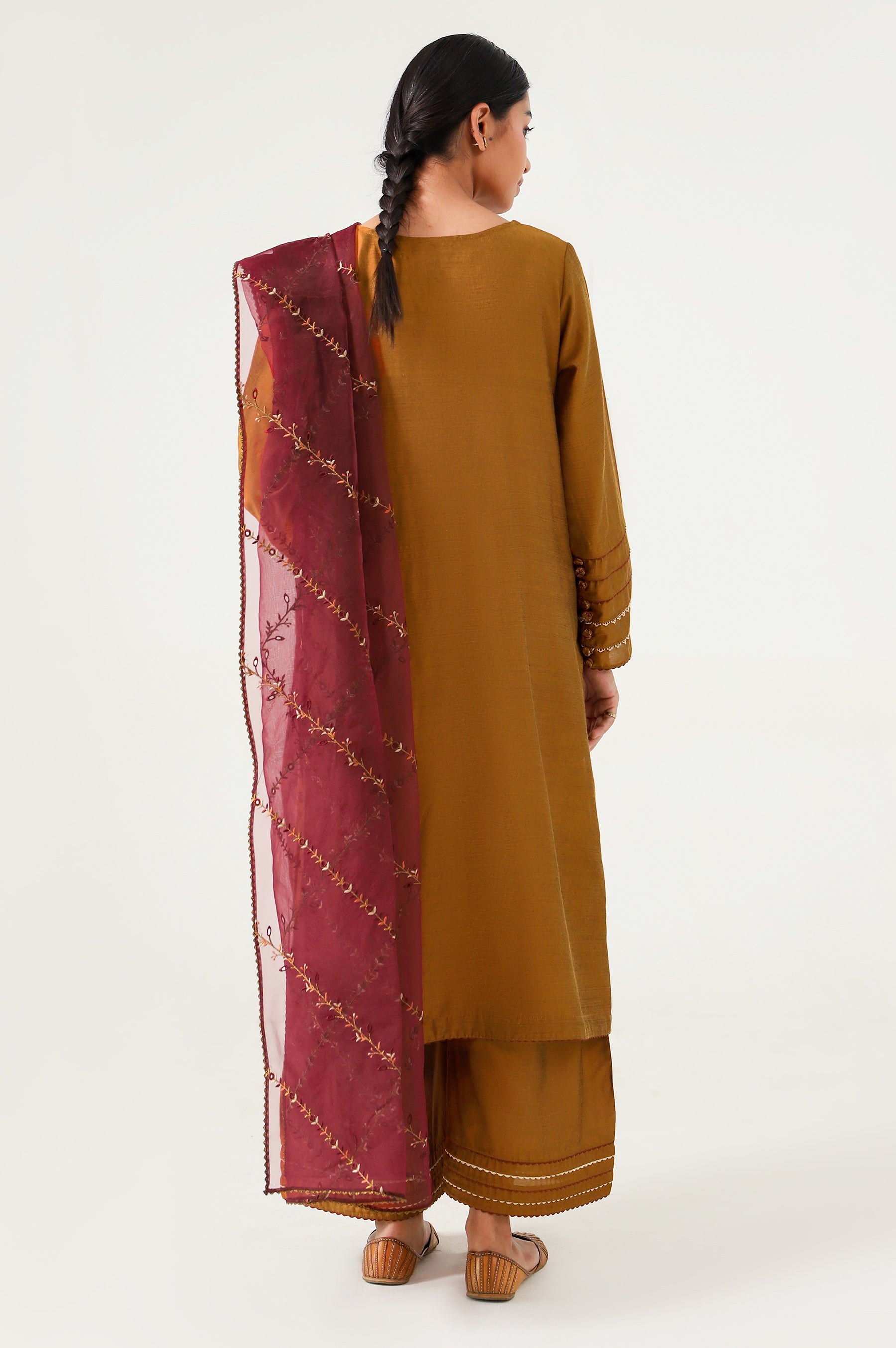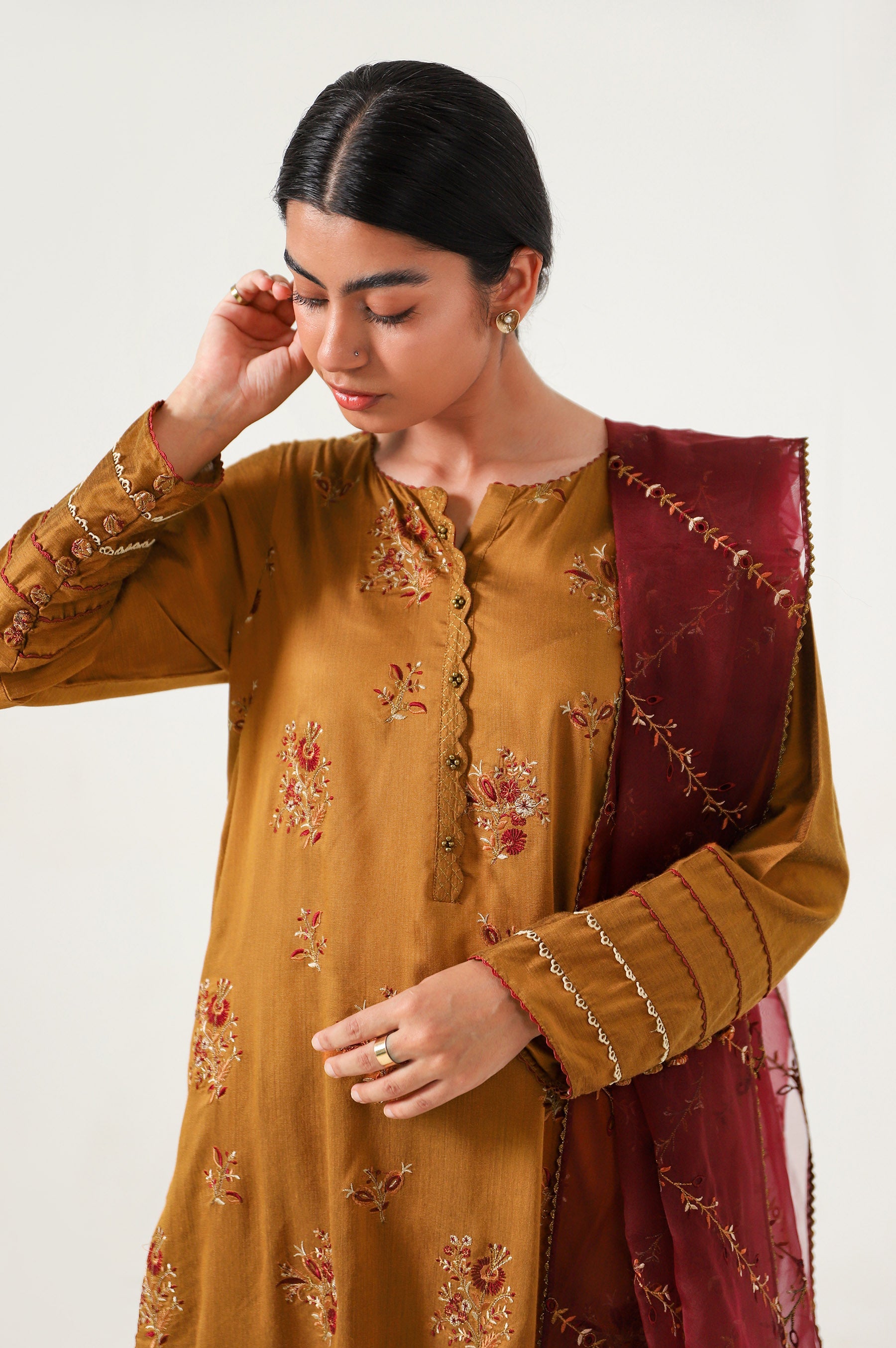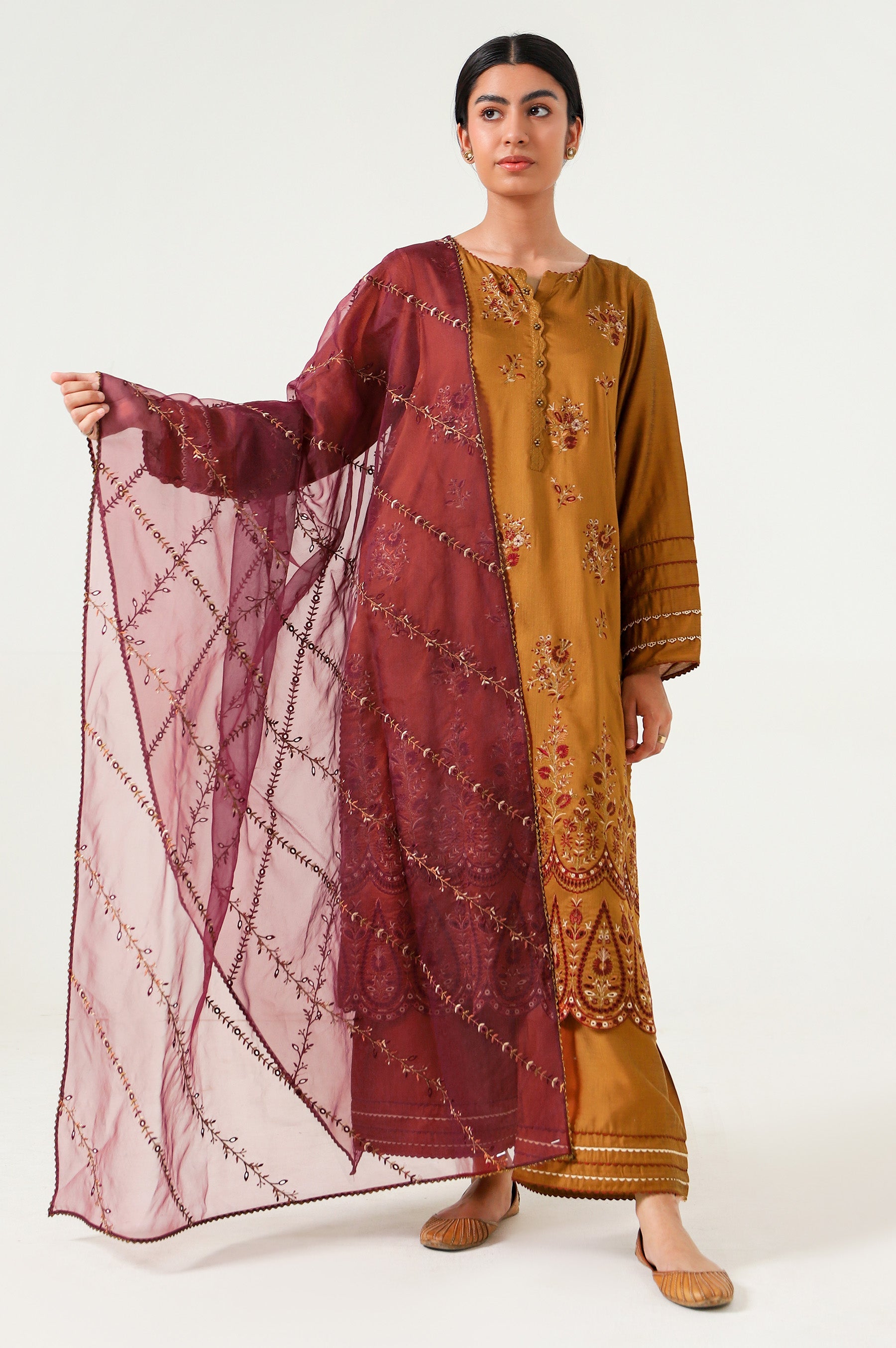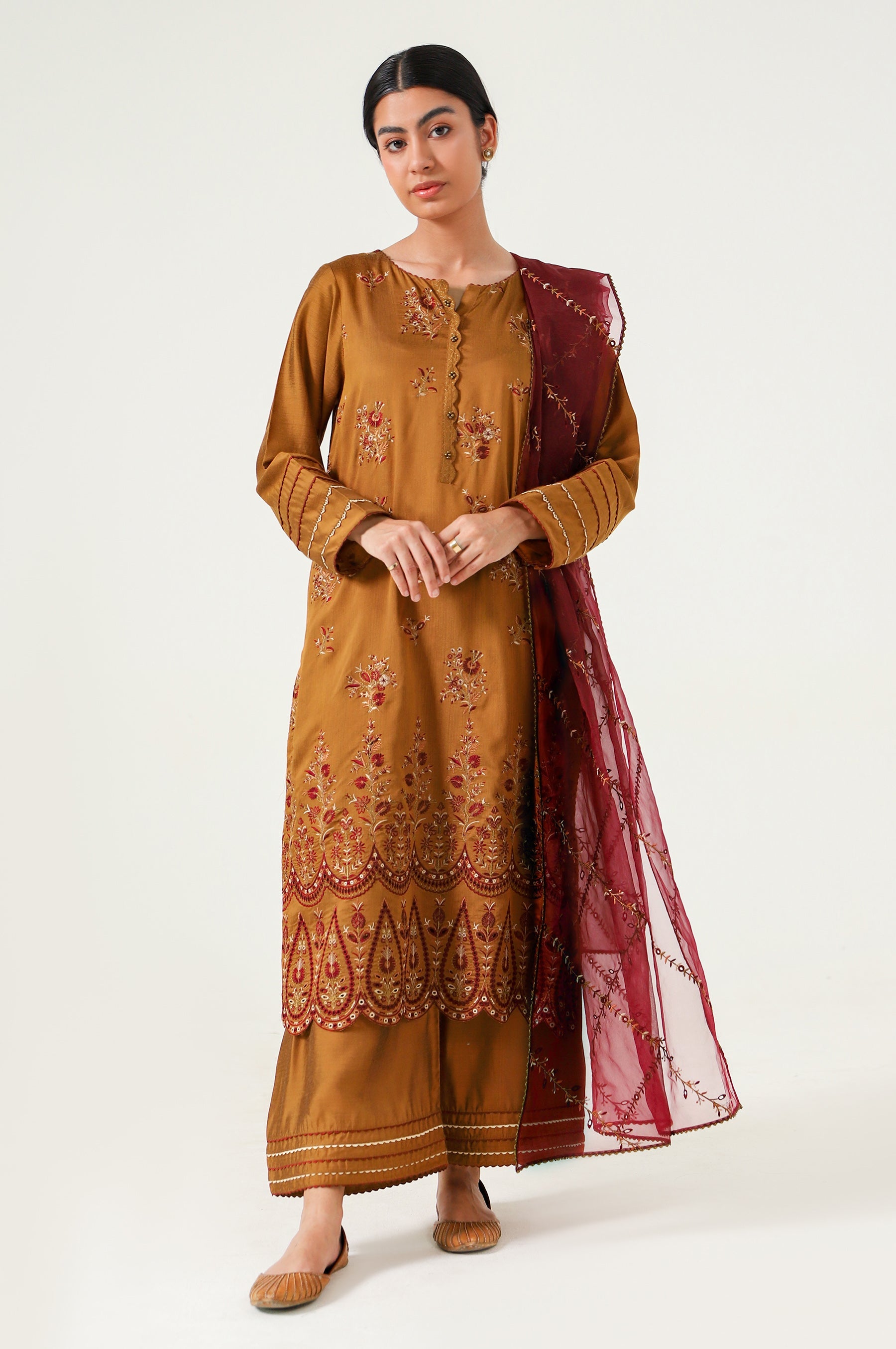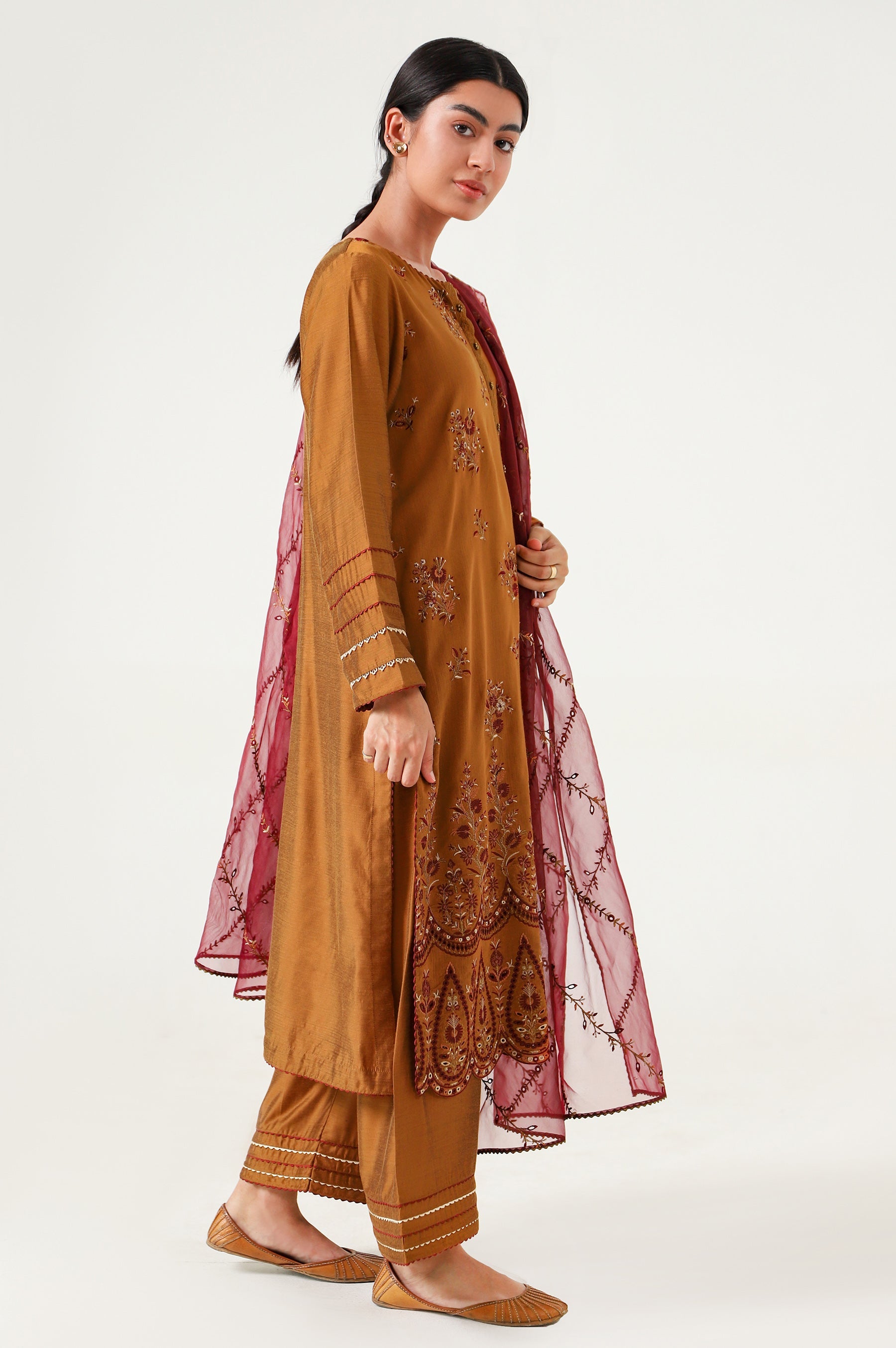 *2.5 Yards Organza Dupatta With Boring Embroidery *Embroidered Cotton Silk Front *Plain Cotton Silk Sleeves *Plain Cotton Silk Back *Embroidered Border for Daman *2.5 Yards Cotton Silk Bottom *Color: Ginger RustShare