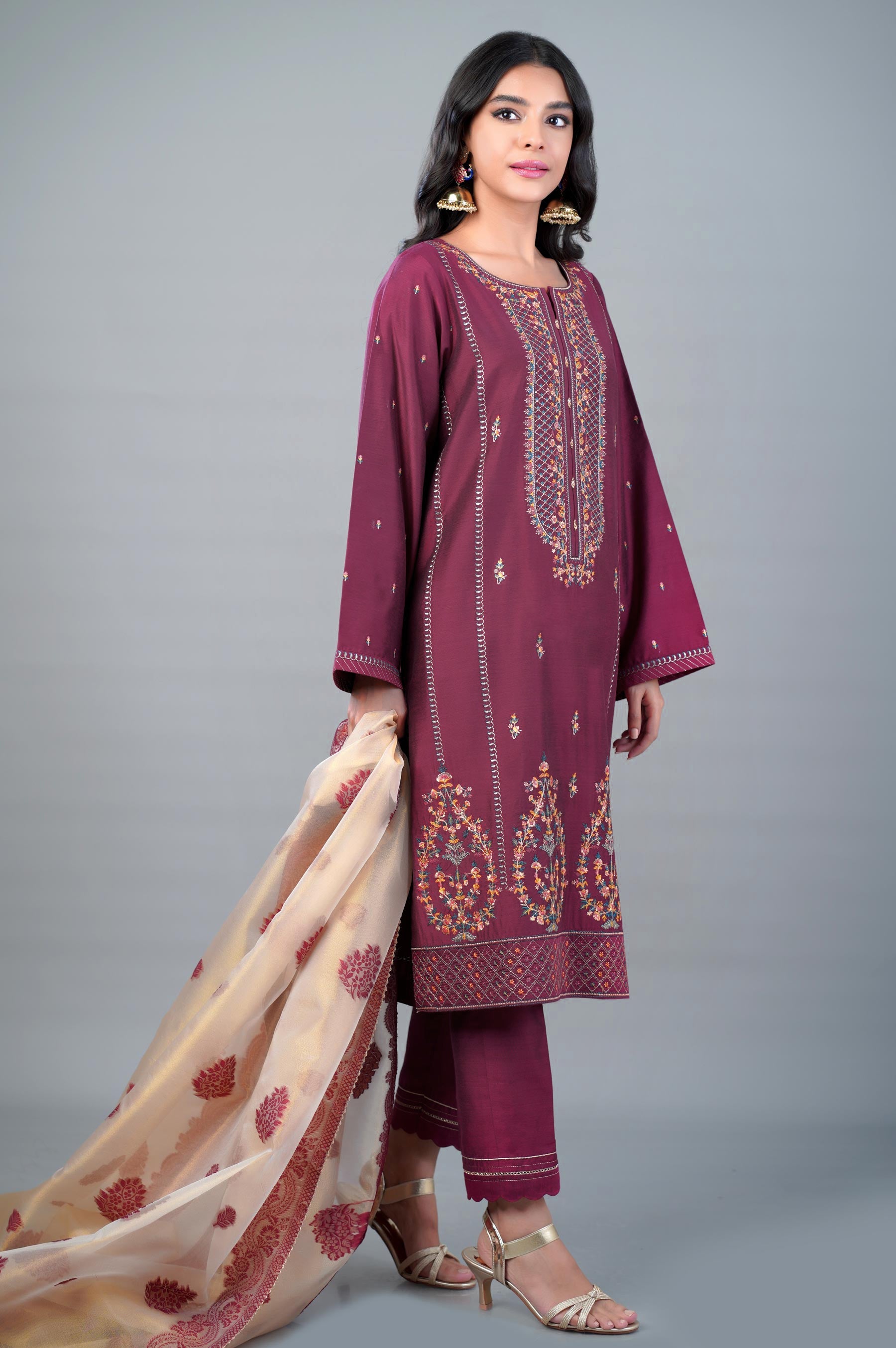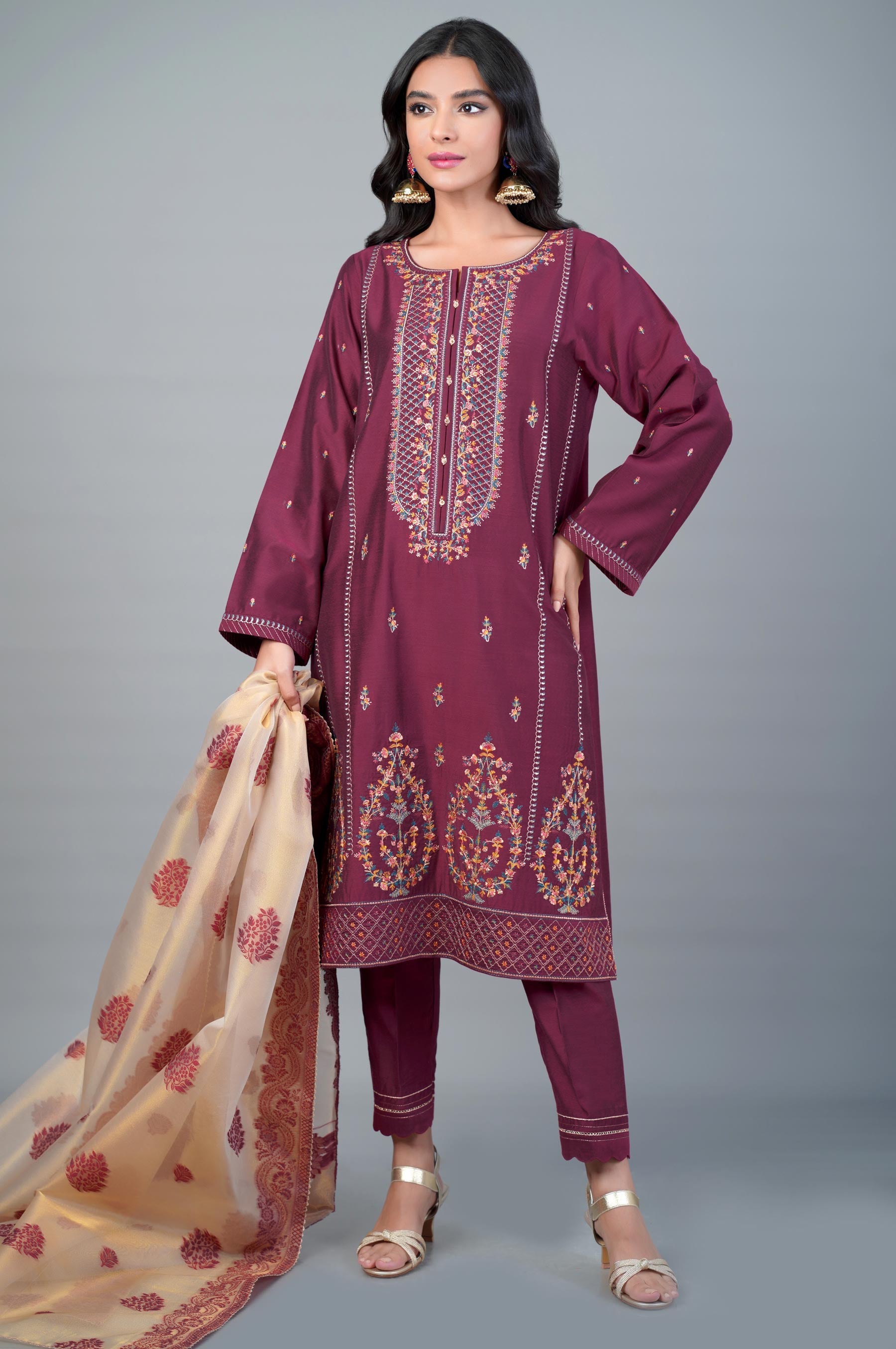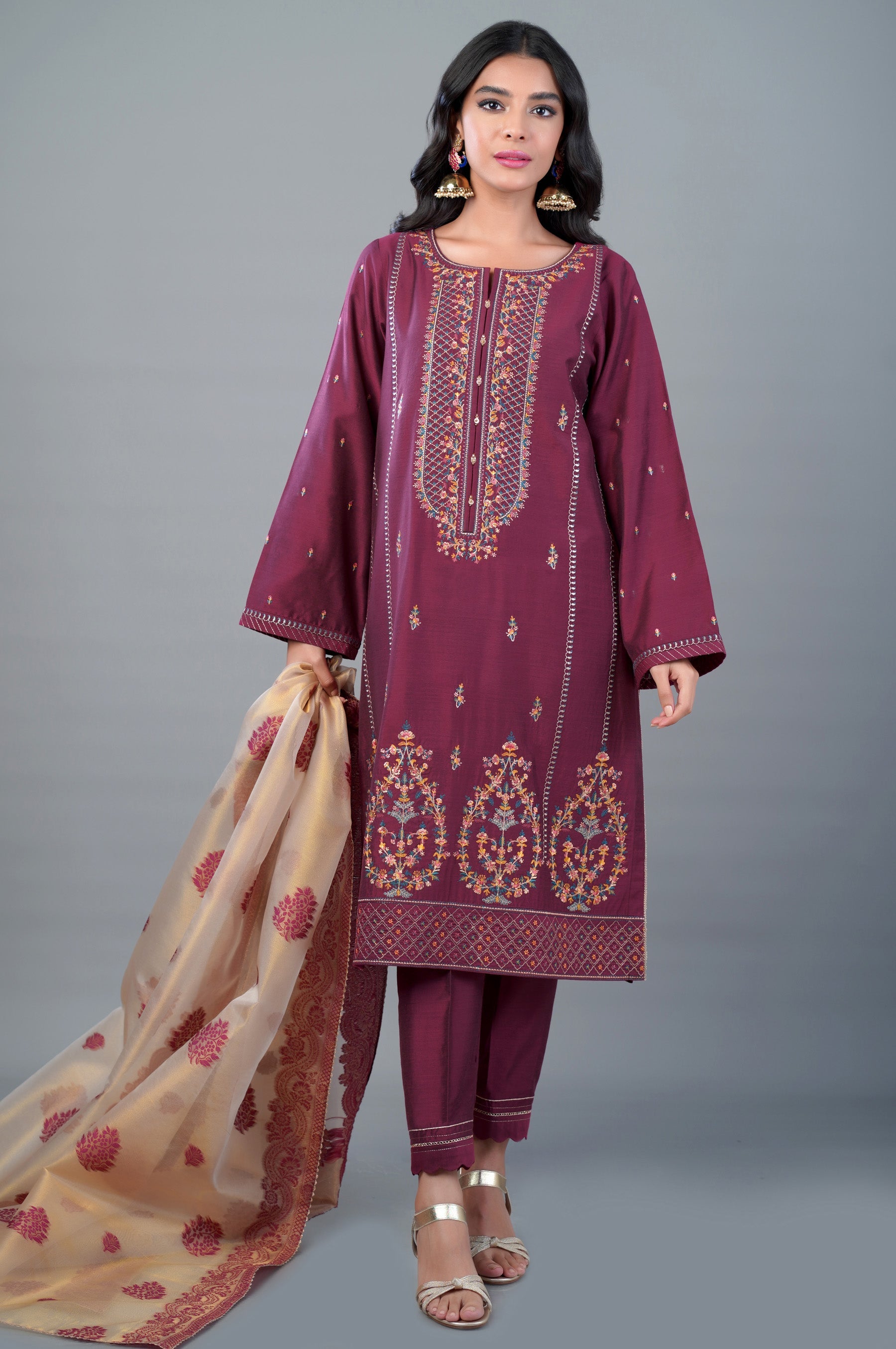 Look like a vision of beauty in this unstitched 3 piece outfit in plum, with a richly embroidered shirt. Paired with mesmerizing golden net jacquard dupatta, this ensemble has front composed embroidery inspired by Indian paisleys with the perfect color combination for this season.