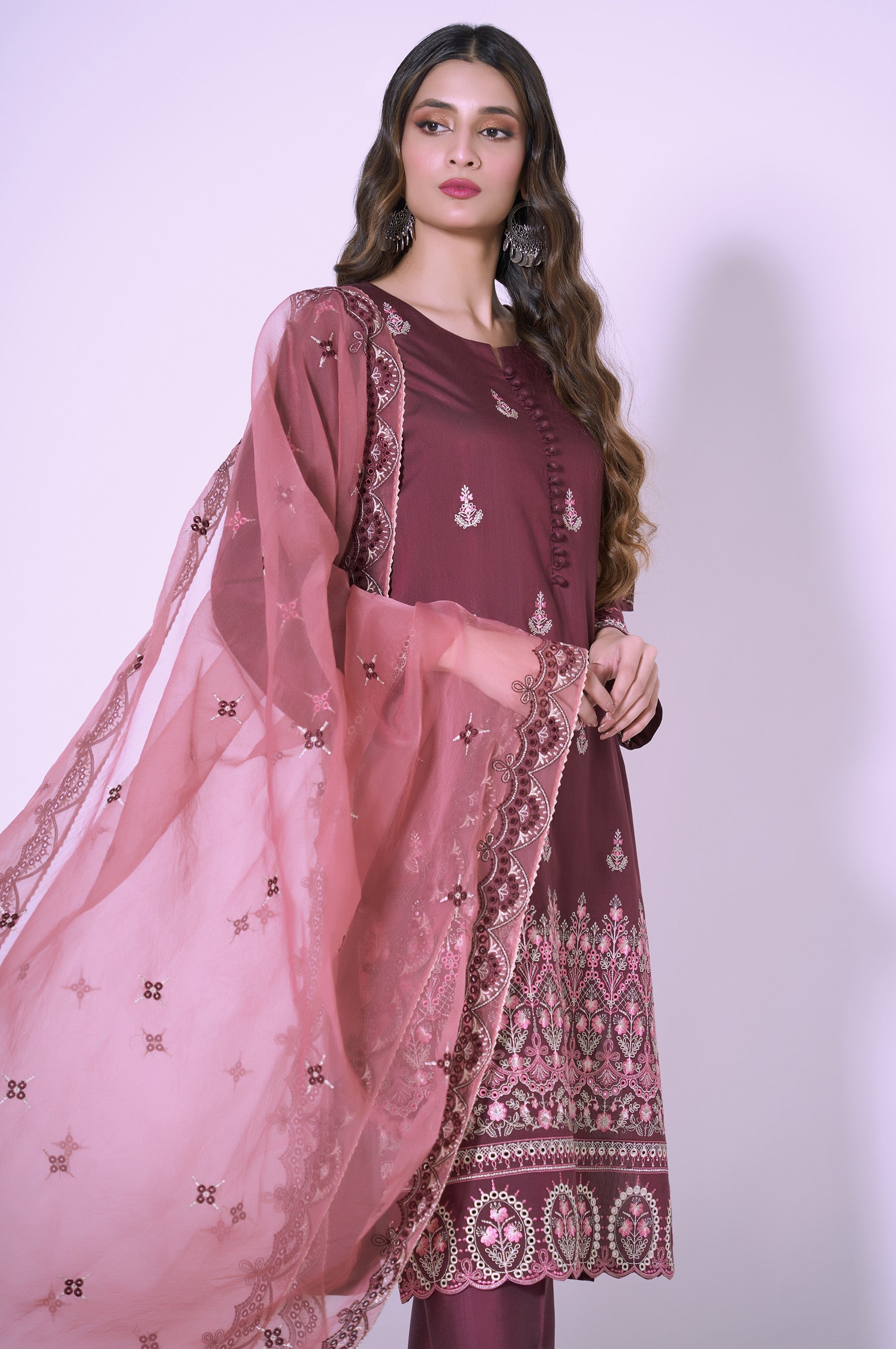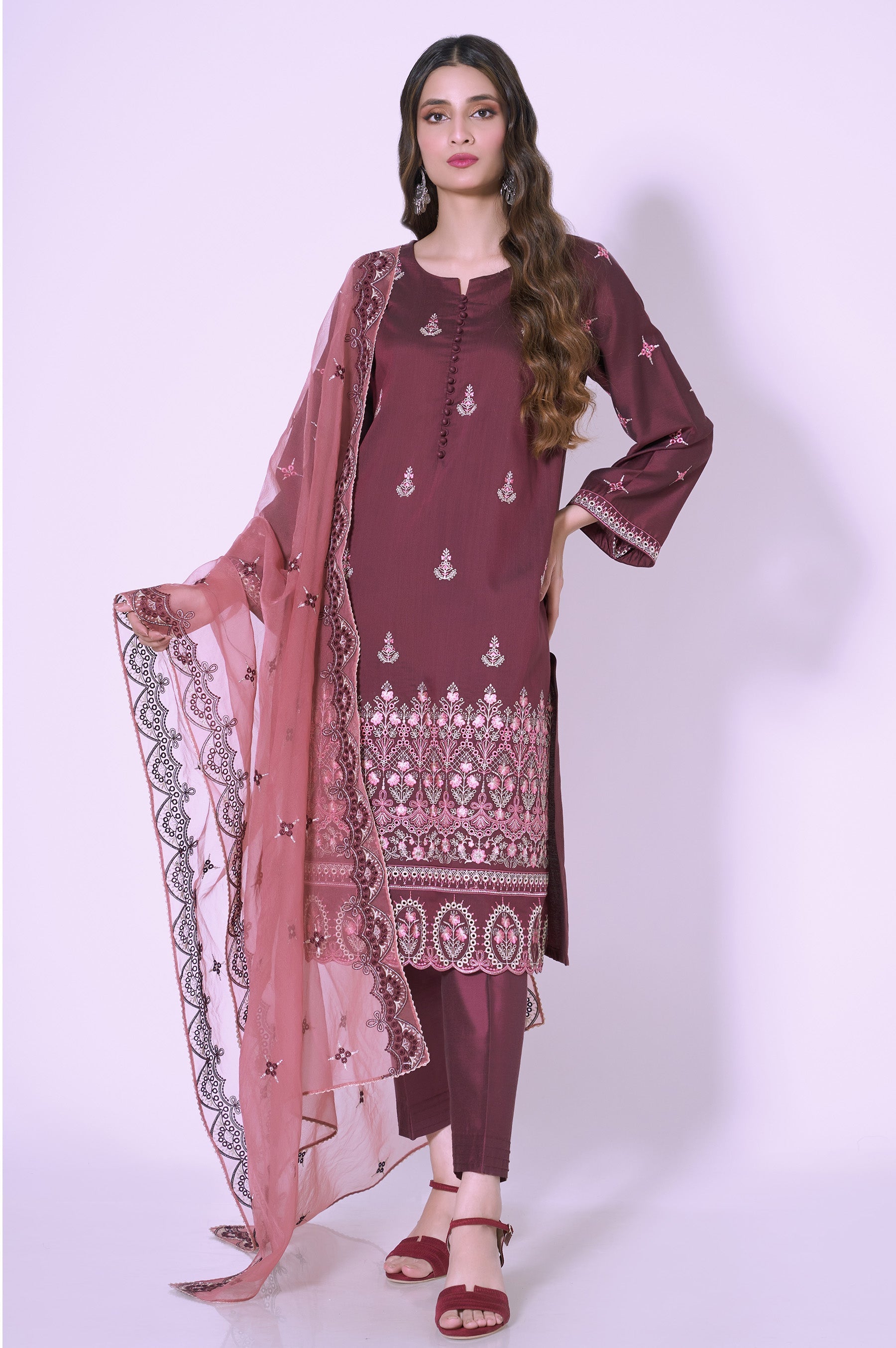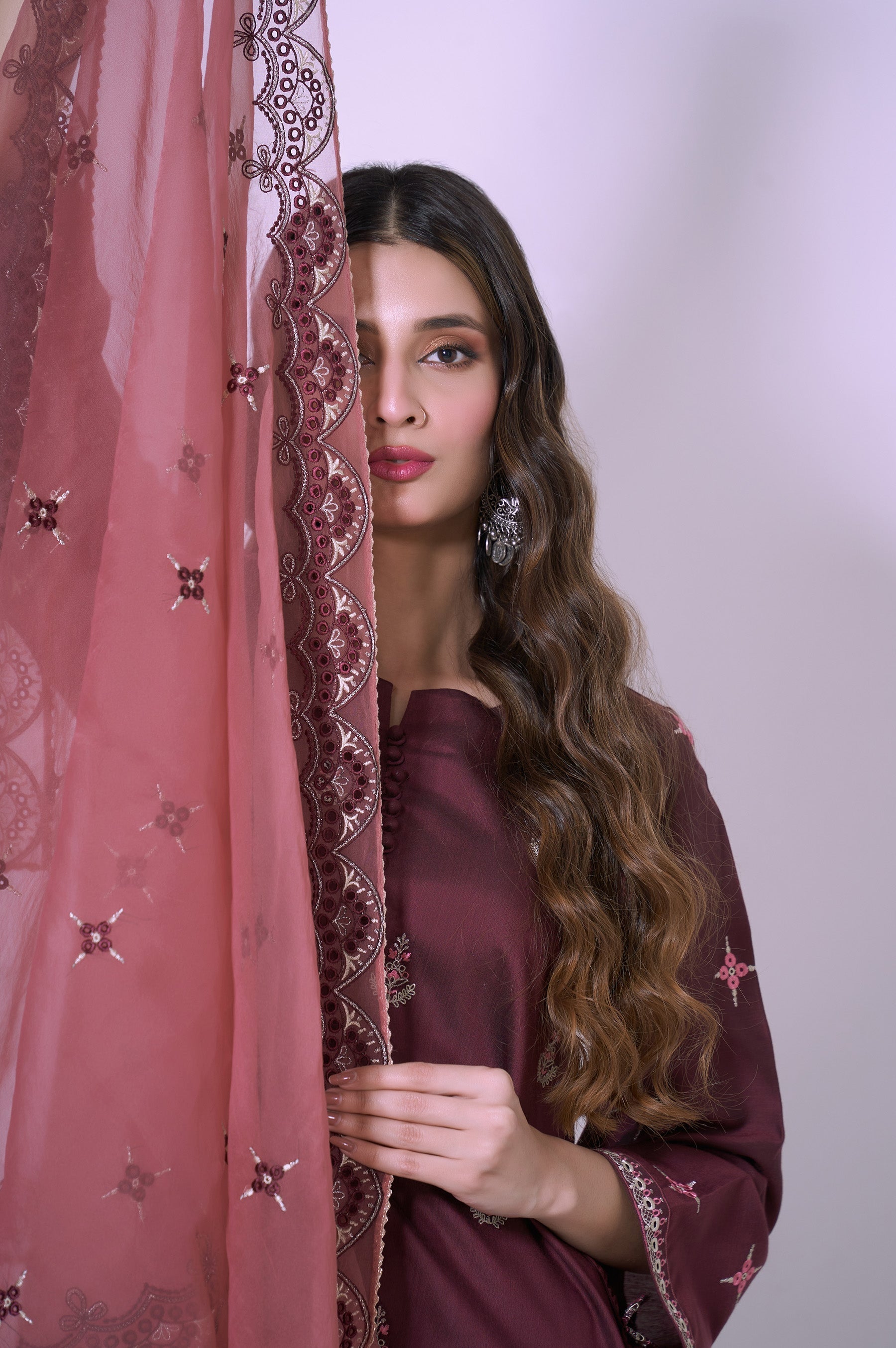 Exuding effortless grace, this maroon article has a classic embroidery on front. Beautifully enhanced with scintillating floral embroidery along with Organza Eyelet Embroidery dupatta,this artistic outfit is a must have this season to slay the classy look.