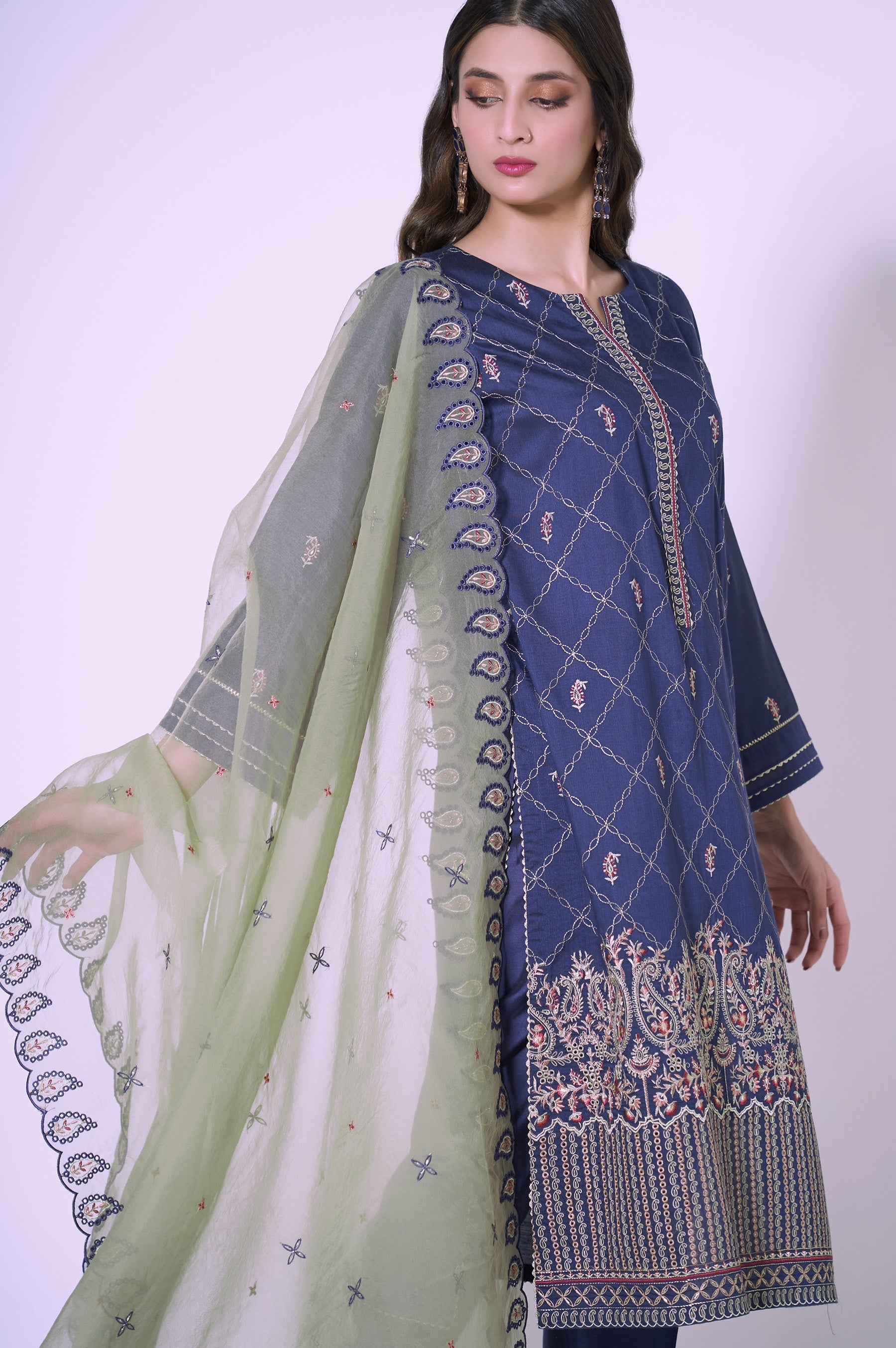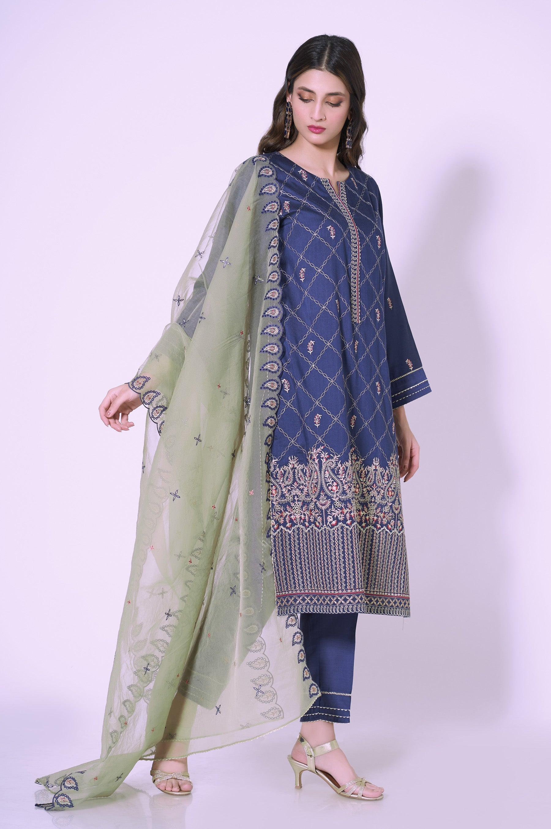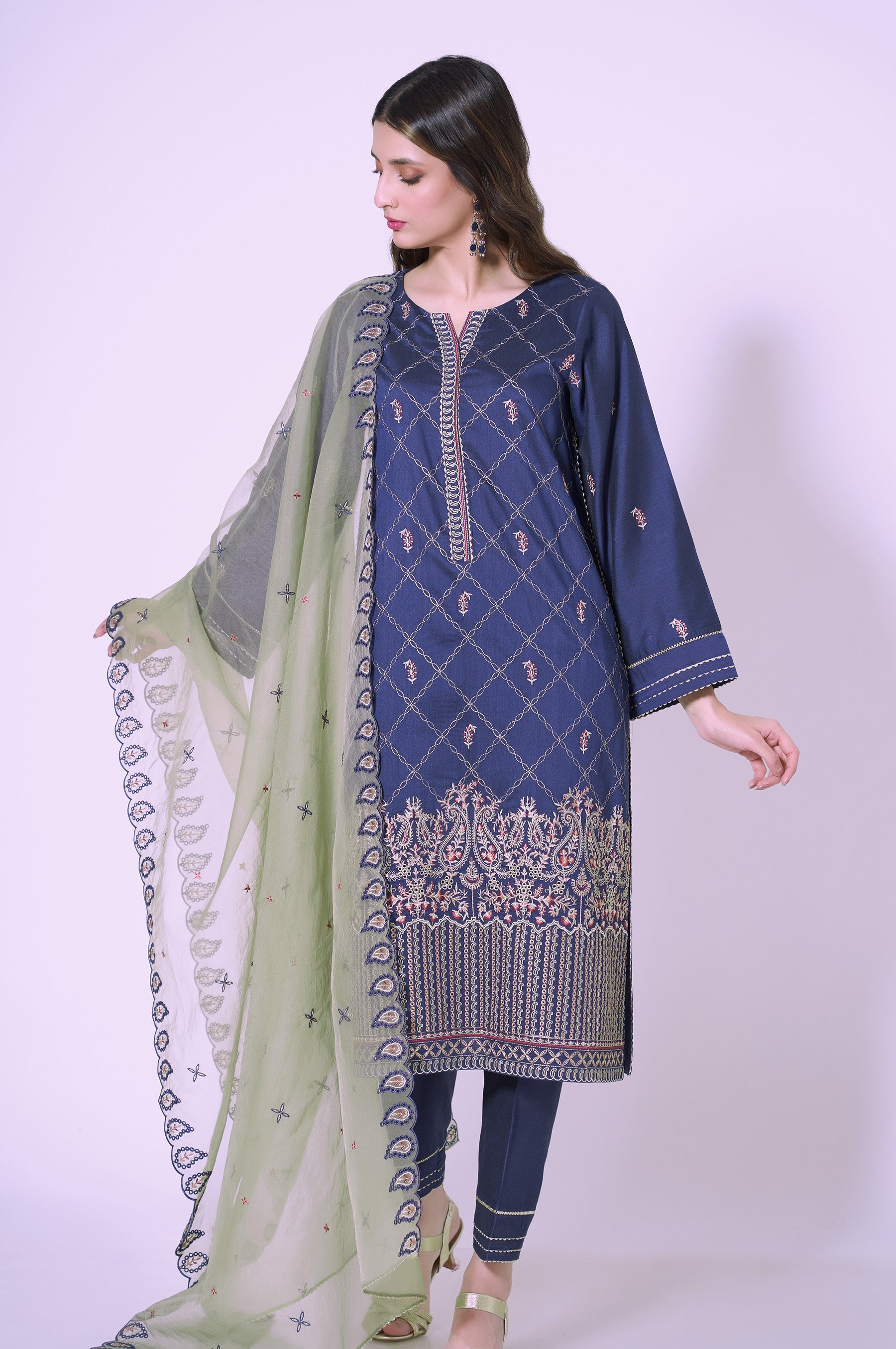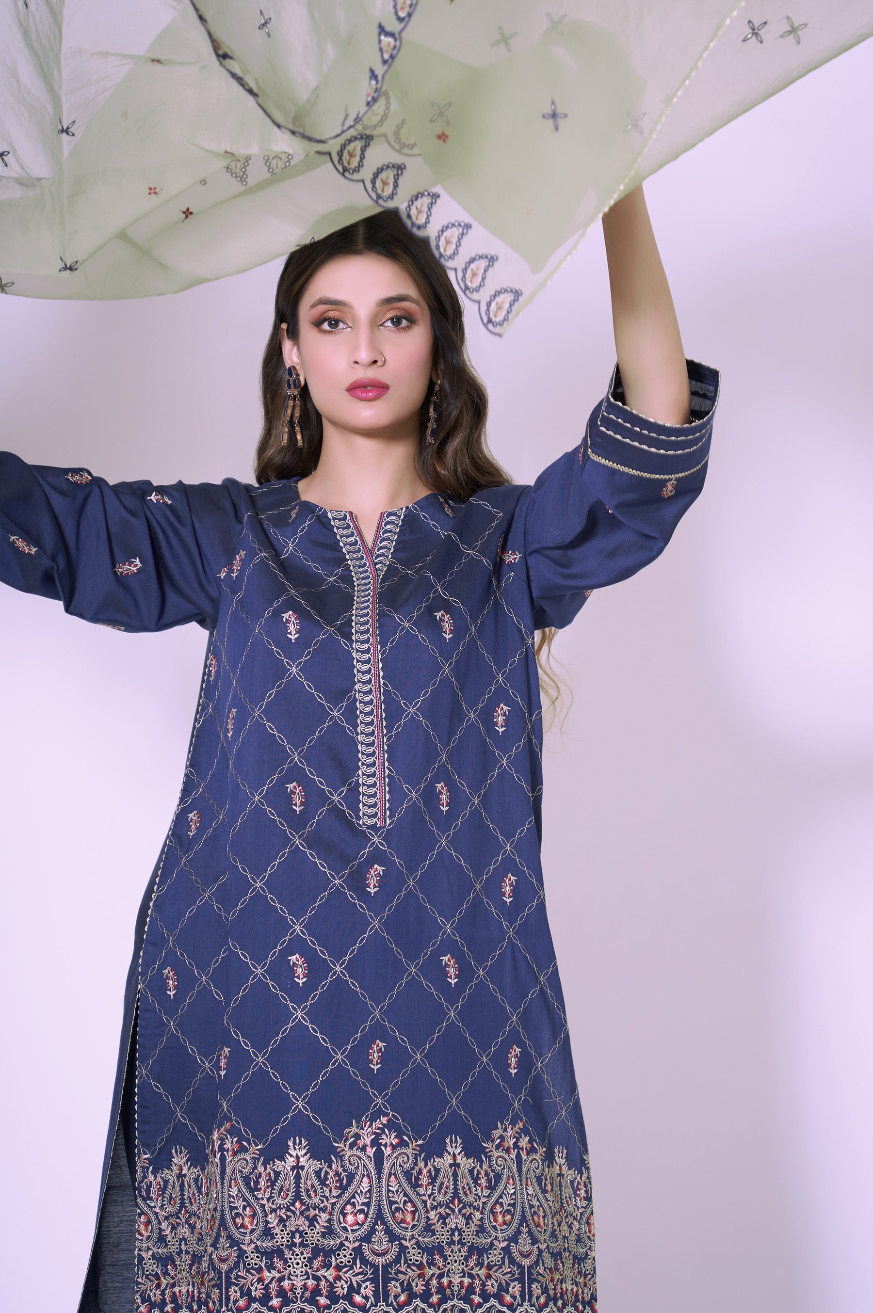 A rich design that features a royal blue canvas with heavy embroidered blooms & paisley rendered in incandescent hues of beige, sage, and tints of red. The shirt is hemmed with heavy paisley floral embroidery with a contemporary neckline paired with contrasting mint green organza eyelits dupatta. The design serves as the ultimate look to make a classice entrance in formal gatherings.