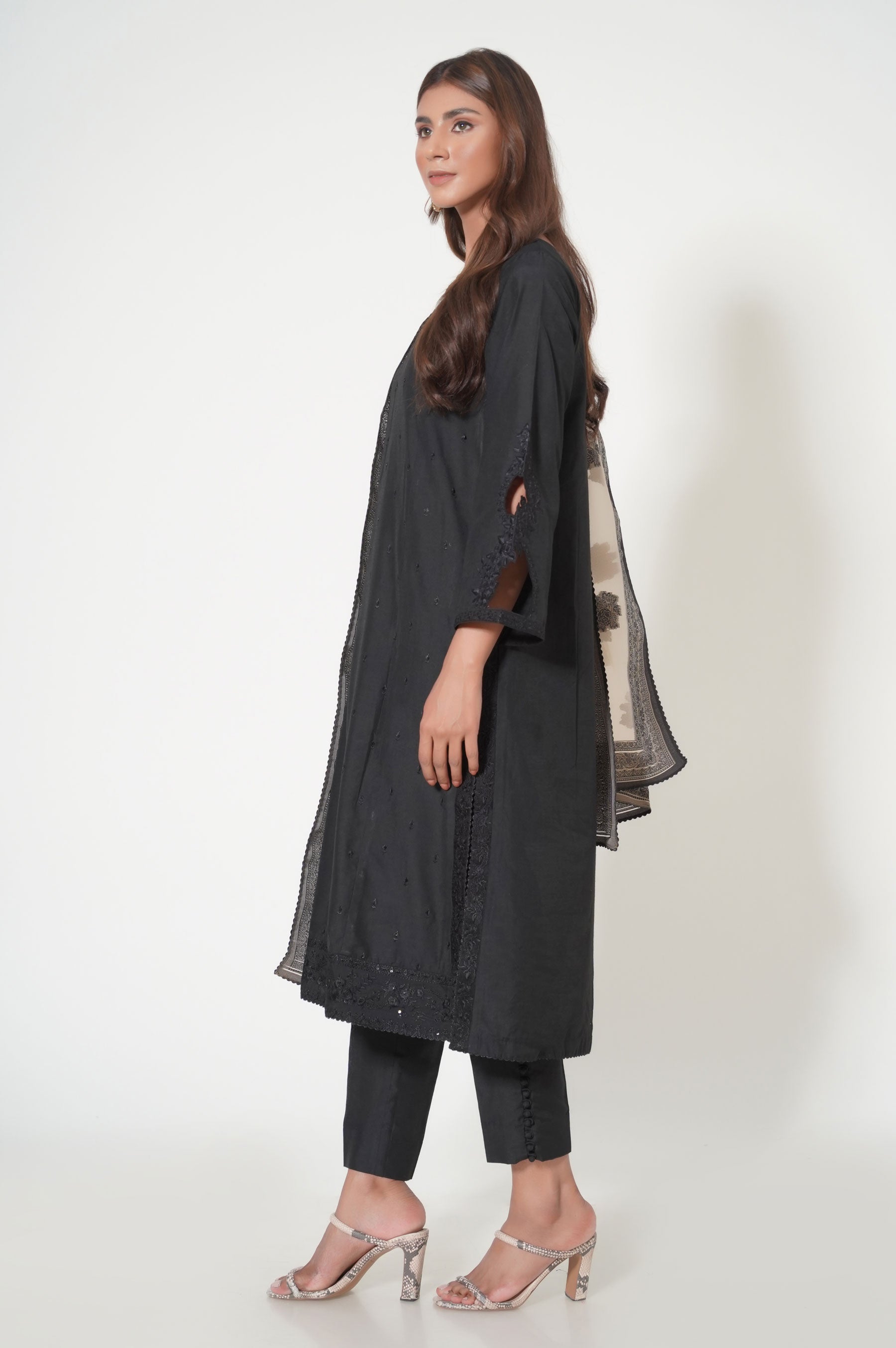 A beautiful composition layered over this black ensemble, featuring a straight silhouette with exquisite sequins embroidery on the shirt, inspired by vintage rosettes. Paired with a golden net jacquard dupatta, this 3pcs-unstitched outfit is a pure example of timeless elegance to embrace this festive season.