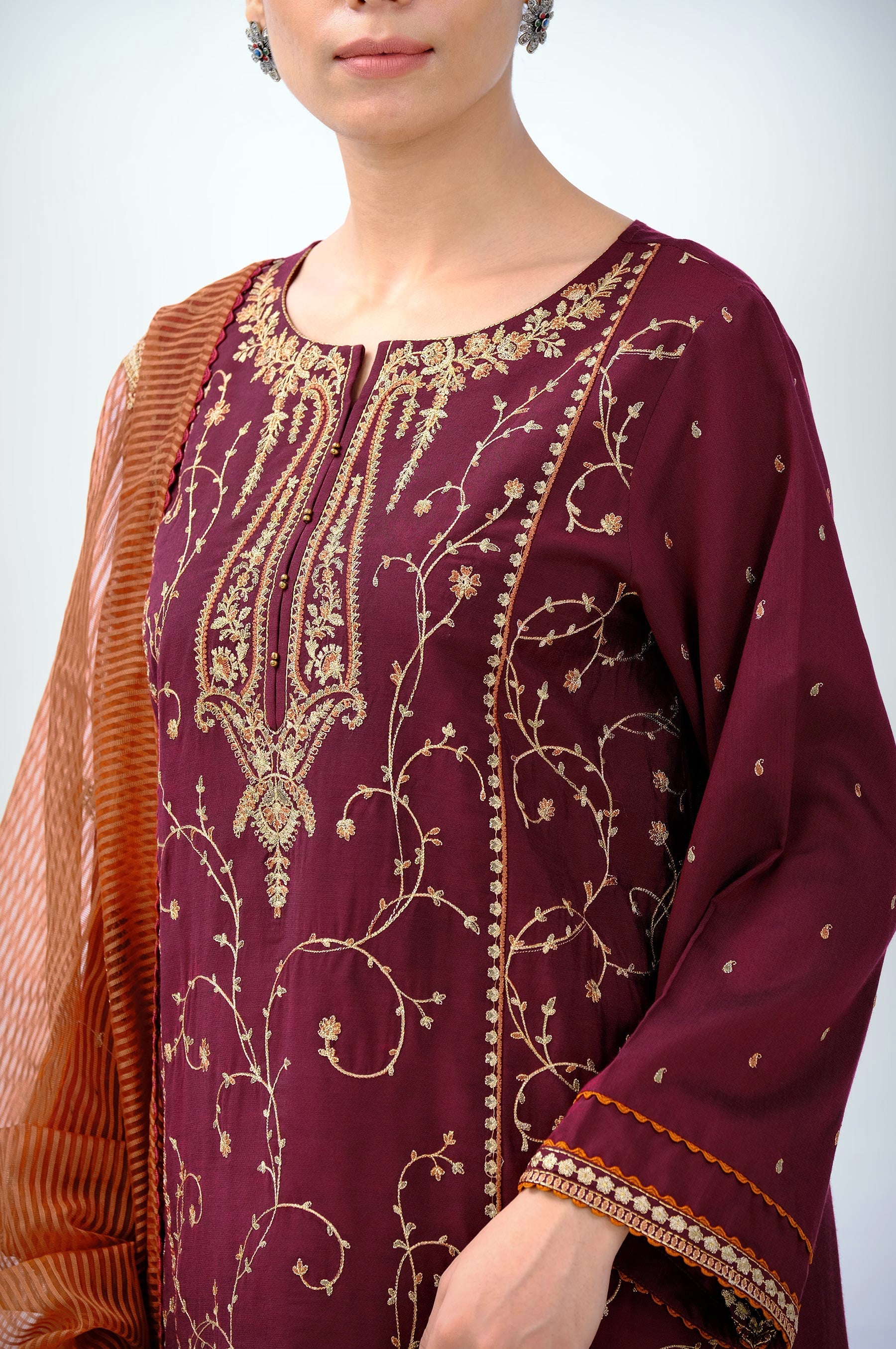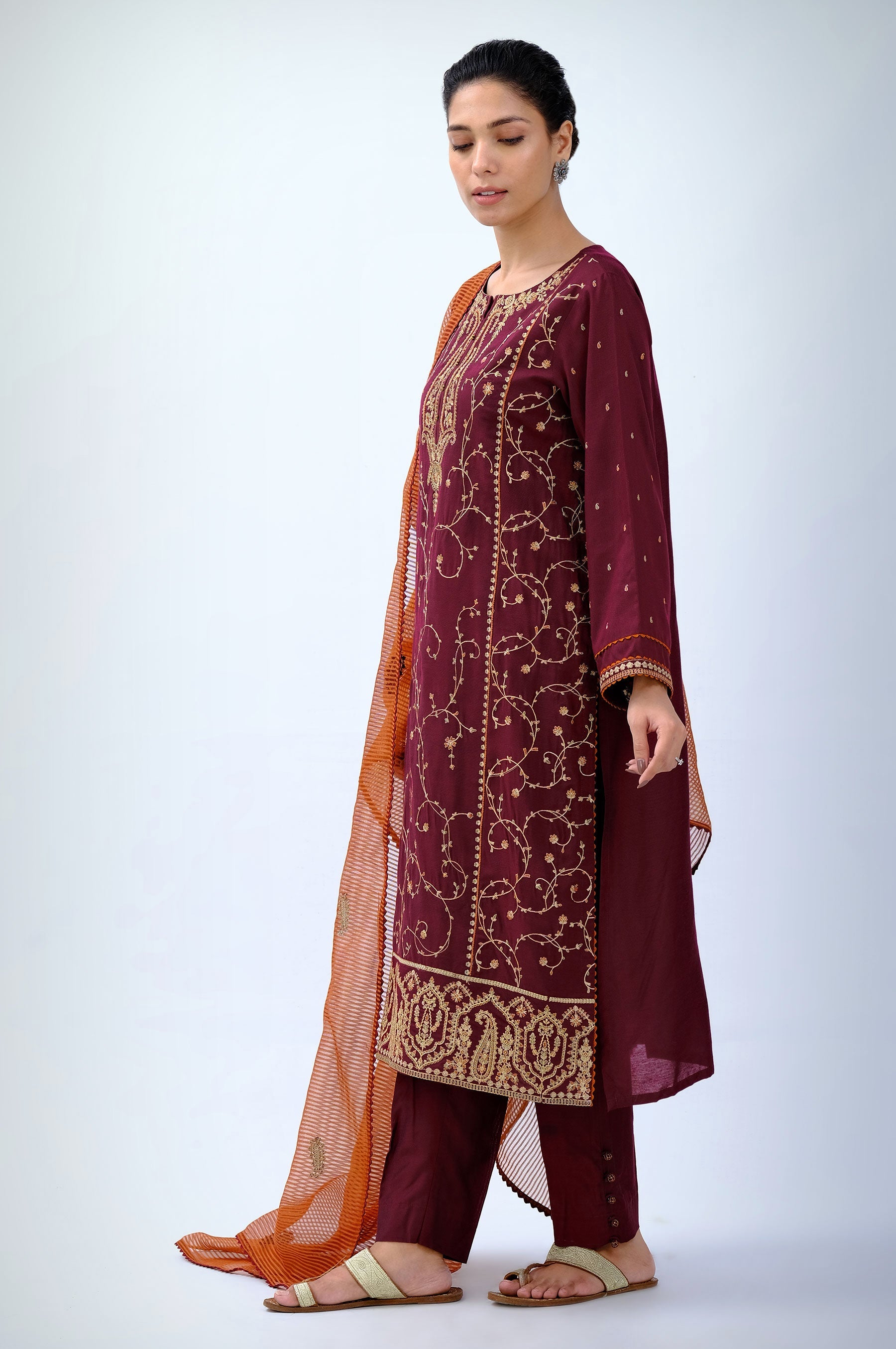 Add a feminine allure to your festive look in this unstitched 3 Piece cotton silk ensemble featuring a Kashmiri shawl patterns with multi colored embroidery on front and sleeves. Paired with raw silk bottom and striped embroidered dupatta. This outfit will make you shine in the crowd.