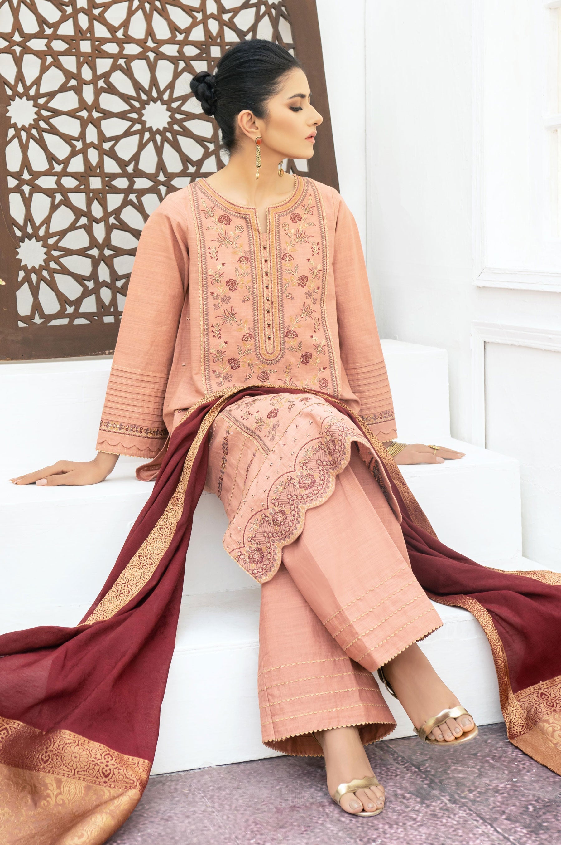 "In a beautiful pink hue, this sophisticatedly elegant design on cotton slub is adorned with floral embroidery at front. Paired with contrast coloured jacquard dupatta and matching pant, this mesmerising three pieces emplifies pure elengance."