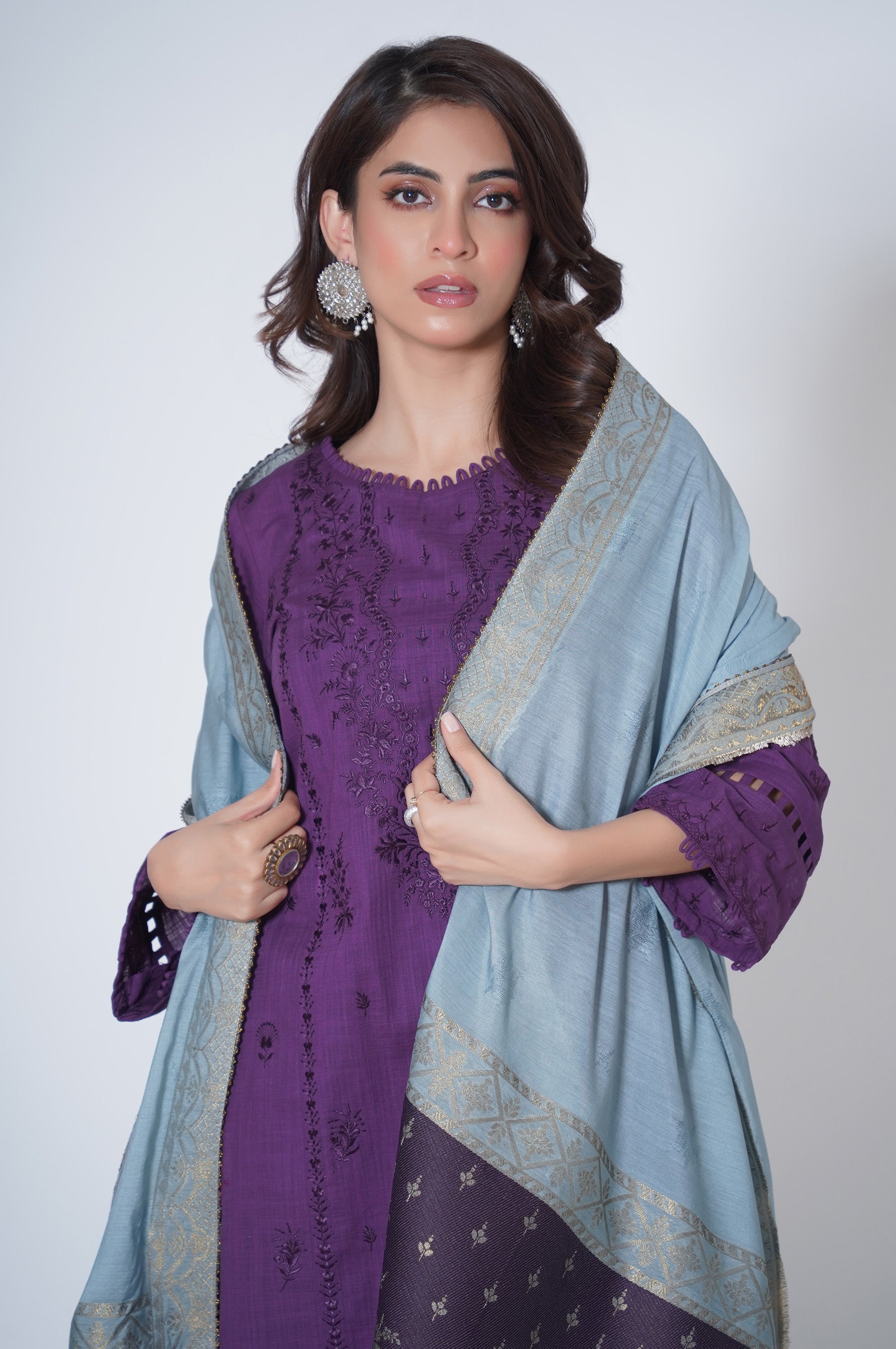 An exquisite design is rendered using ZEEN's signature fine and delicate taankas in Monochrome shade. It is set off by a sumptuous Jacquard Cotton Base shawl adorned with delicate jacquard motifs framed with kingri lace all over. This look is crafted with ultra feminine twists, elevated textured and highly luxurious accent to help float through summer with greatest of ease.