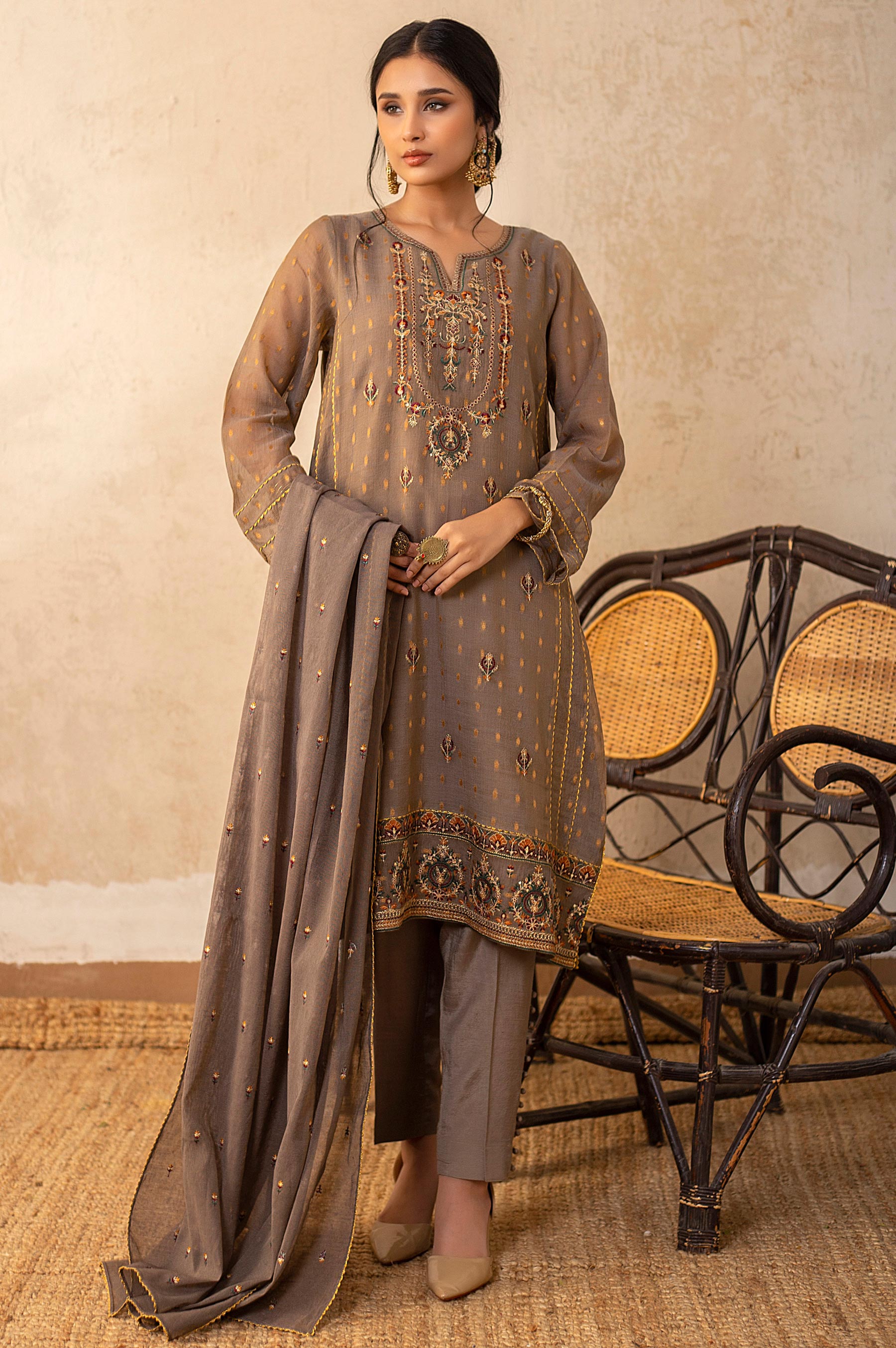 A traditional inspired designs, featuring deep color palette embroidery. Embroidered front with khaddi net all over embroidered dupatta and tonal trouser, this look is an instant classic.