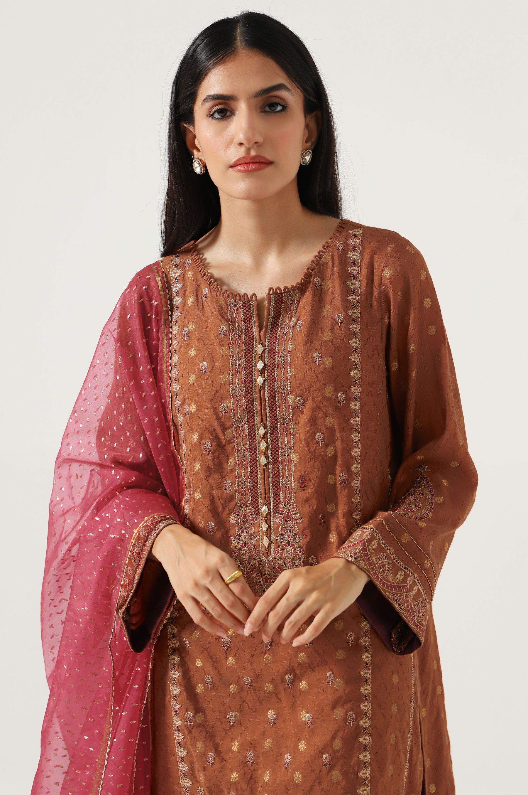 Create an ethnic look with this winsome embroidered ginger rust shirt on an jacquard base with resham work and zari. The contrast lorex organza dupatta adds elegance and is the best pick this season.