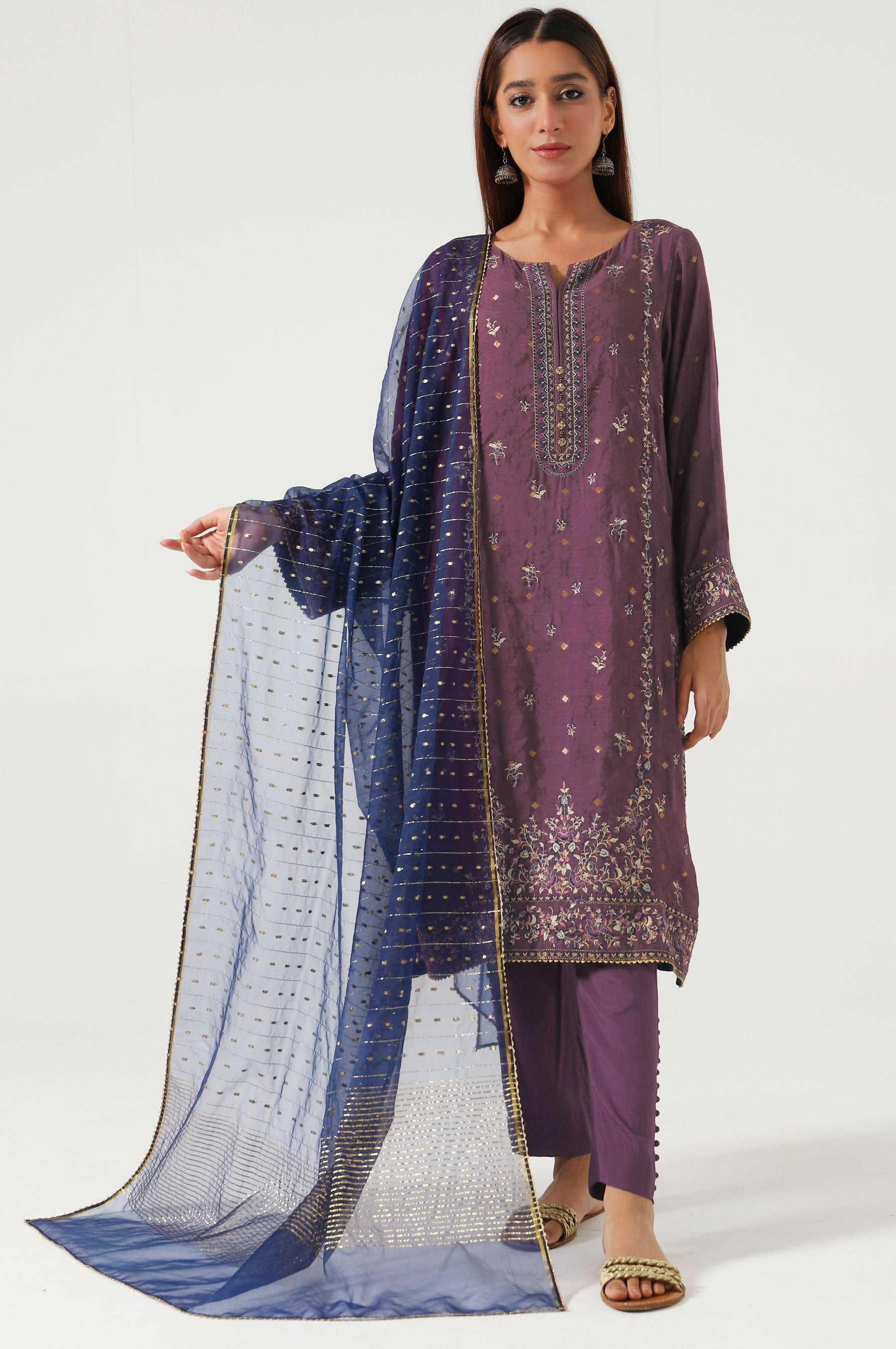The secret to allure minimalistic look is just to style up with this morrocan self-jacquard embroidered purple shirt with contrasting blue woven gold zari dupatta. This timeless piece will add glamour to wardrobe.