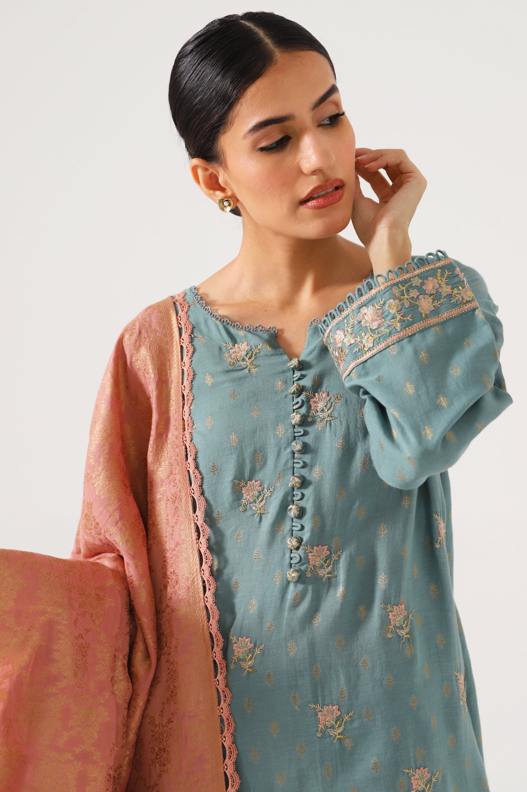 Flaunt your unique style in this 3pc unstitched cotton jacquard ensemble. Paired with contrast powder pink dupatta, this ensemble has embroidered front and sleeves inspired by vintage rosettes.