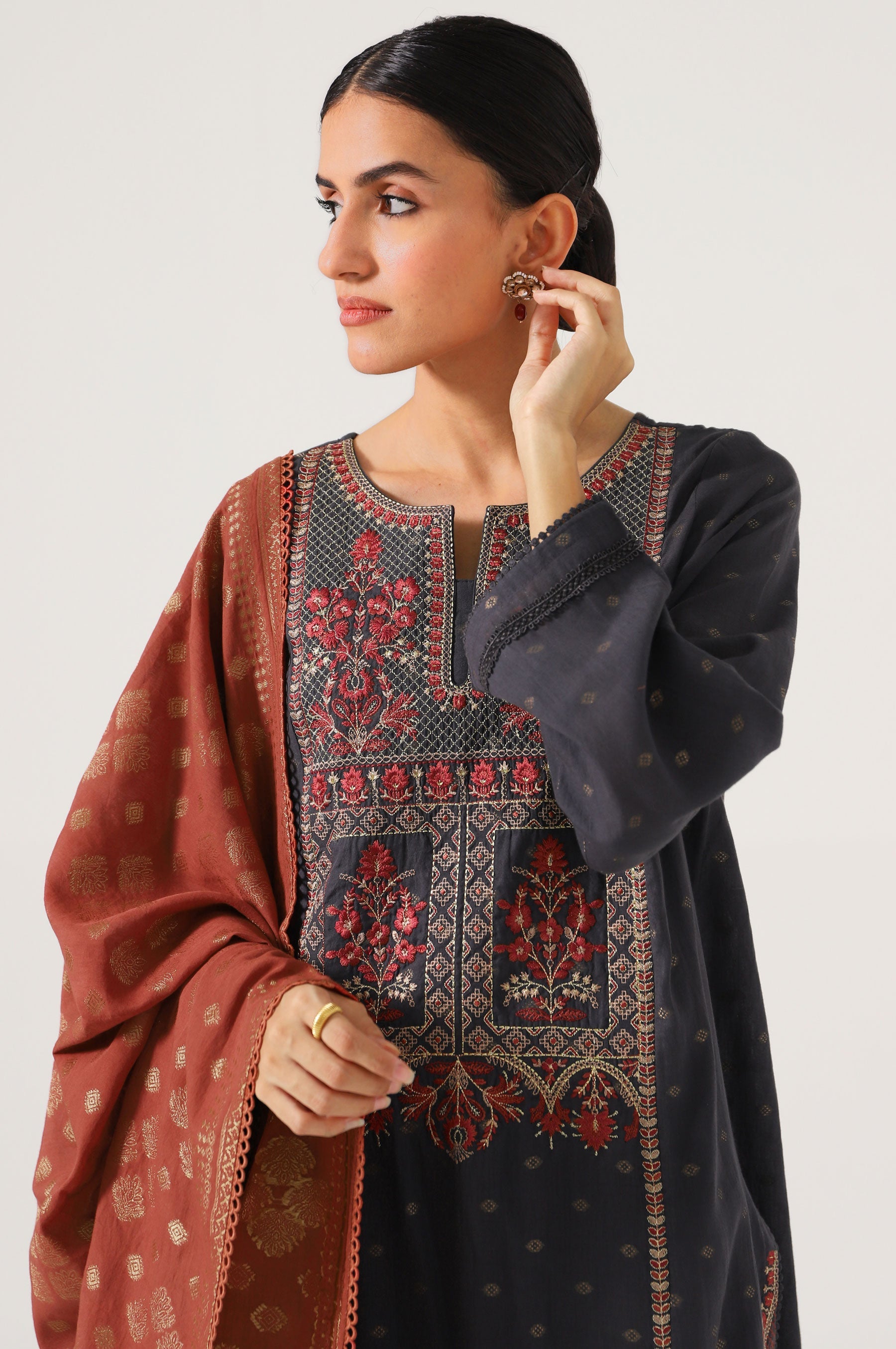 Look like a vision of beauty in this unstitched 3-piece outfit in coral and grey, with a versatile jacquard shirt and a mesmerizing jacquard dupatta. The bold neckline and cutwork inspired embroidery on front and side panel adds the dramatic flare to the ensemble.
