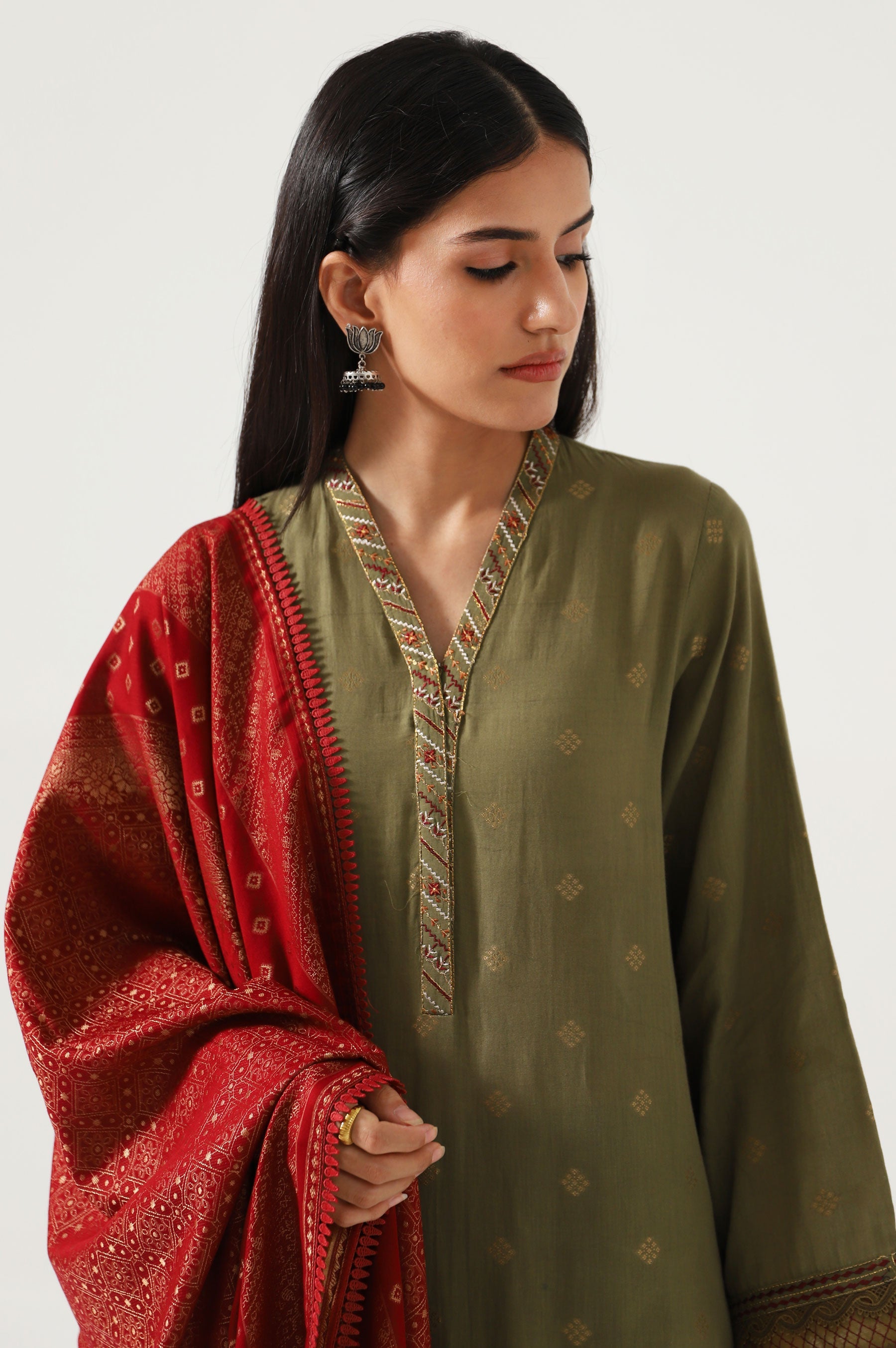 Stand out in this 3pcs jacquard ensemble artfully rendered with an exquisite embroidery on front daman, placket and sleeves. Paired with a ruby pink contrast colored dupatta, this breathtaking piece will bring a unique style to your timeless collection.