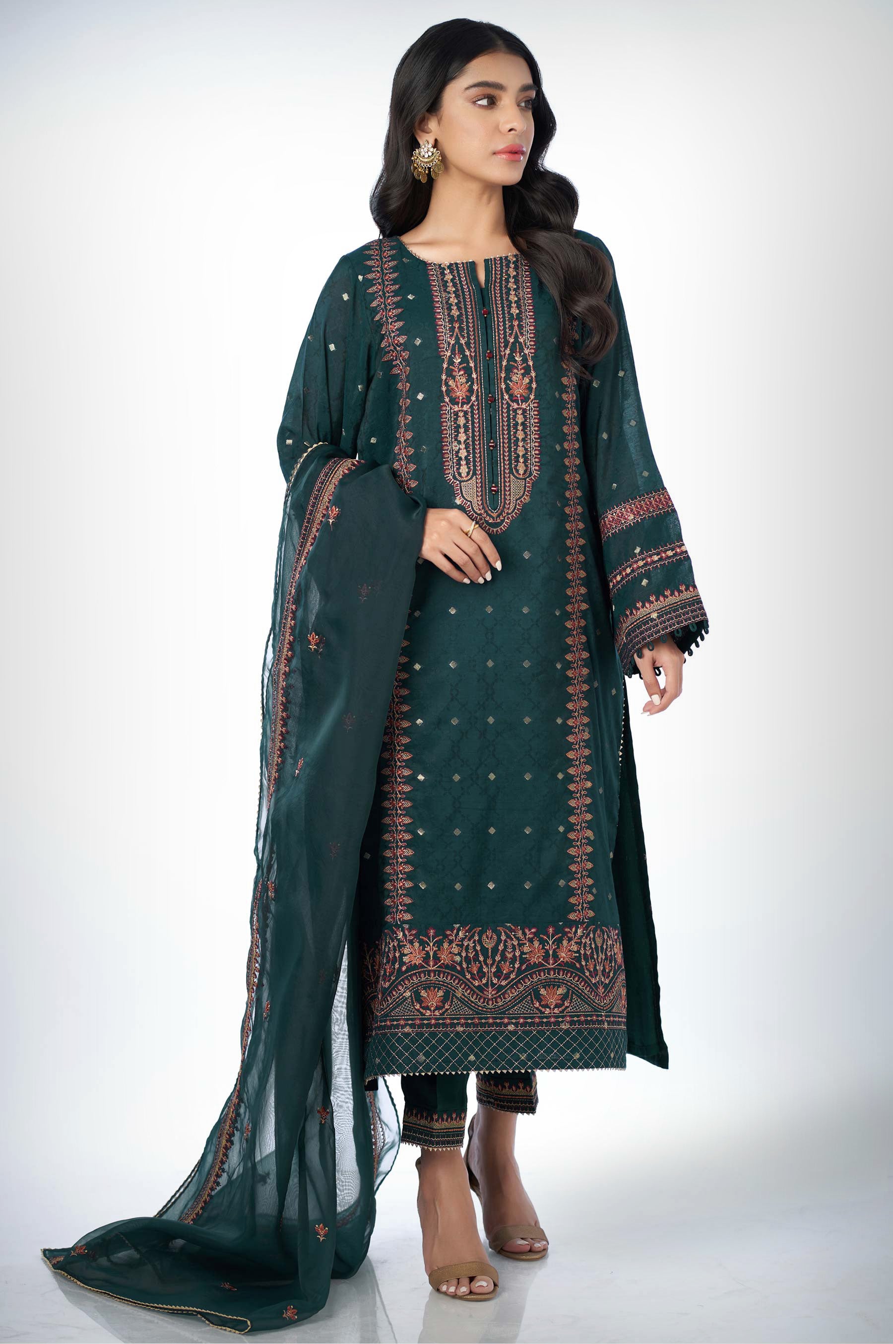 This 3 Piece unstitched jacquard teal blue canvas is set off with flawless paisleys, portraying a mesmerizing hue of ivory, purples and rust. Inspired by Kashmiri patterns, this design is complemented by a detailed border embroidered with dainty elements beaming with gold thread. Paired with silk dupatta and raw silk bottom, this makes a look that is truly captivating.