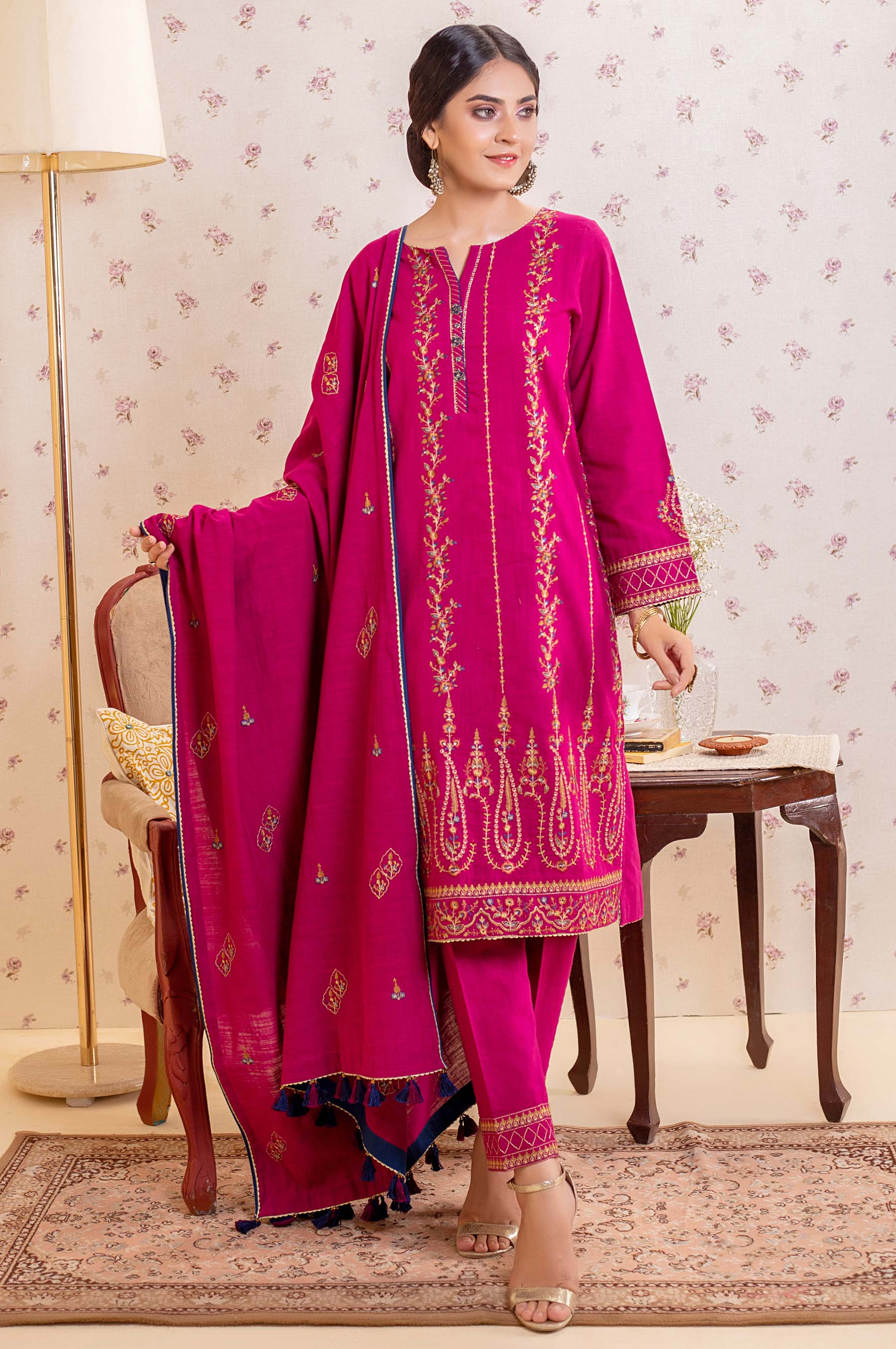 This Unstitched 3-pcs khaddar ensemble rendered in a gorgeous fuchsia color, features delicate floral embroidery in deep palette. Paired with embroidered dupatta and bottom, this will give your wardrobe a breath of fresh air.