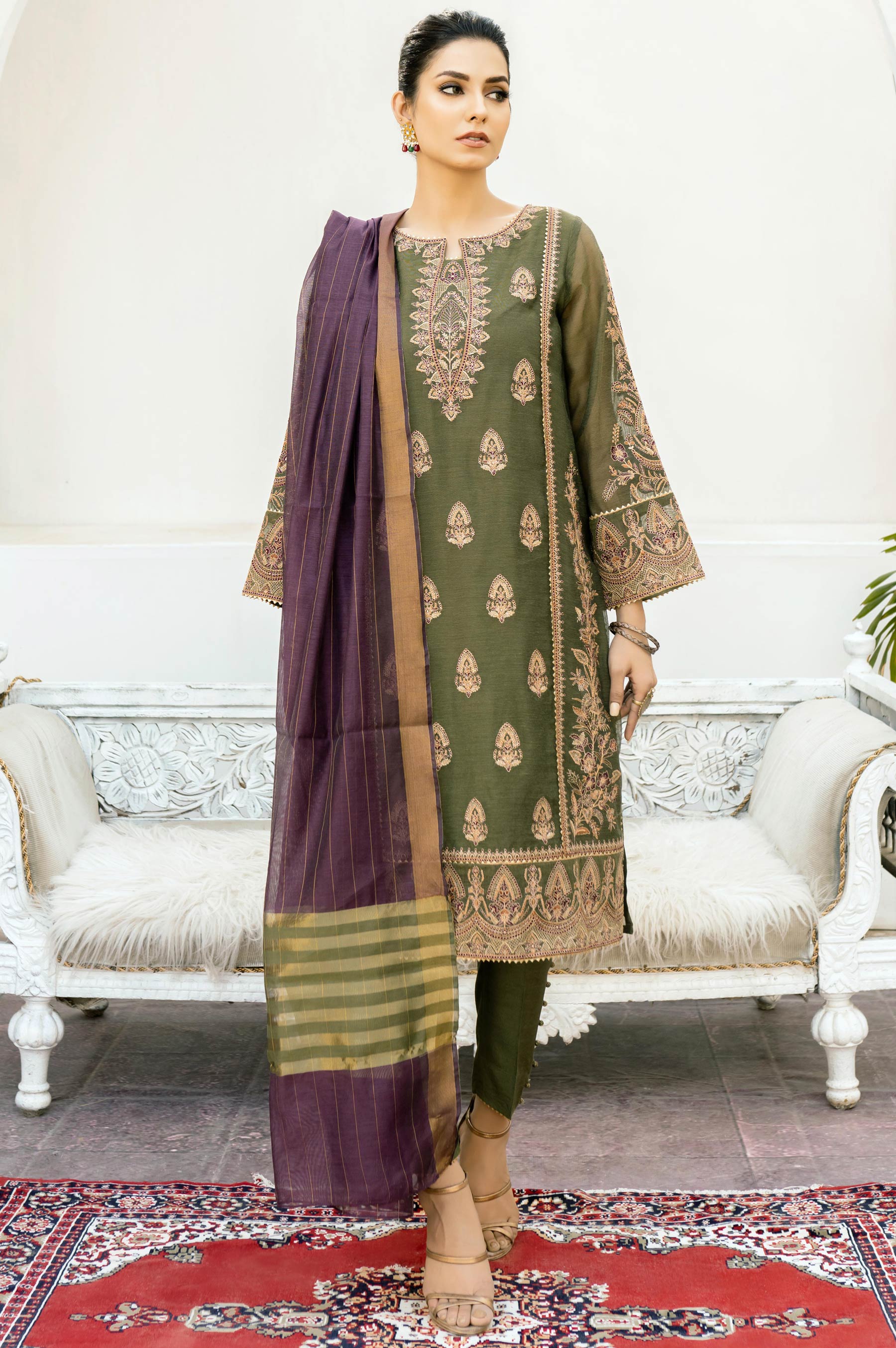 "Make a bold statement this season in this majestic green, adorned with tribal ebroideries in shades of purple and gold. Paired with a beautiful striped contrast dupatta and rawsilk pant, this elegant design is sure to keep you gorgeous in all events."