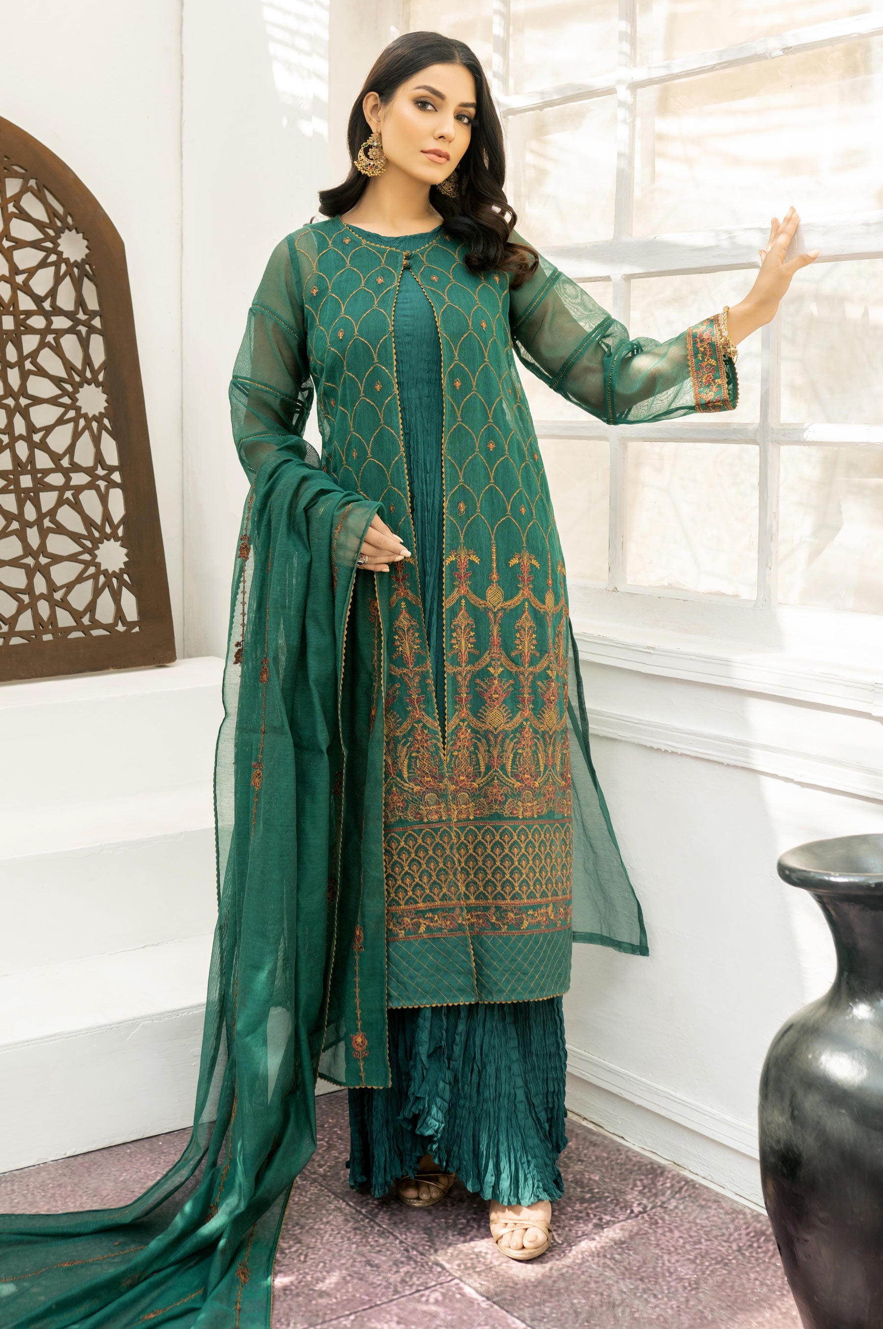 Inspired by baroque patterns, this captivating design is layered over this mermerizing forest green color ensemble. This 3pcs unstitched khadinet is enriched with intricate embroidery on front and paired with embroidered dupatta. The sophisticated outfit is a versatile option to style at formal events this season.