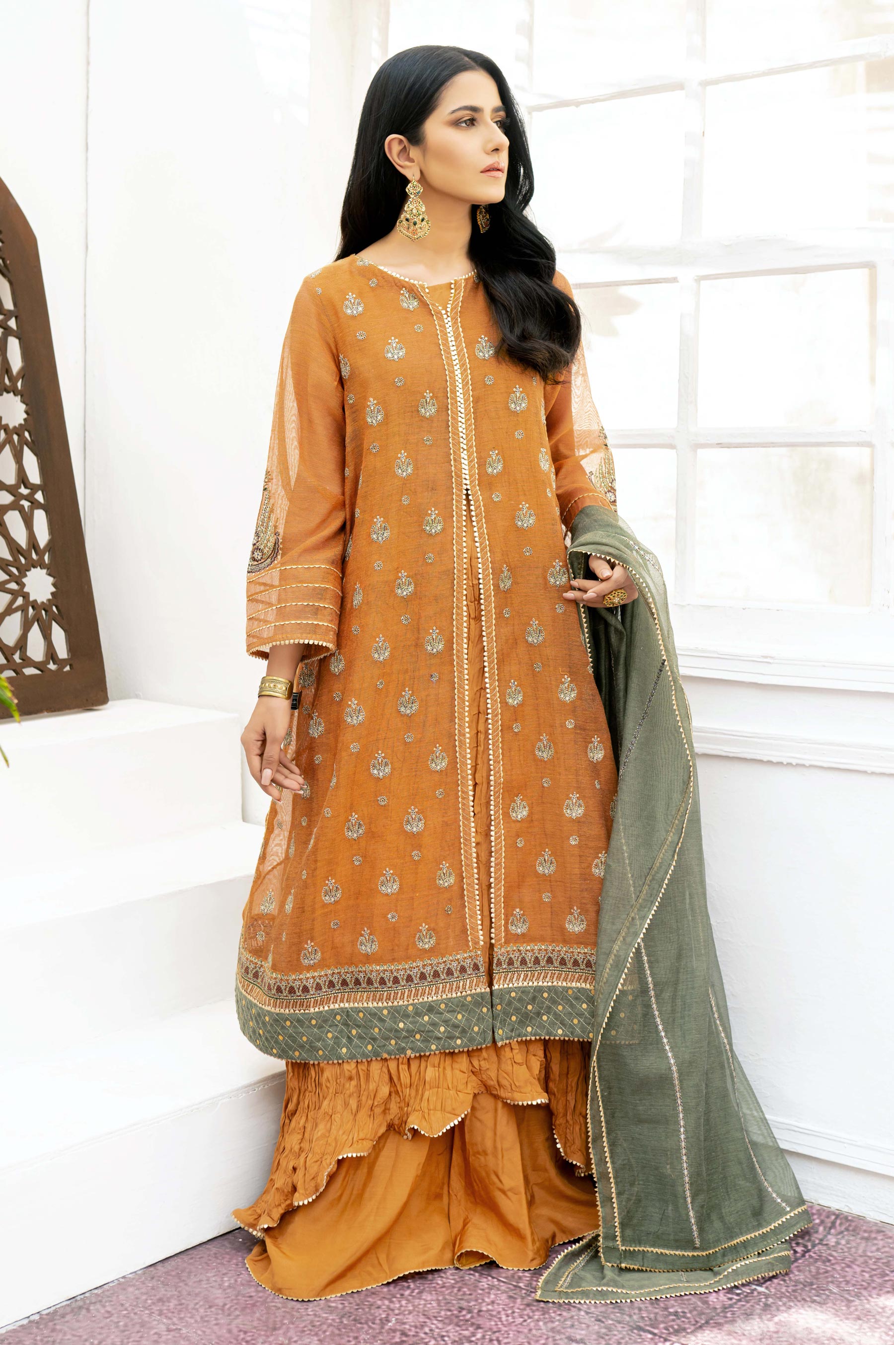"This Beautiful elaborated outfit depict sparkling sequins ornamentation on a khaddi net three pieces with intricate embroidery. Paired with a gorgeous embroidered contrast dupatta and rawsilk pant, this versatile formal outfit is a fool proof look for evening festivity."