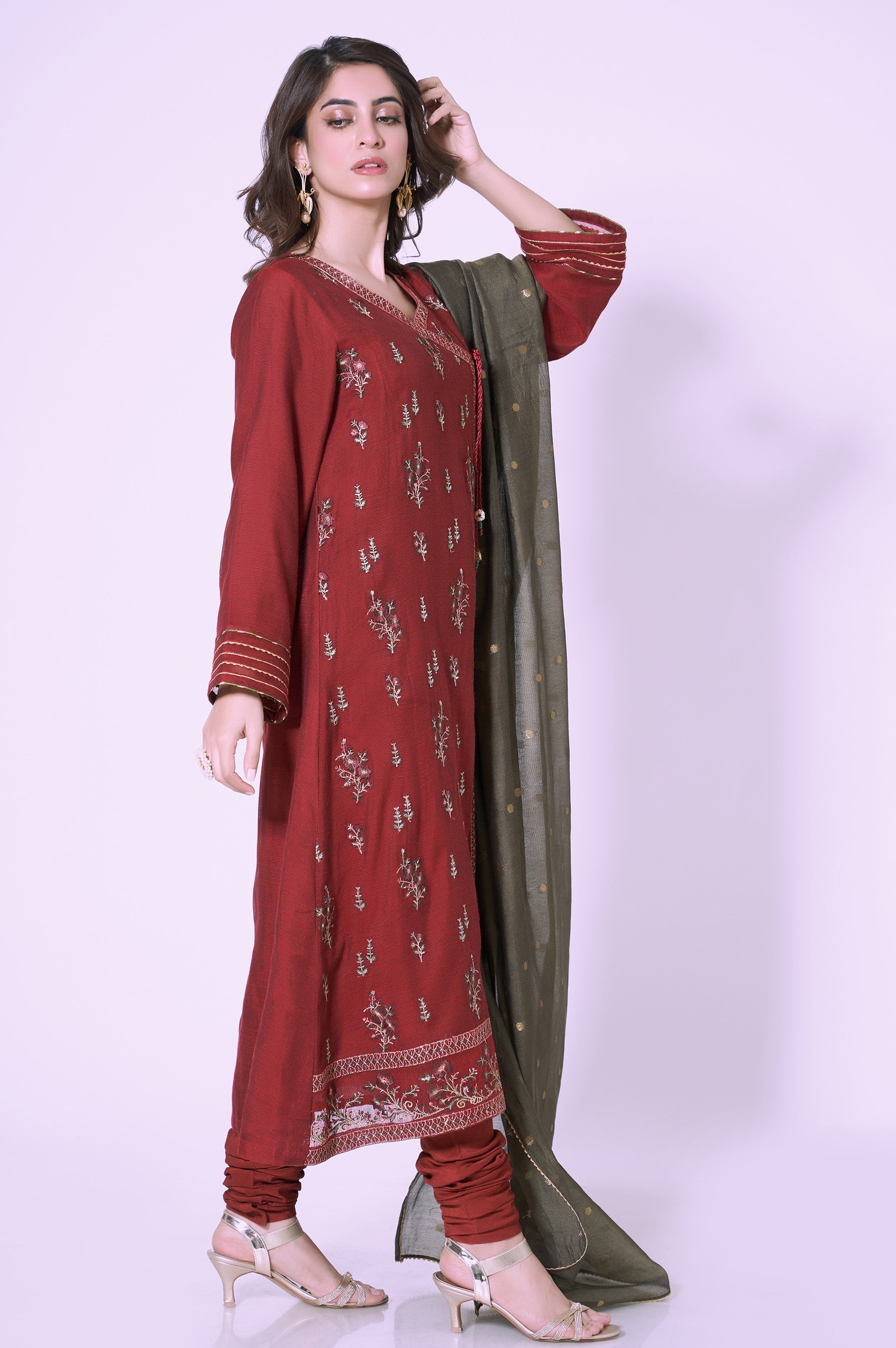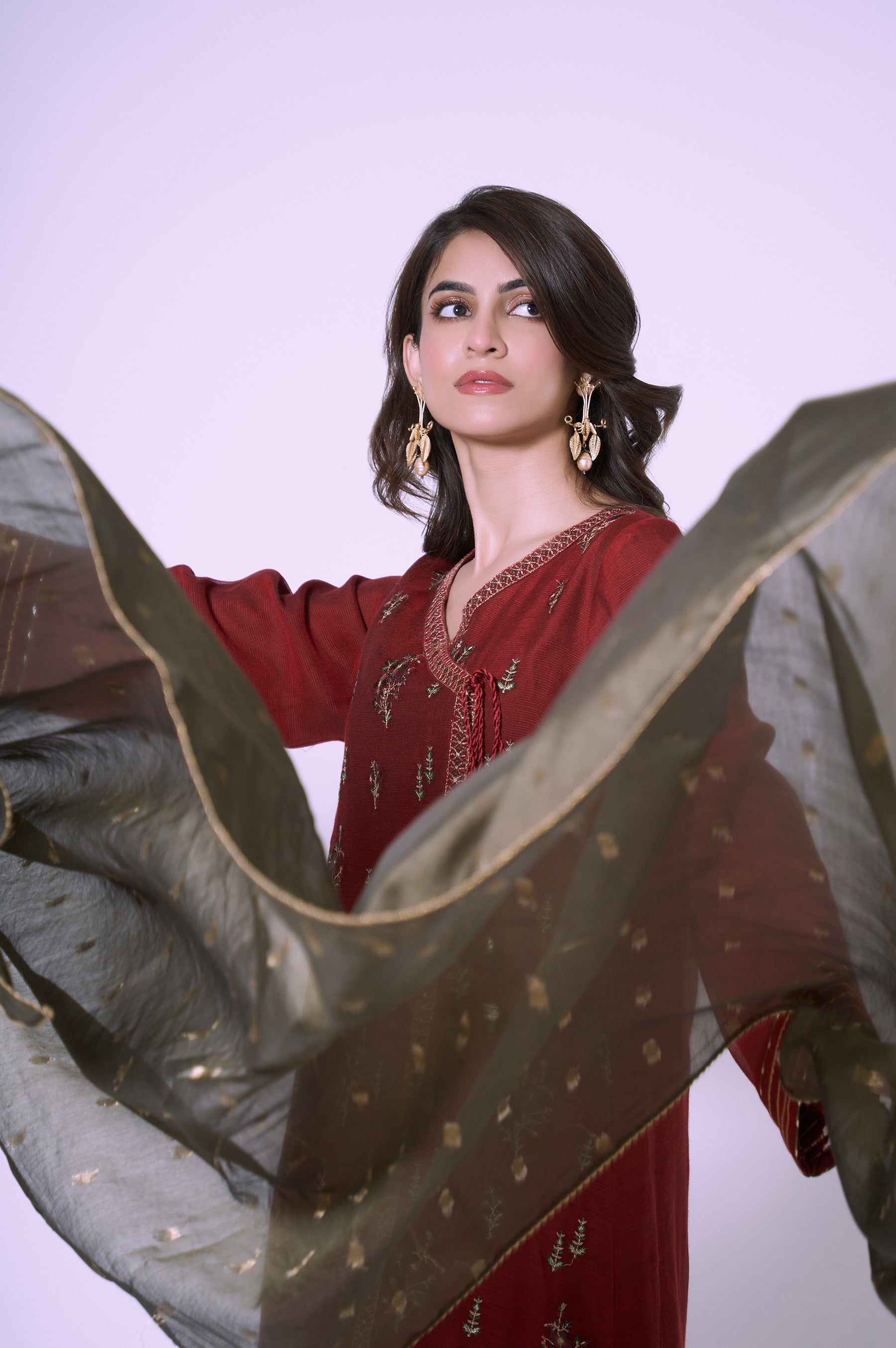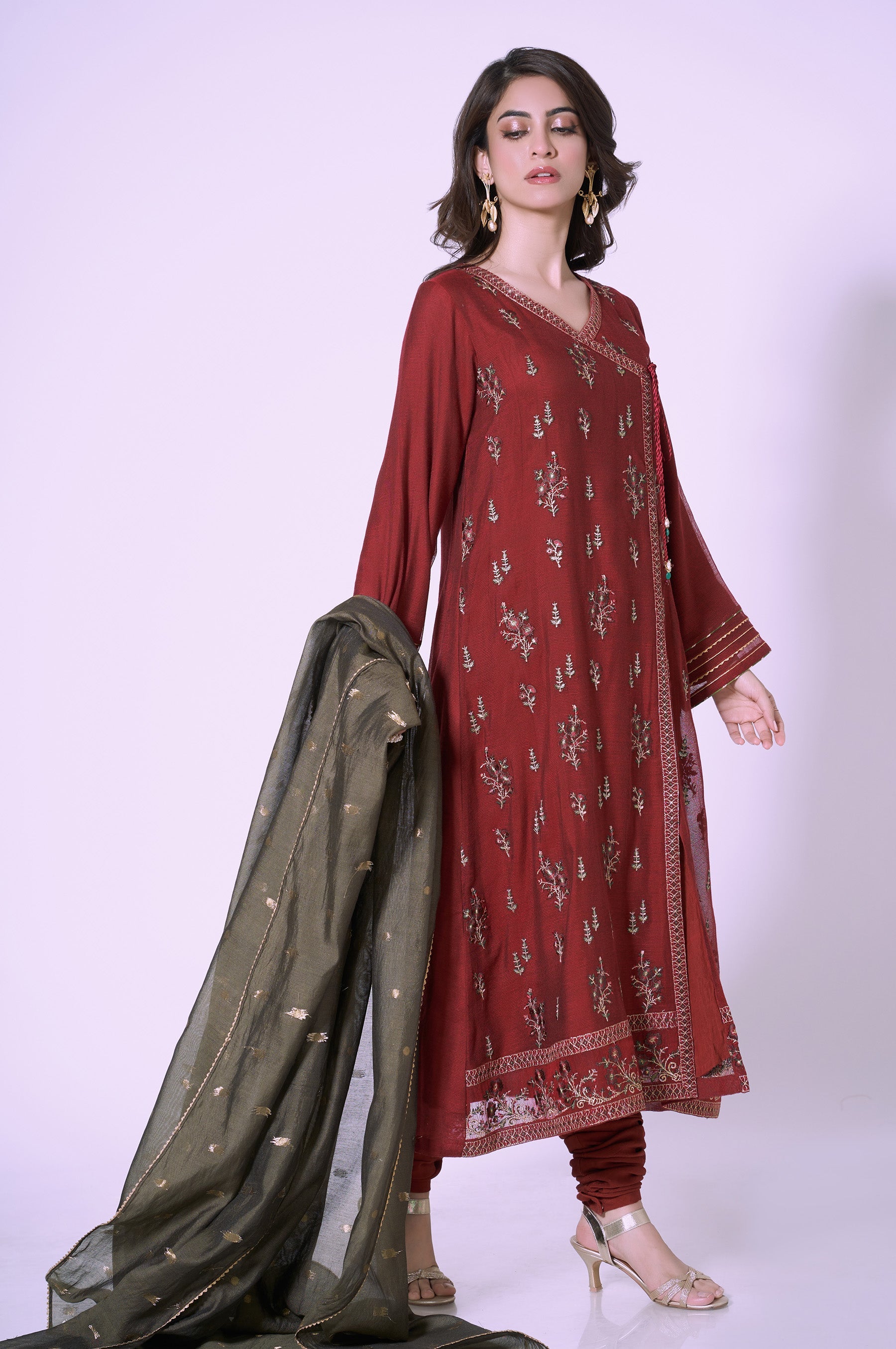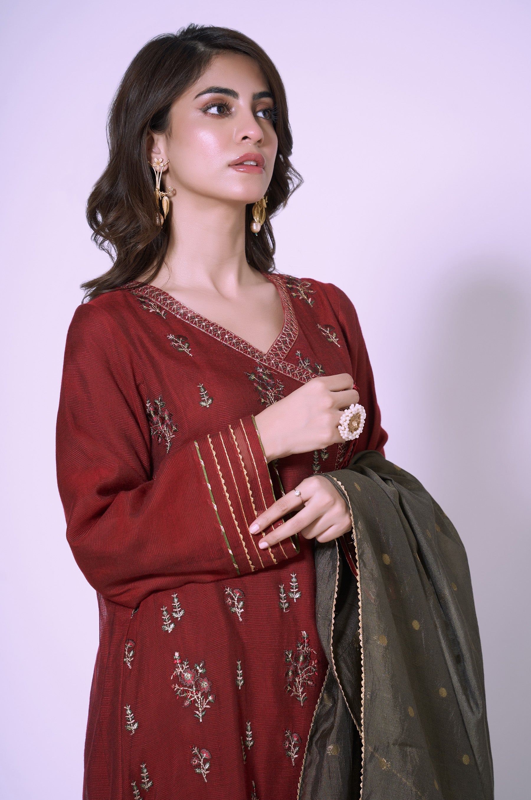 A rich design features a deep red canvas with delicate traditional embroidered blooms. The angrakha style shirt is hemmed with floral embroidery with contrasting khaddinet dupatta and rawsilk bottom.The design serves as the ultimate look to make a grand entrance this festive season.