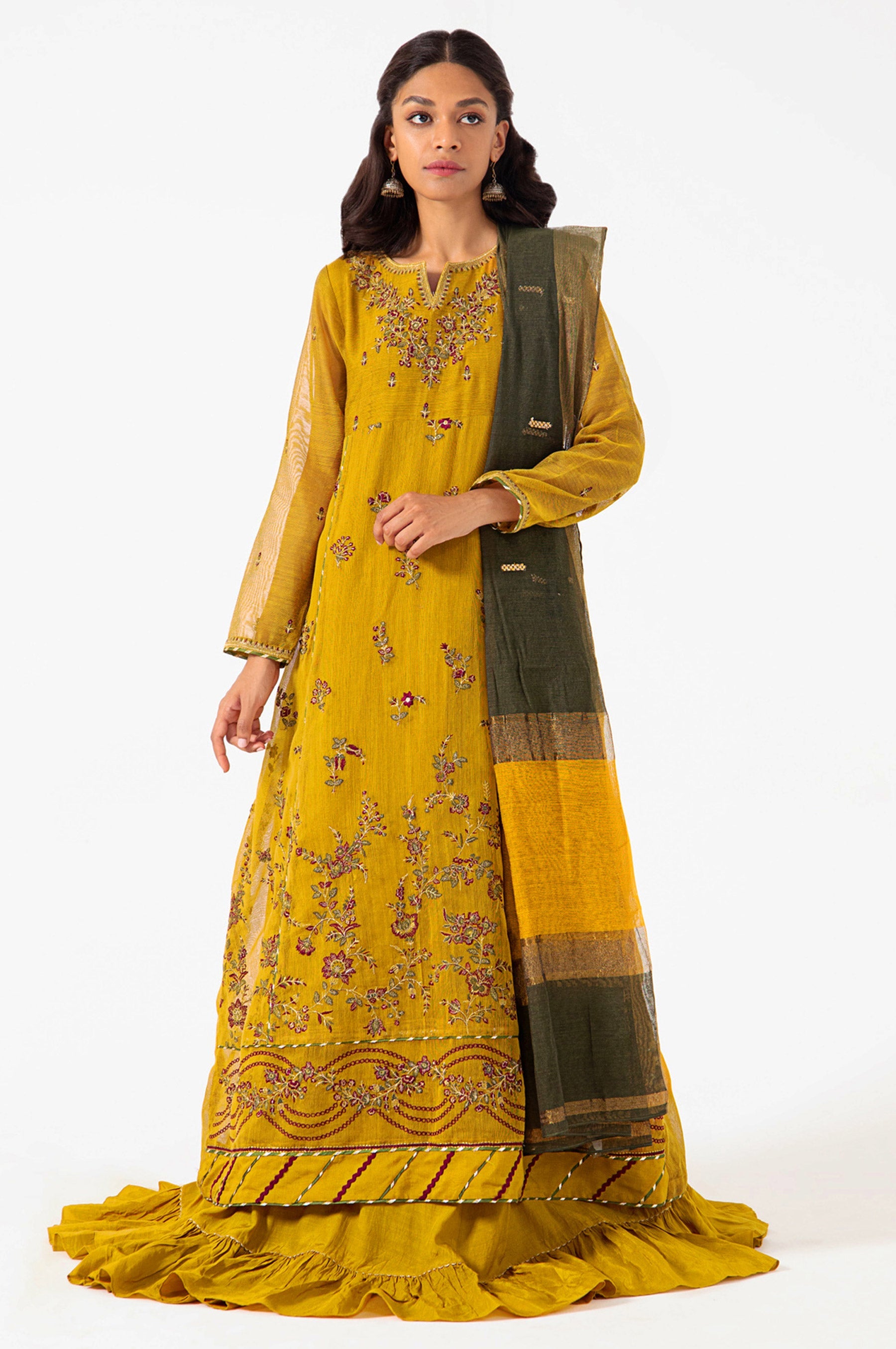 This 3pcs khadi net voluminous ensemble features an exquisitely embroidered inspired by botanical floral. Paired with an embroidered khadi net dupatta, this glamourous outfit is a great option to look marvelous at formal gatherings.