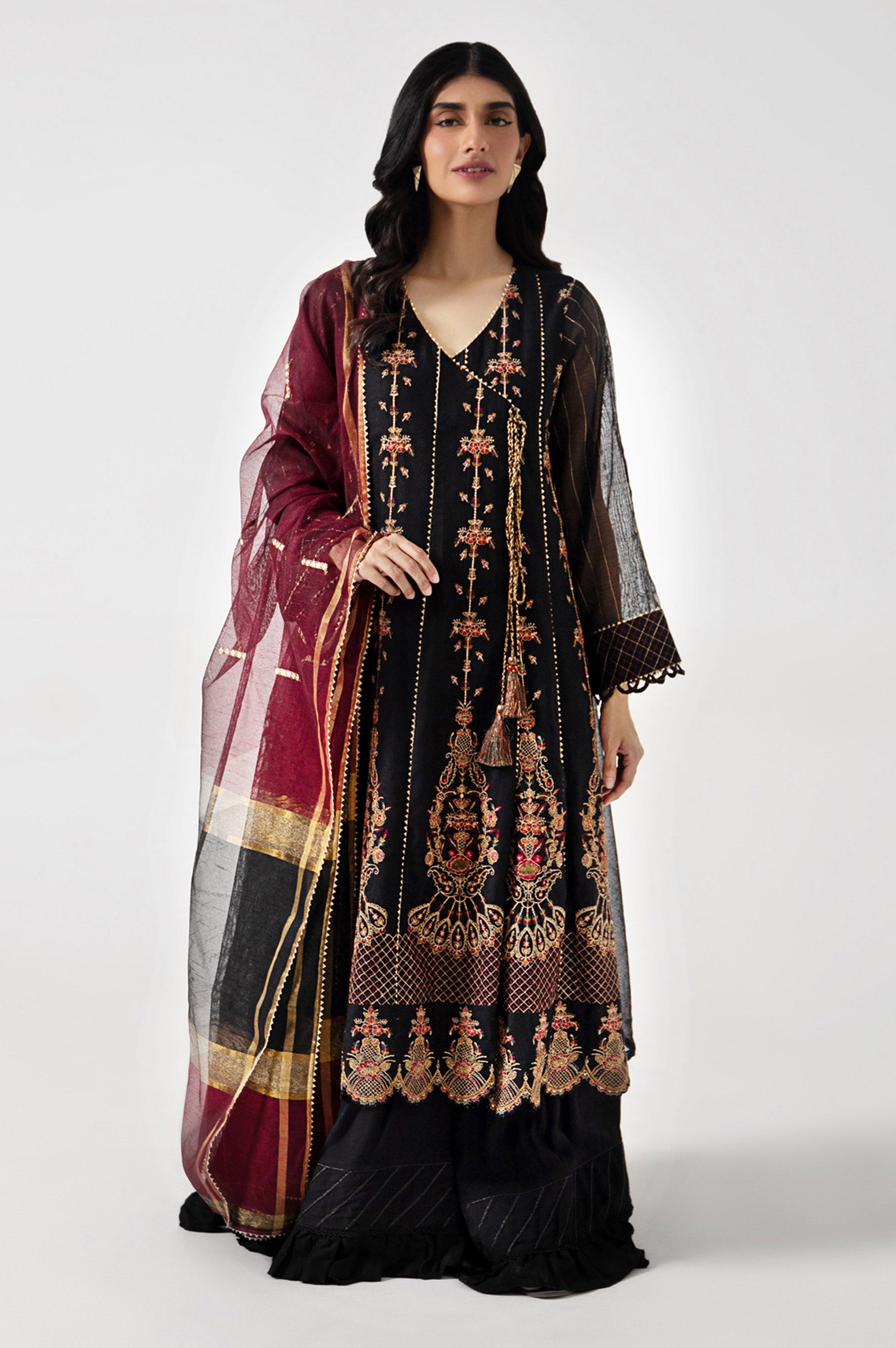 A scintillating composition is portrayed on the mesmerizing khadi net angrakha rendered in red and orange hue. This exquisitely crafted 3pcs unstitched beautifully adorned with intricate floral embroidery at front. This granduer outfit is paired with woven zari dupatta tpo embrace at festive occasion this season.
