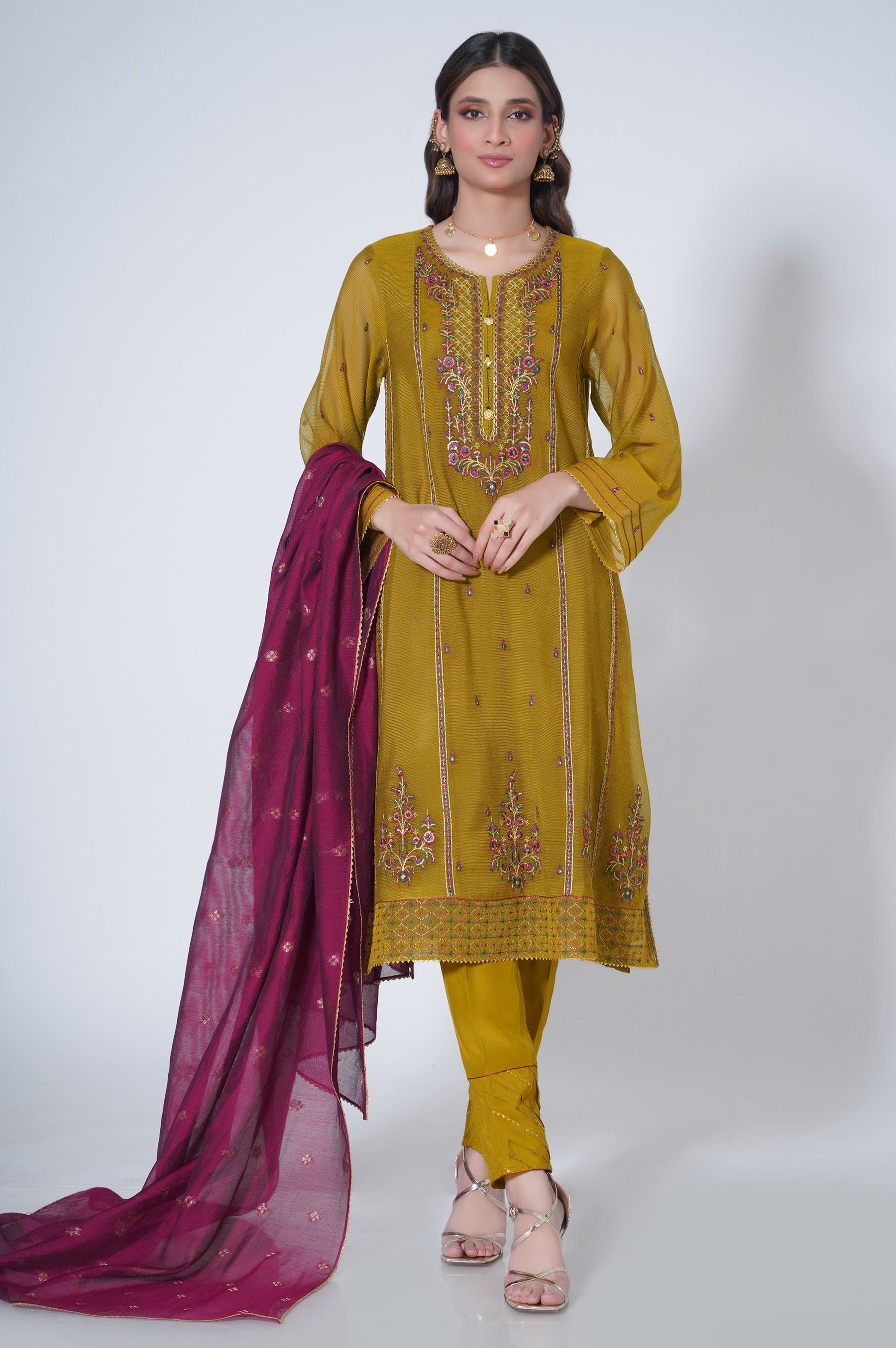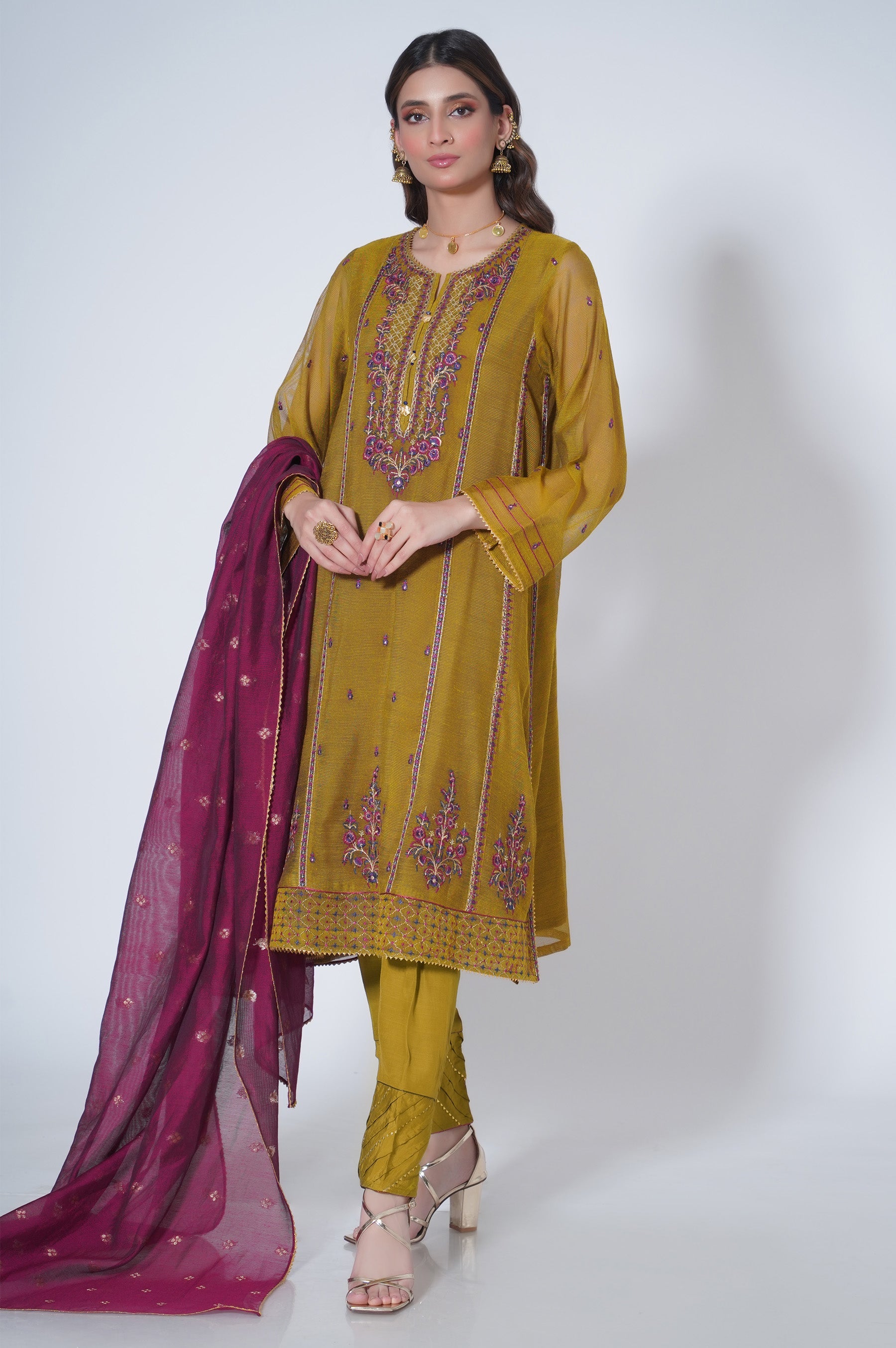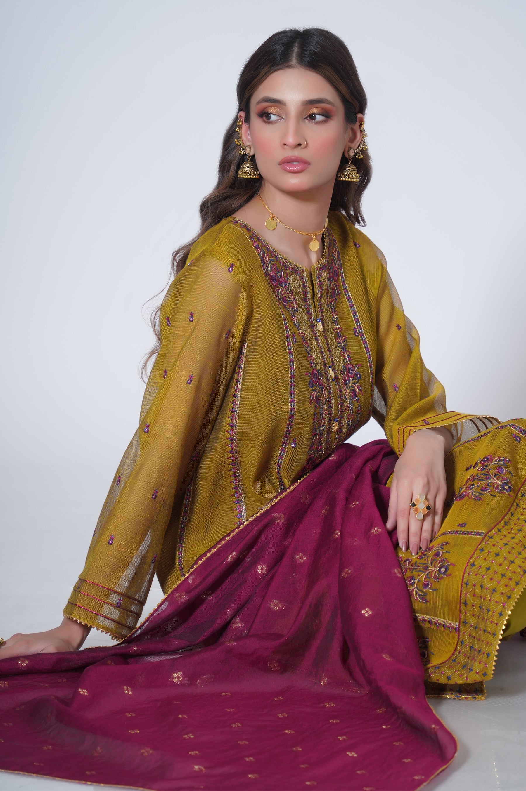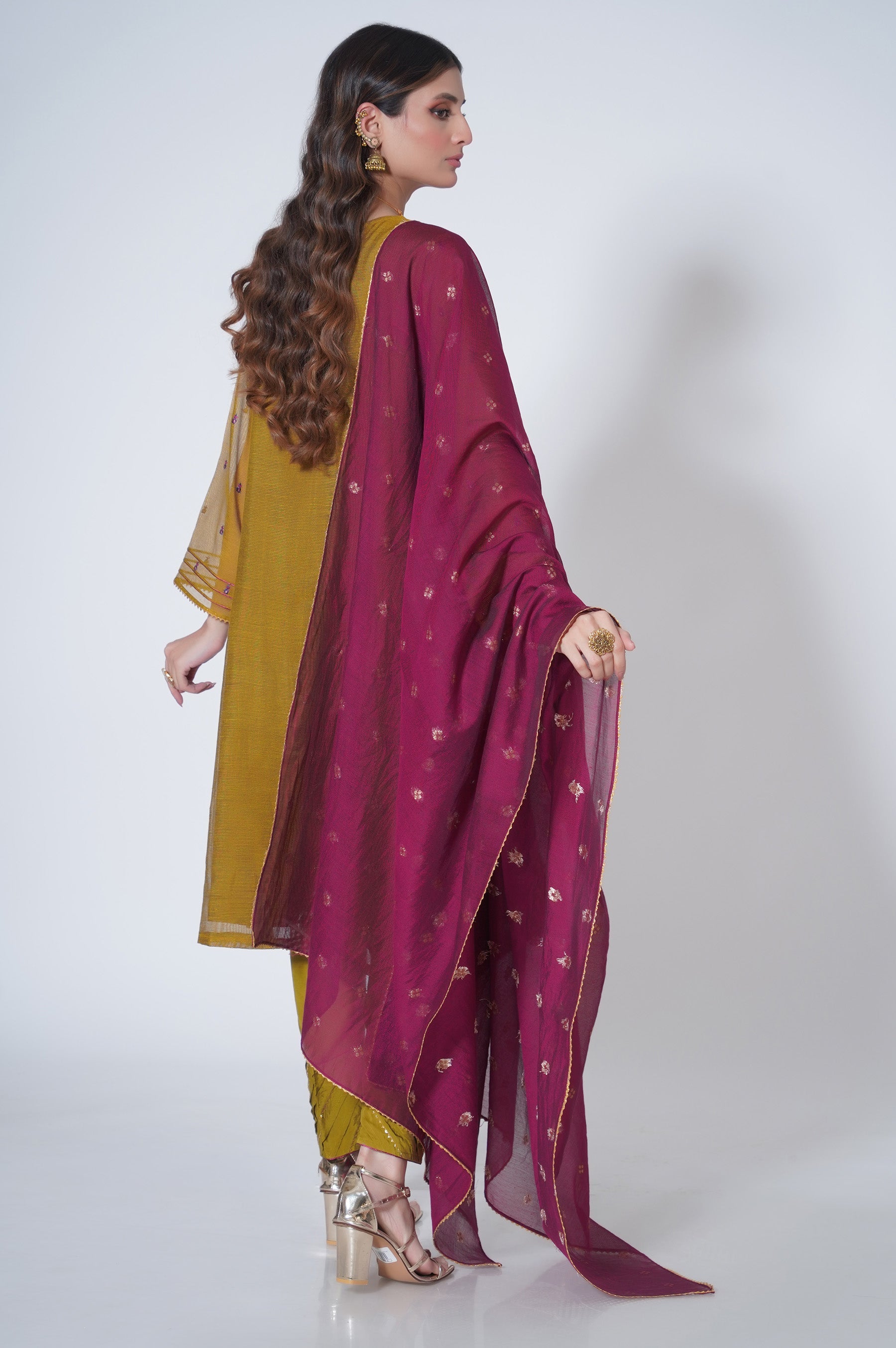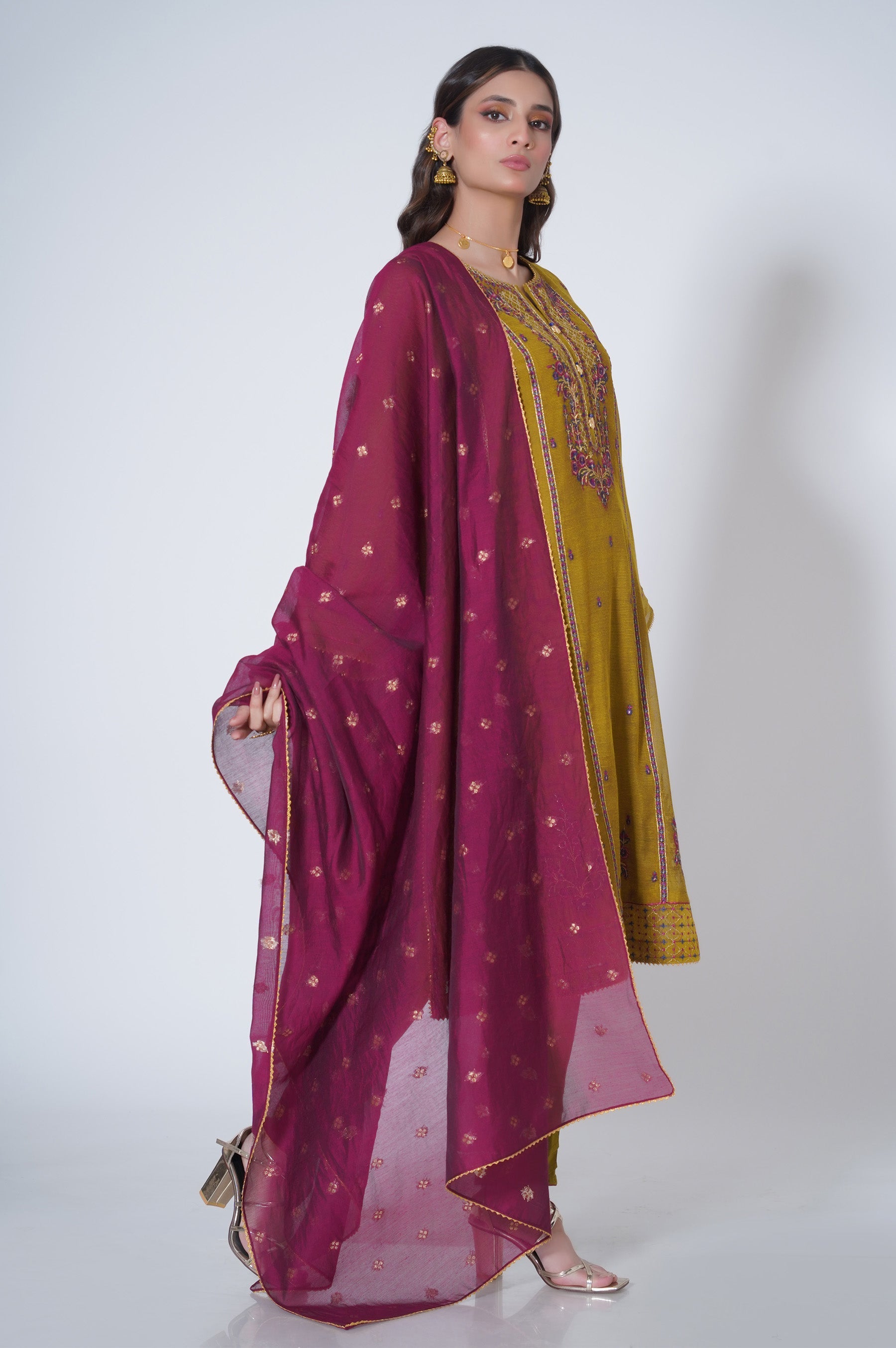 A scintillating composition is layered over this olive ensemble, featuring exquisite embroidery at front and sleeves. Paired with a contrast jacquard dupatta, this khadi net outfit is a pure example of timeless elegance to embrace this festive season. Kurta/Shirt Design:Embroidered