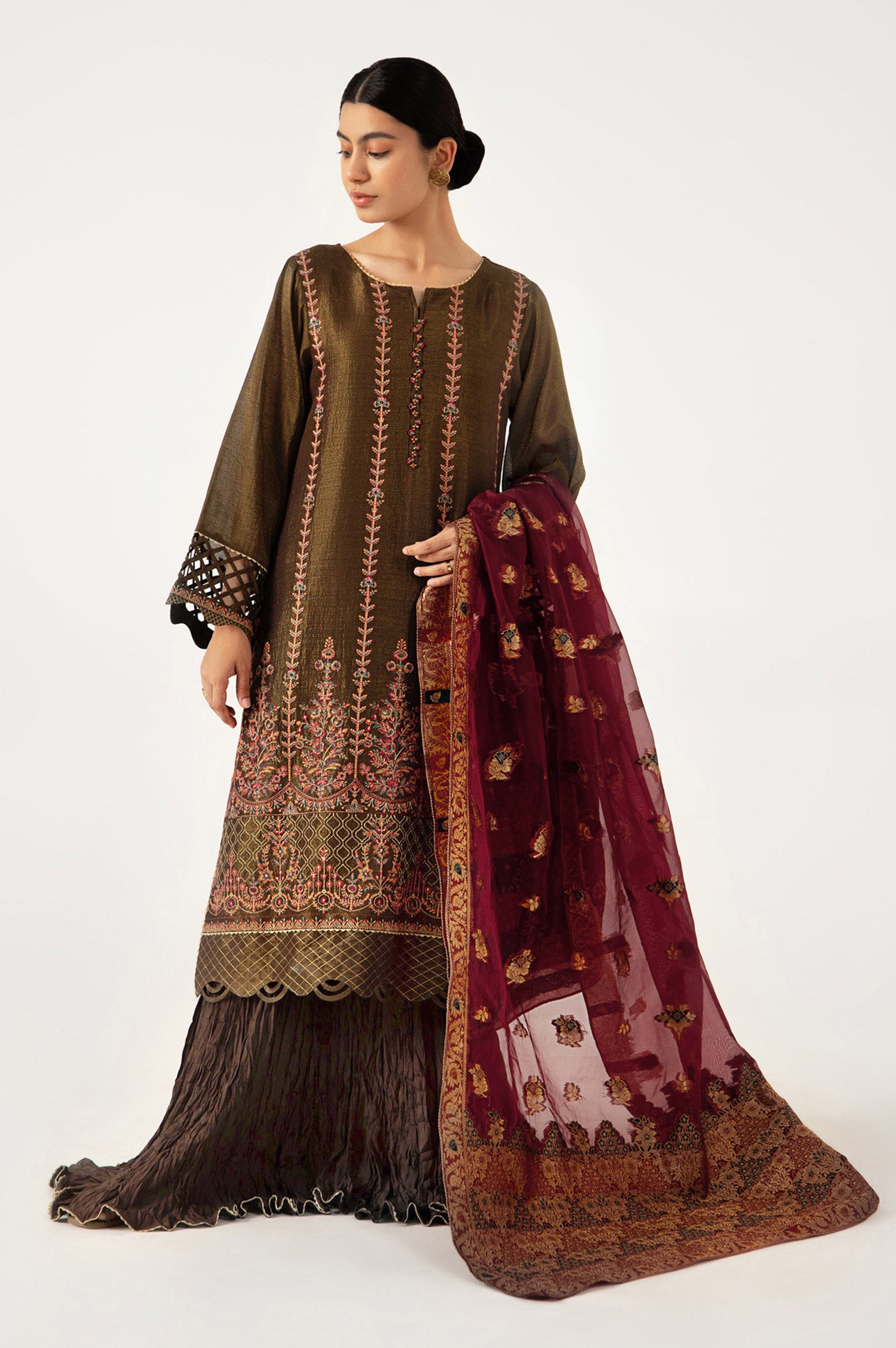 In a luscious copper color, this elegant unstitched mysuri ensemble illustrates rich shirt exquisitely embroidered with captivating floral embroidery in attractive hues. Paired with a deep maroon organza jacquard dupatta, this sumptuous outfit is a breath of fresh air this season.
