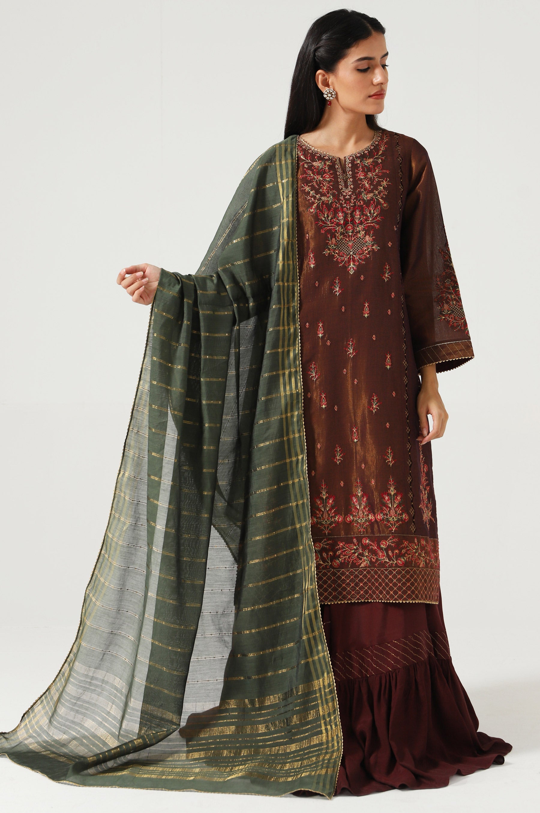 A beautifully embroidered 3pcs unstitched ensemble rendered in shades of Pinks and greens, inspired by chintz. Coordinated with woven gold zari dupatta, creating an altogether aesthetically pleasing style statement.