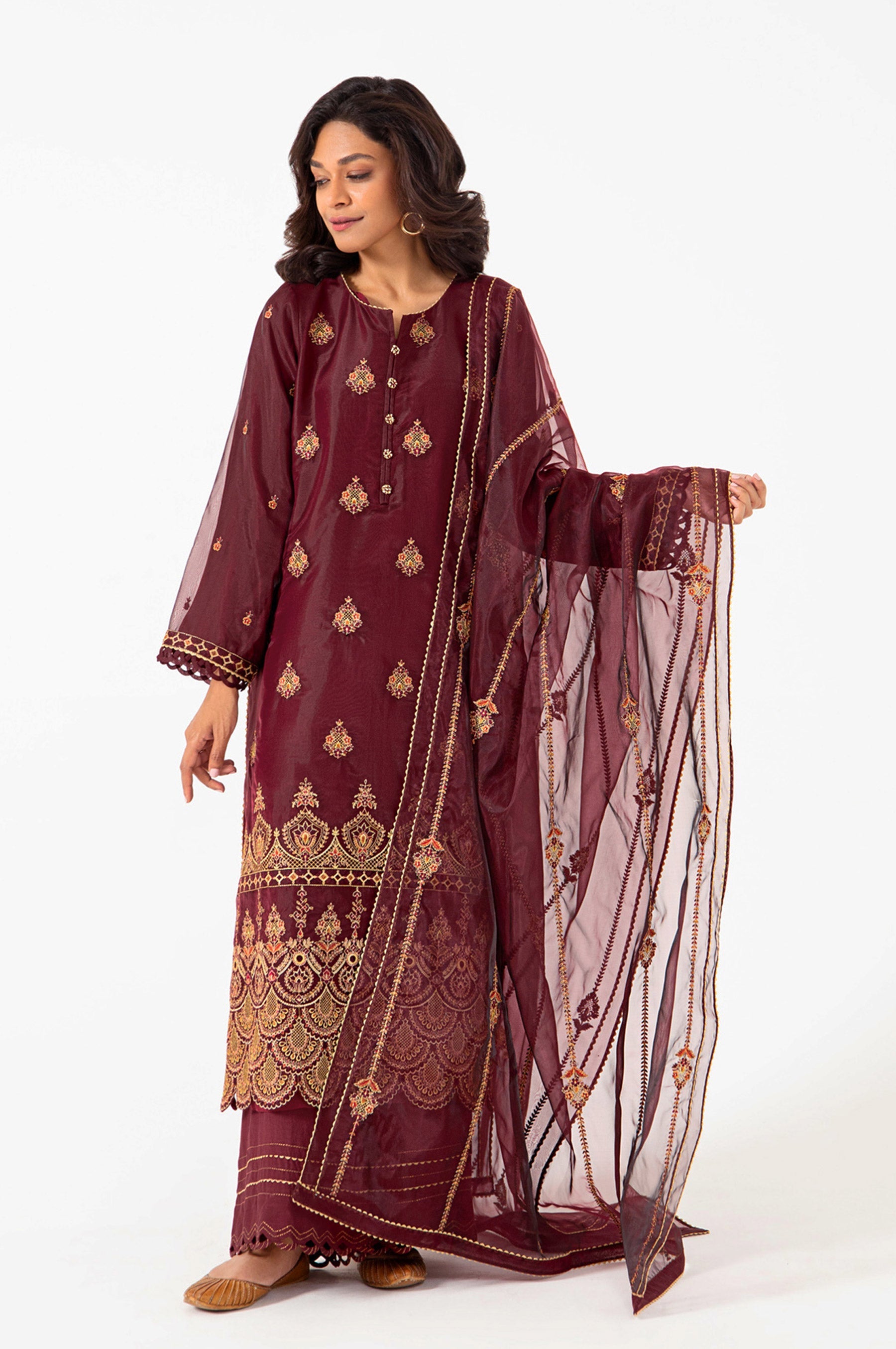 A 3pcs unstitched ensemble enriched with a traditional embroidery on the shirt, paired with embroidered dupatta and raw silk pant will take you to an exhilarating journey of sophistication.