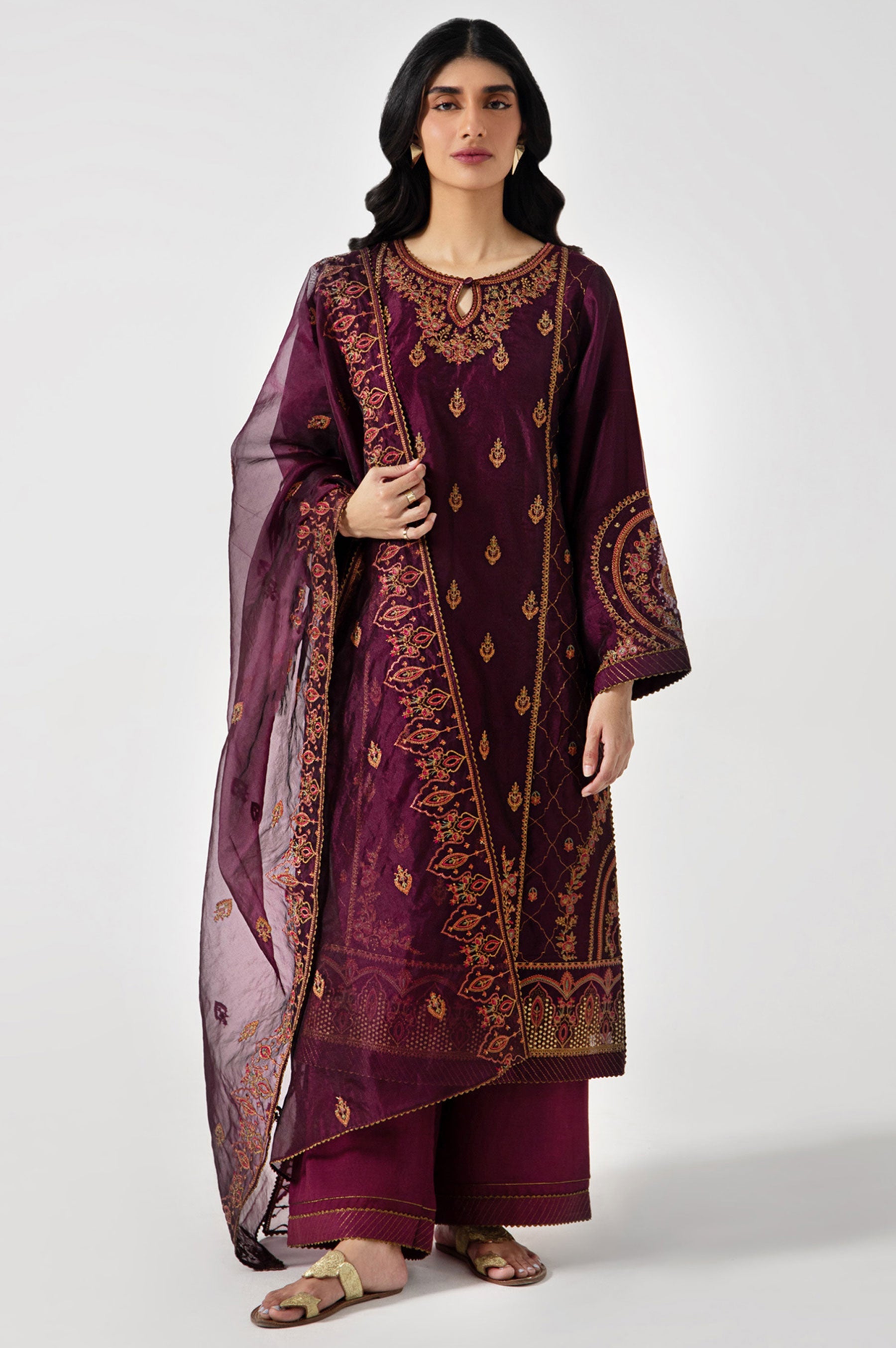 This stunning organza 3pcs bringal purple with traditional dazzling embroidery on neckline and delicate pattern on side panels and oraganza dupatta, is perfect for traditonal style on up coming event.