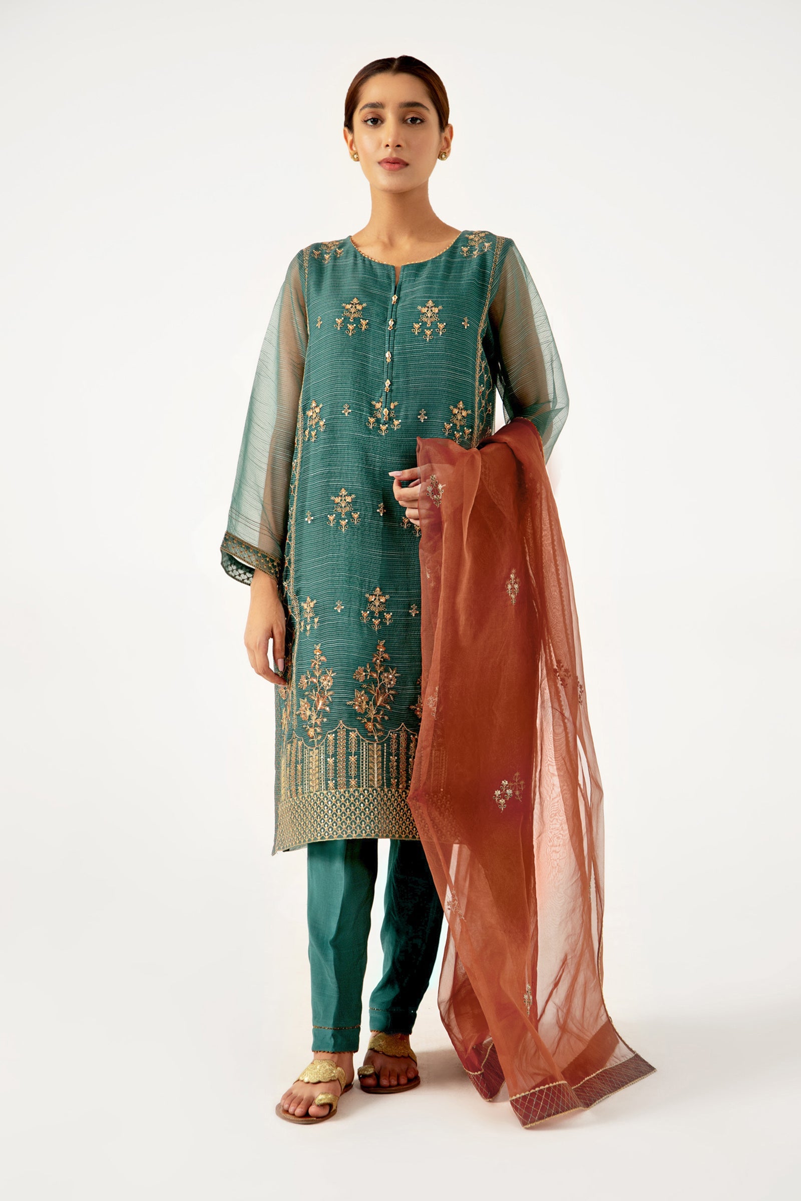 A classically elegant composition is portrayed on this charming aqua textured organza. Enhancing its beauty is the intricate embroidery on shirt and orange embroidered dupatta to shine in the crowd this season.
