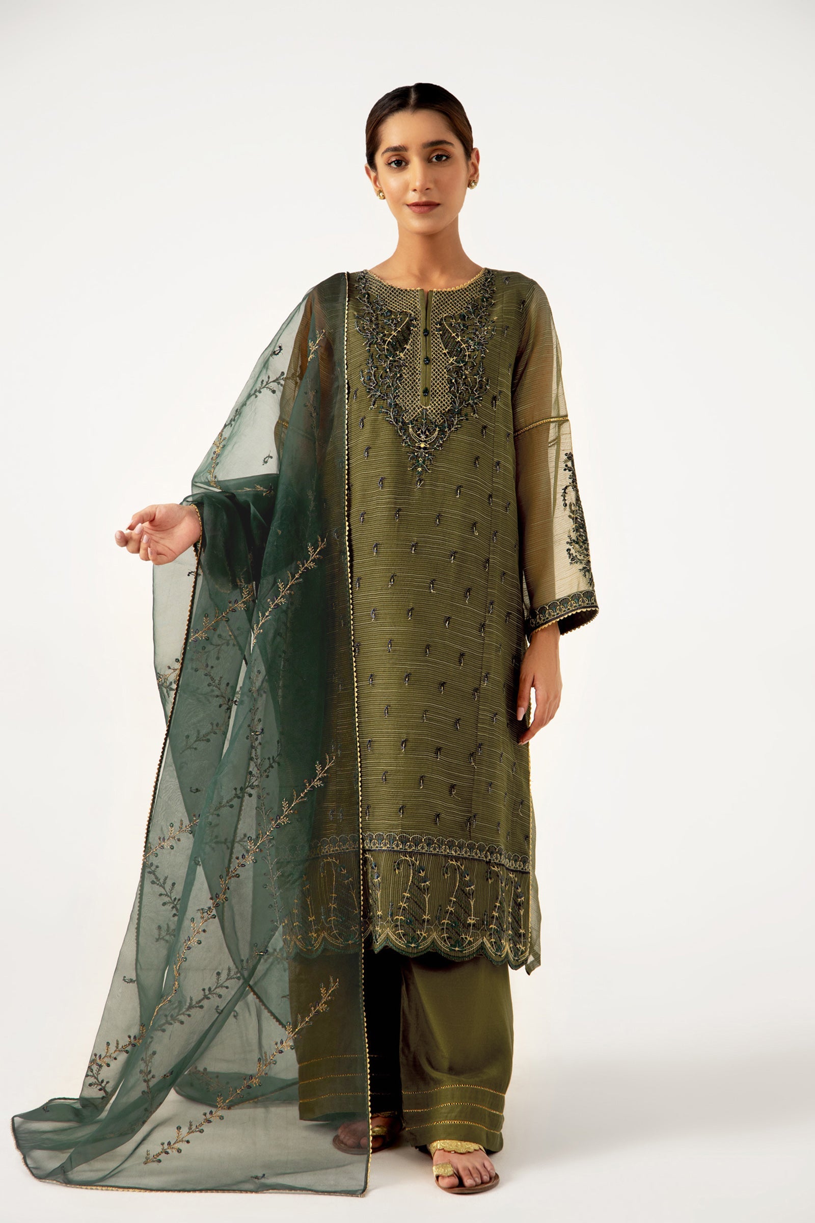 *2.5 Yards Embroidered Organza Dupatta *Embroidered Texture Organza Front * Texture Organza Sleeves * Texture Organza Back *Embroidered Border for Daman And Sleeves *2.5 Yards Rawsilk Bottom *Color: Moss GreenShare