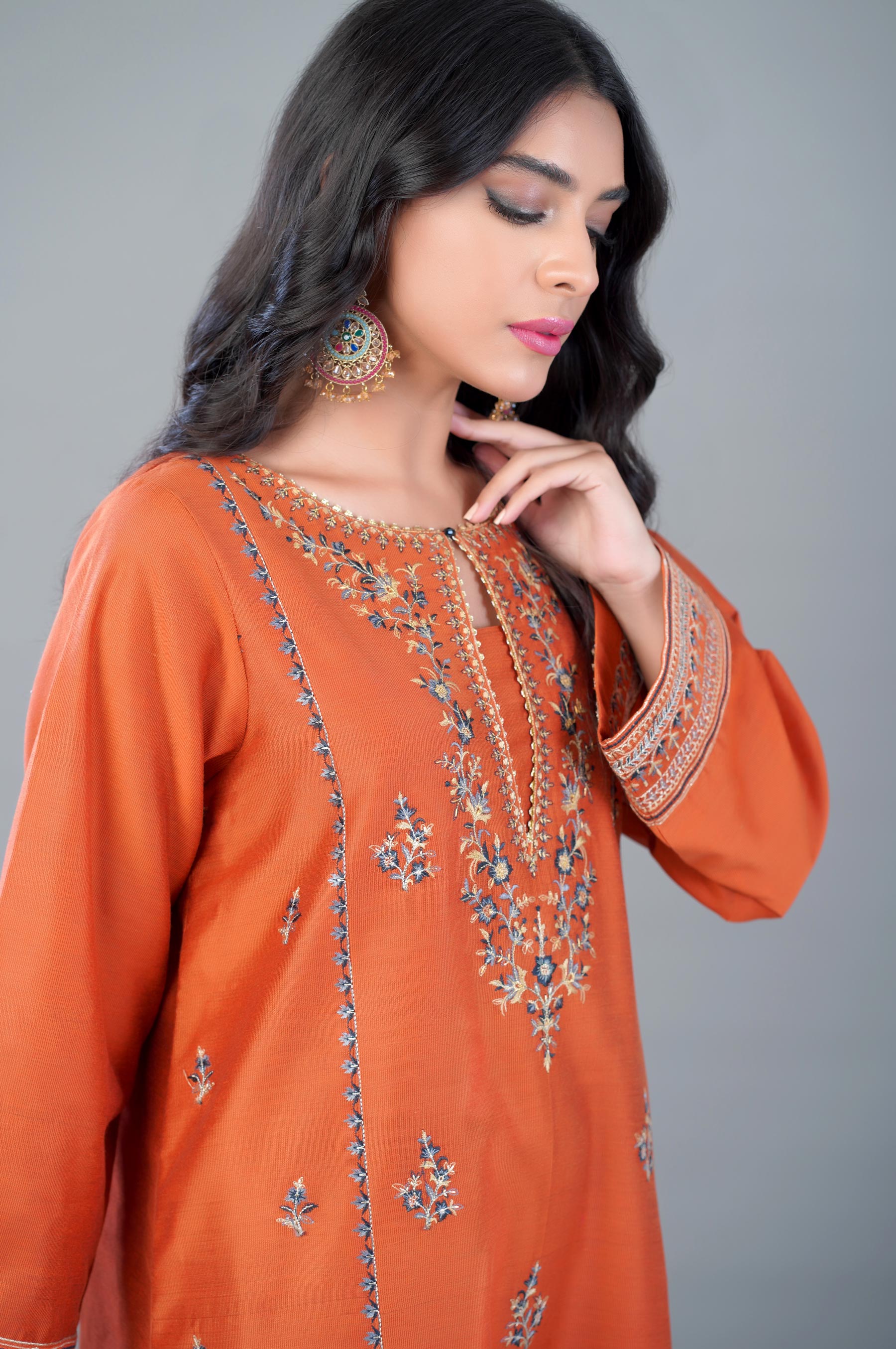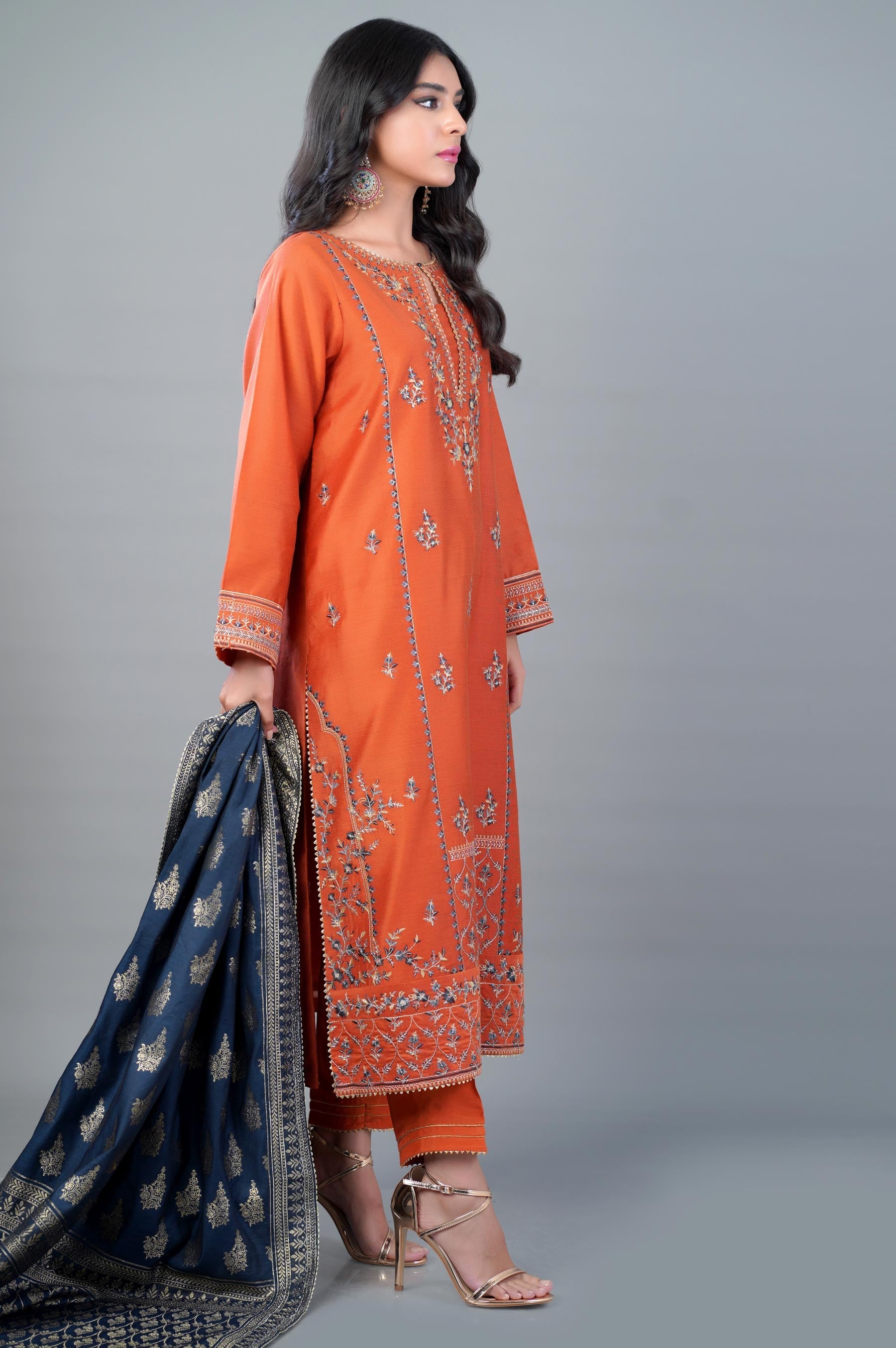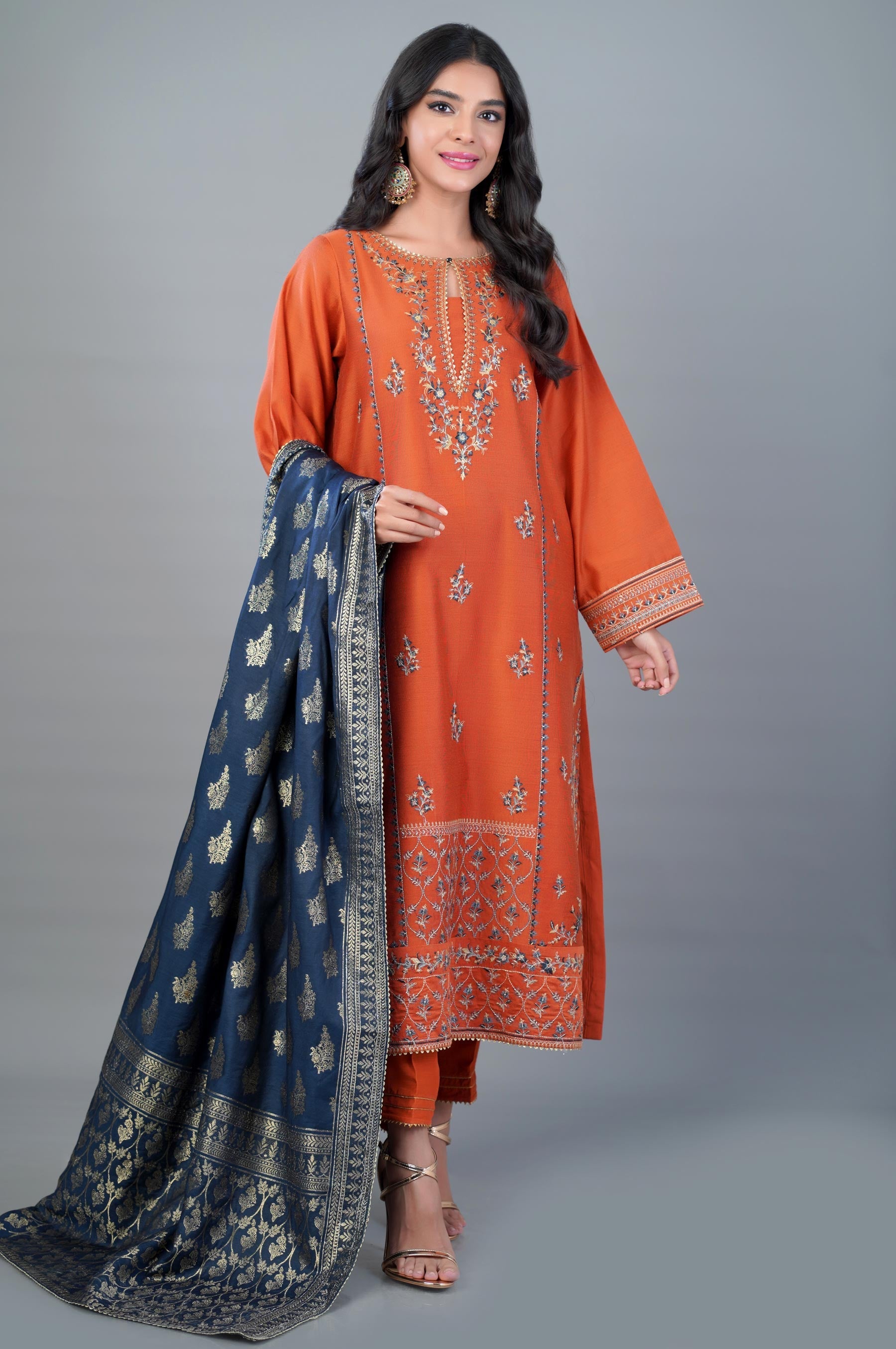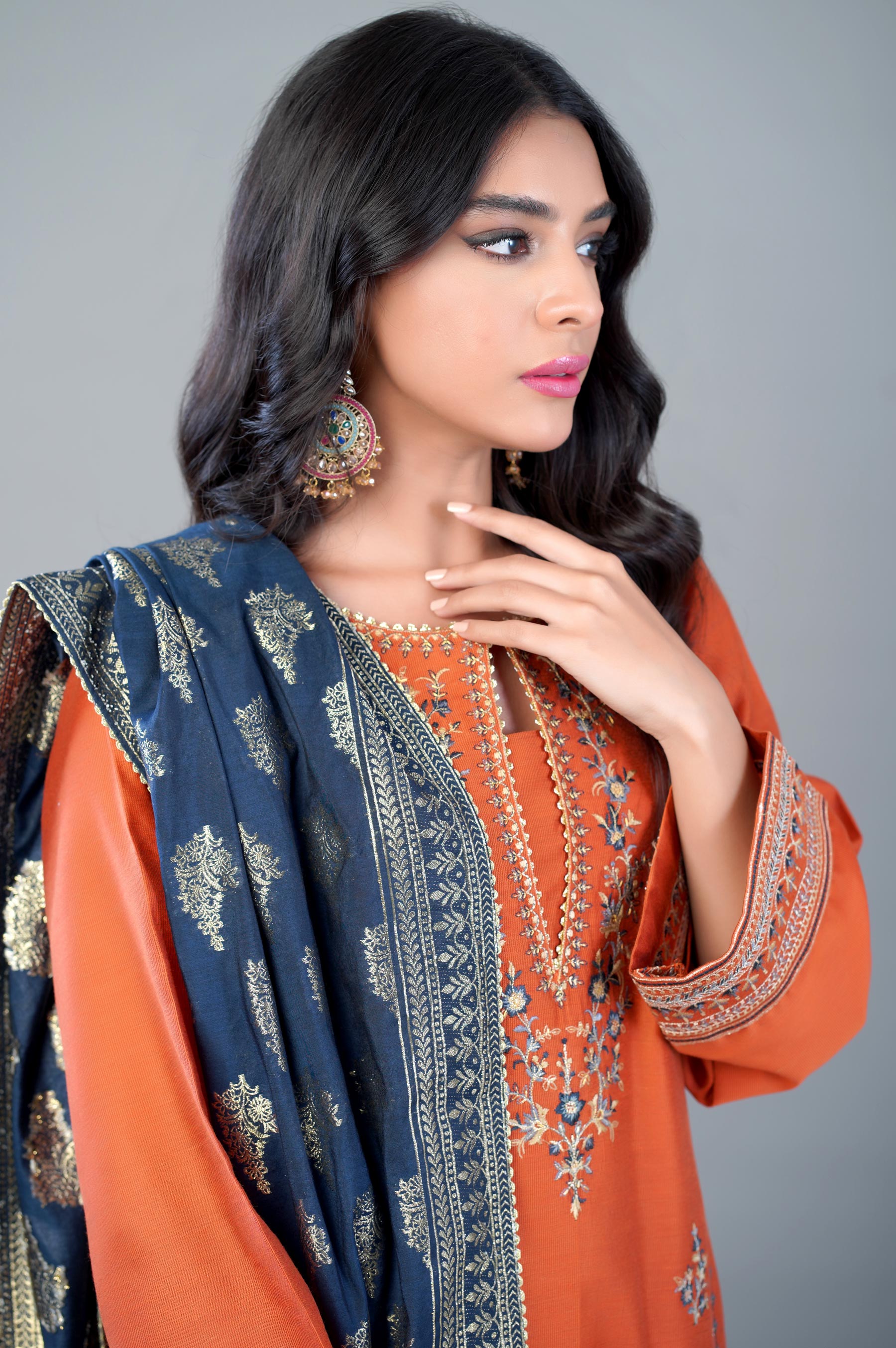 This unstitched three piece cotton net ensemble is rendered in an eye catching combination of orange and blue. Composed of floral embroidery in contrasting colors and zari, this outfit is a perfect pick for formal events. it has a beautiful blue banarsi jacquard dupatta and matching raw silk pants.