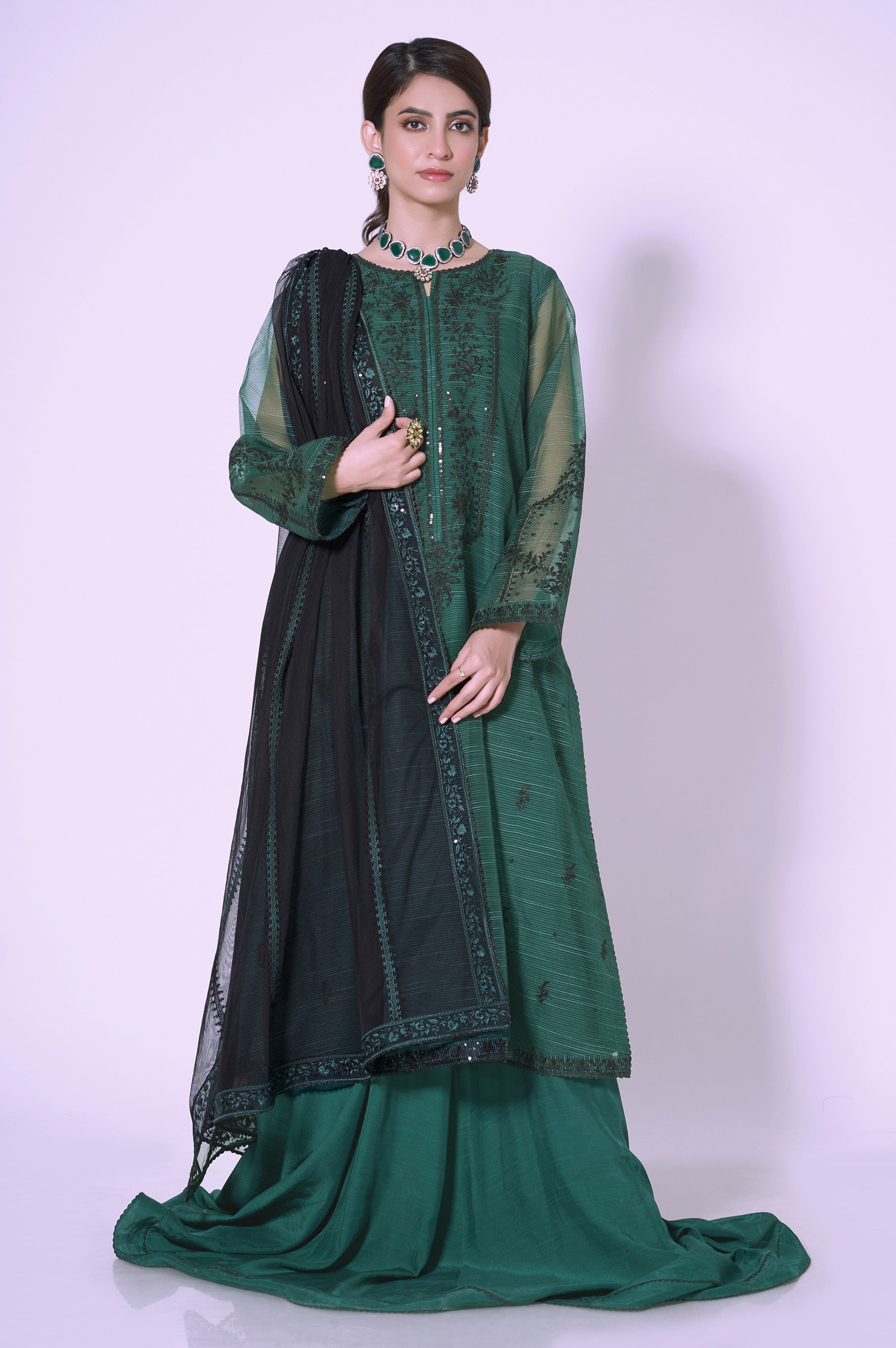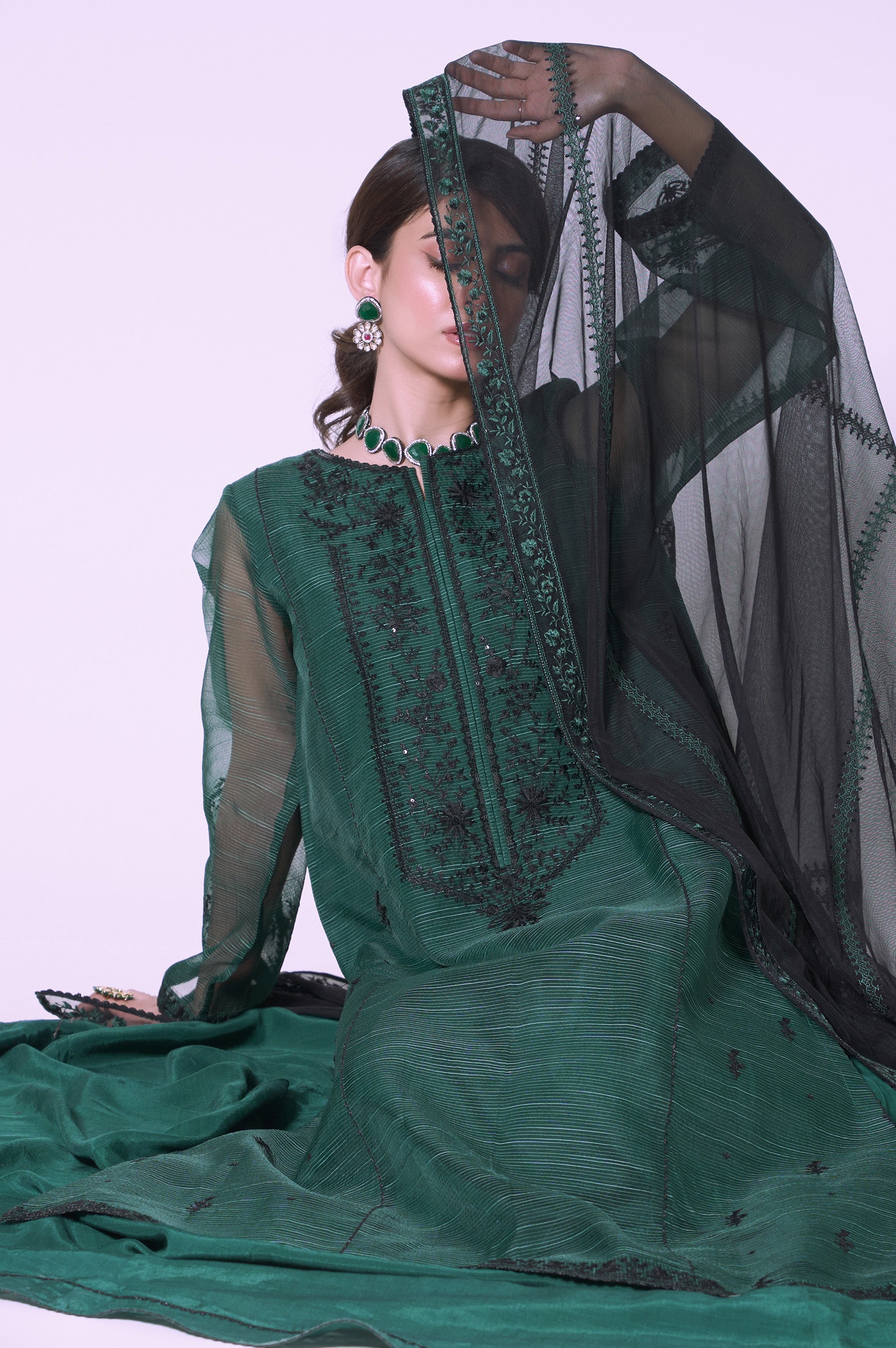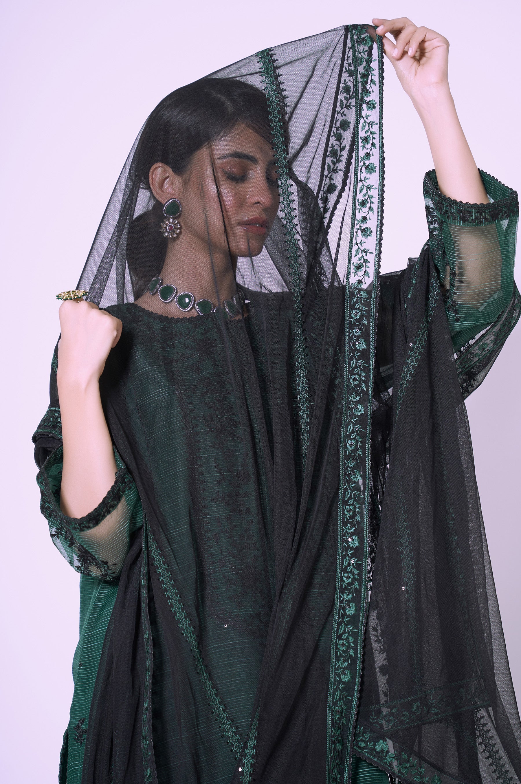 A Valiant Green hue serves as the canvas for Teal Green. blend of Black Ornamental and floral embroideries are laid out black sequins with black thread is beautifully enhancing the Design. Accompanied by a black polynet dupatta with four side Border and delicate embroidery. This Regal ensemble is for ZEEN woman who is not afraid to command attention.